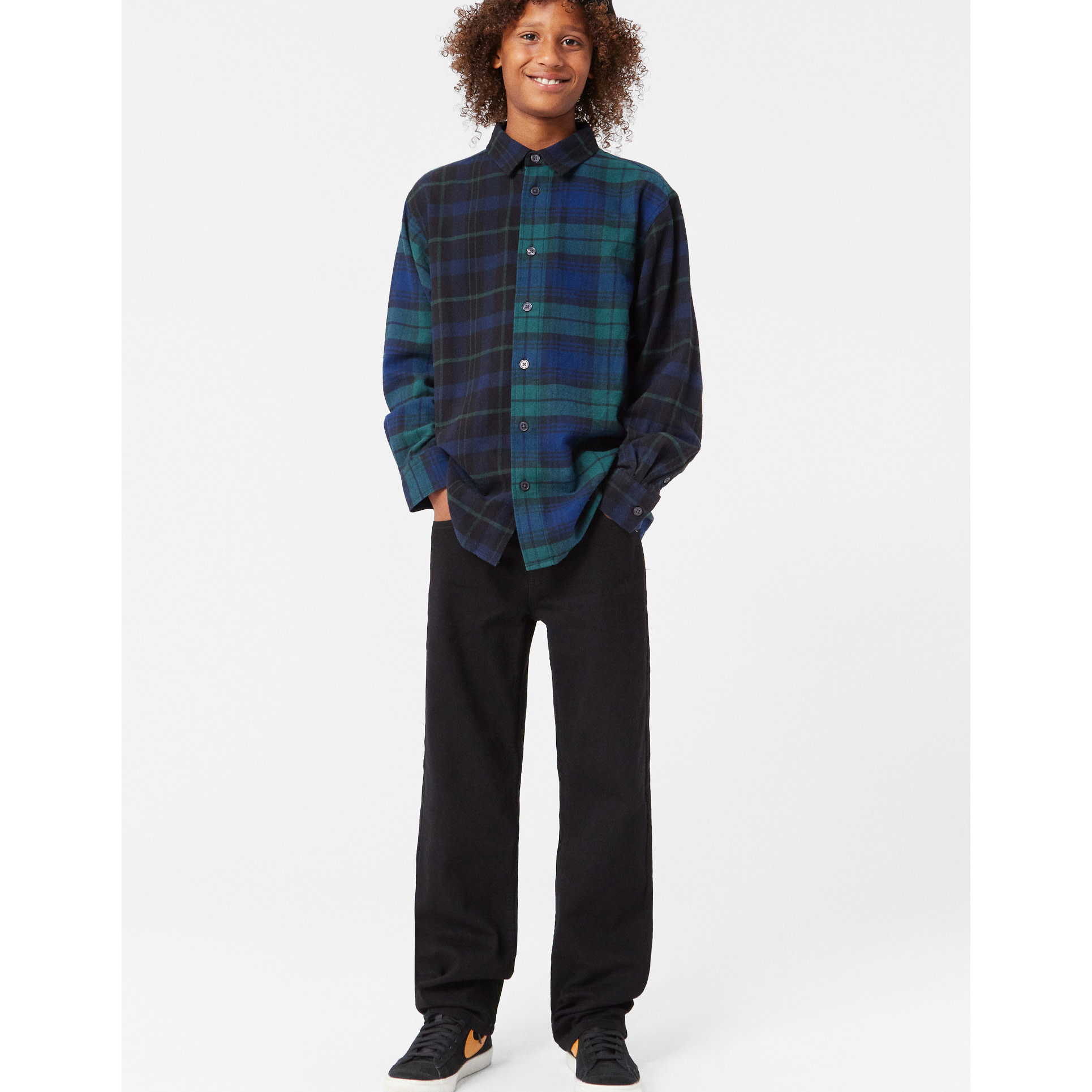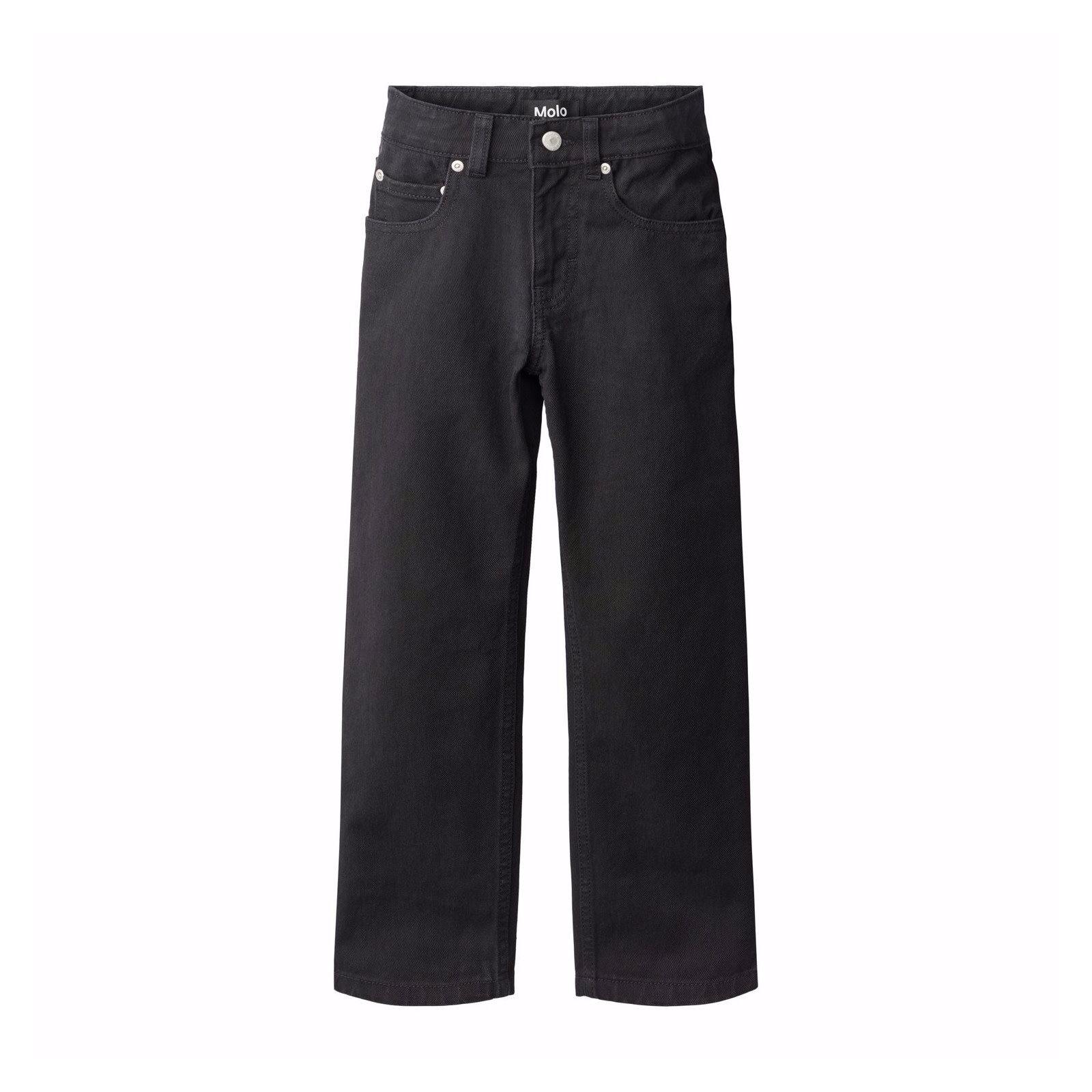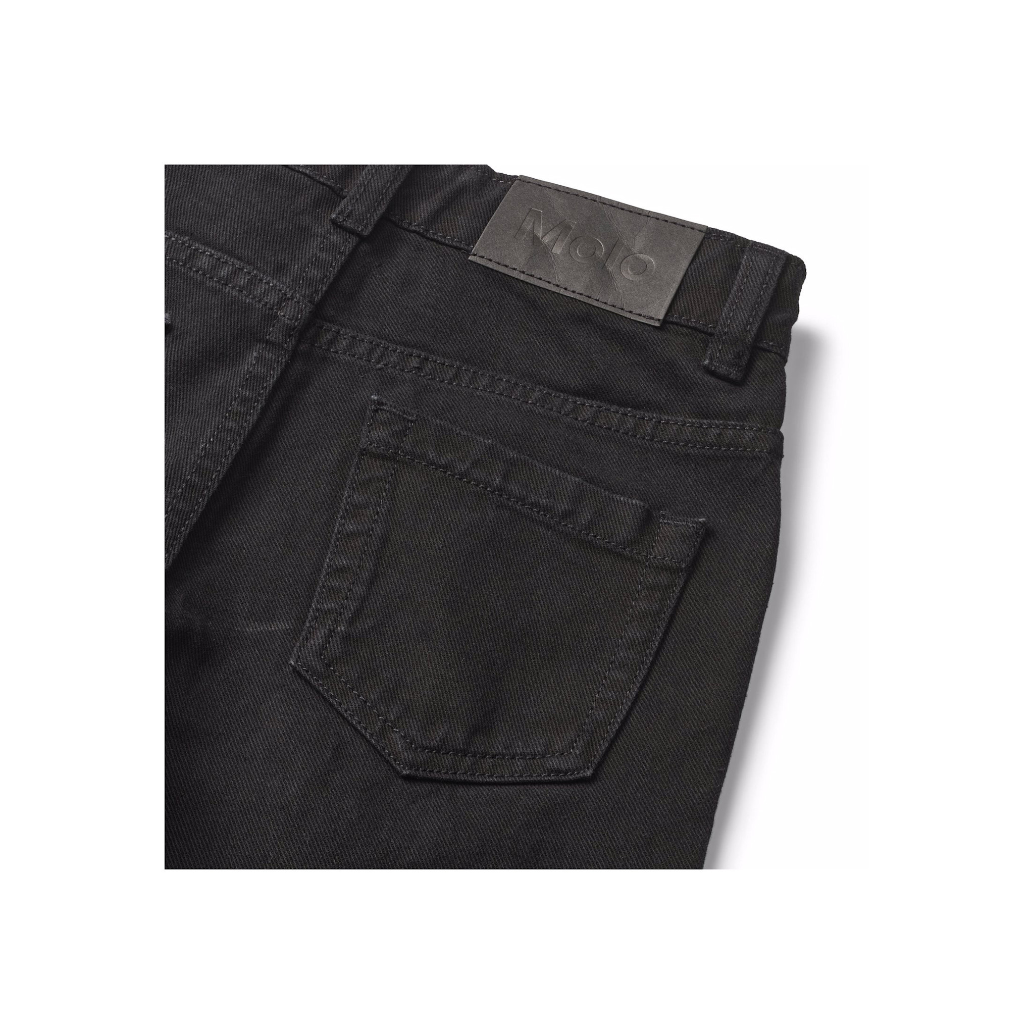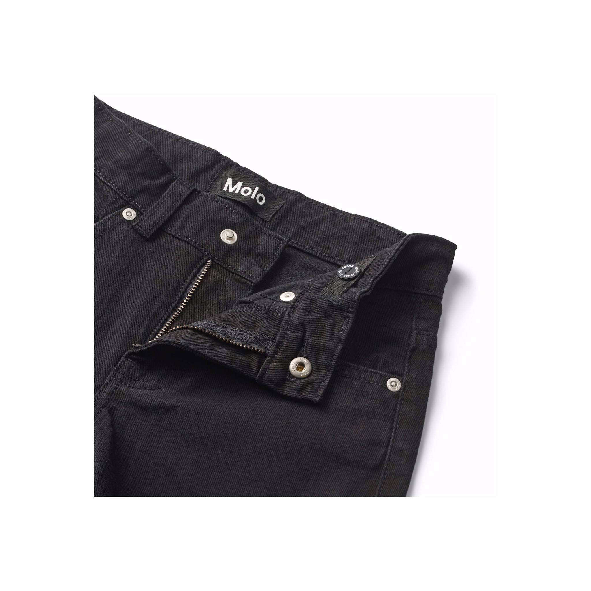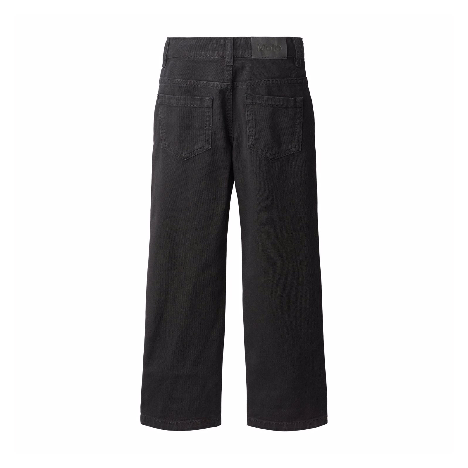 Black organic cotton jeans with straight legs, side pockets, back pockets, and a regular fit.