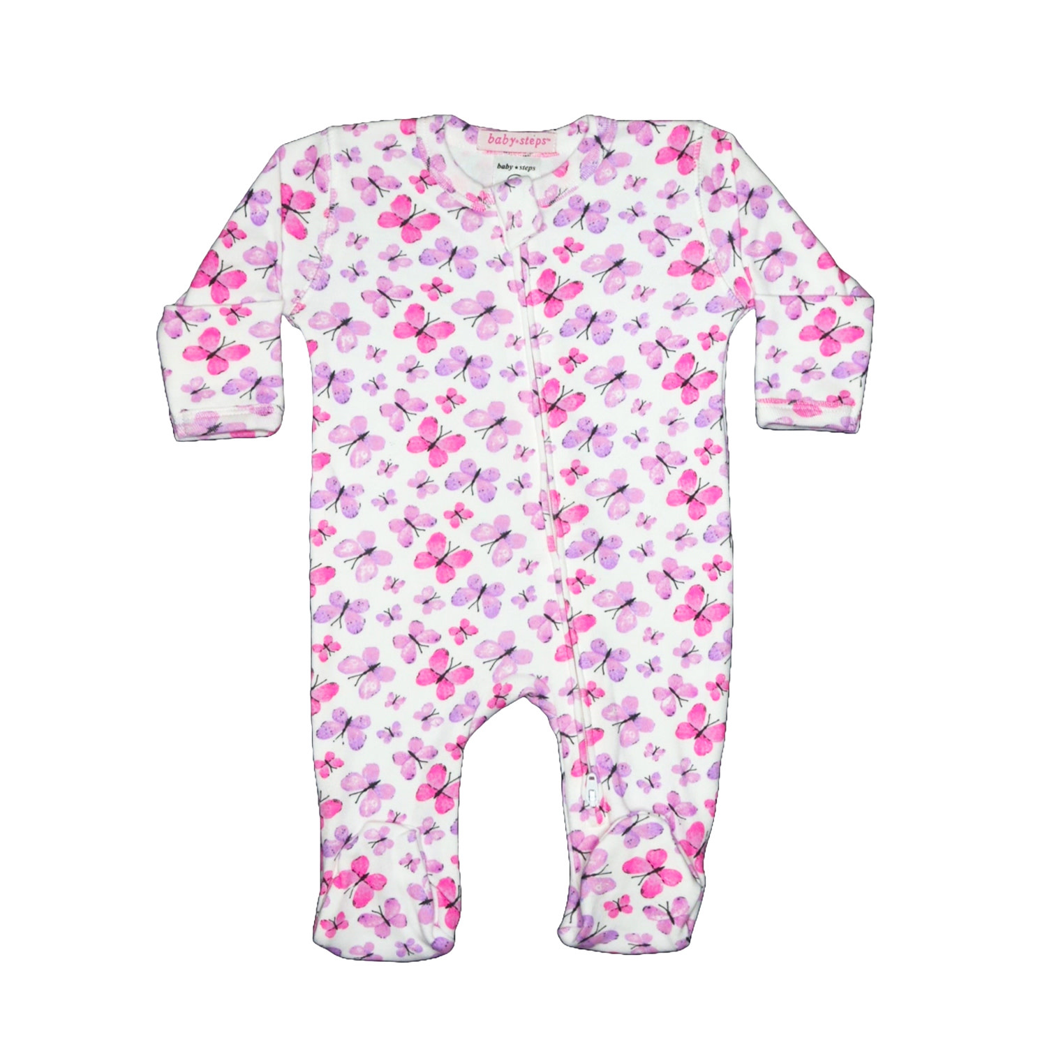 Baby Steps two way zippered footie in Butterflies print. 100% Cotton.