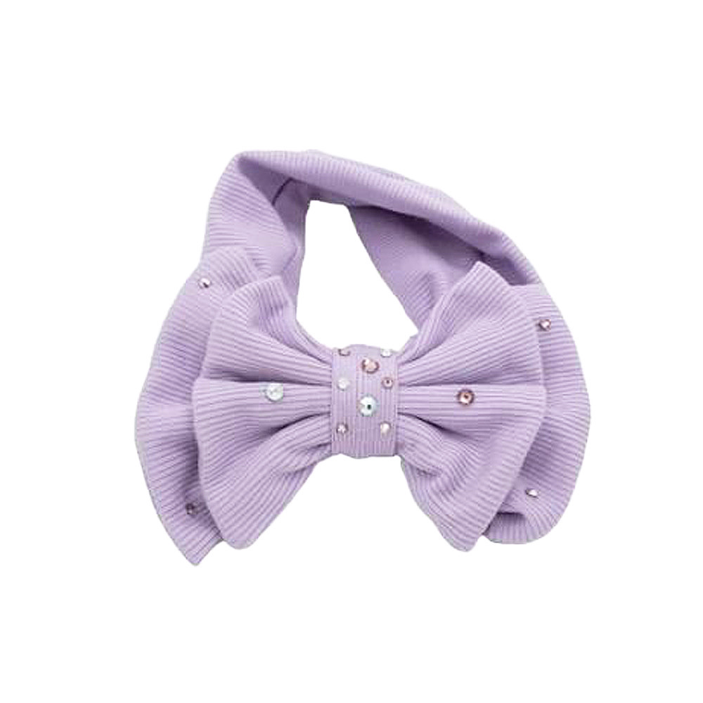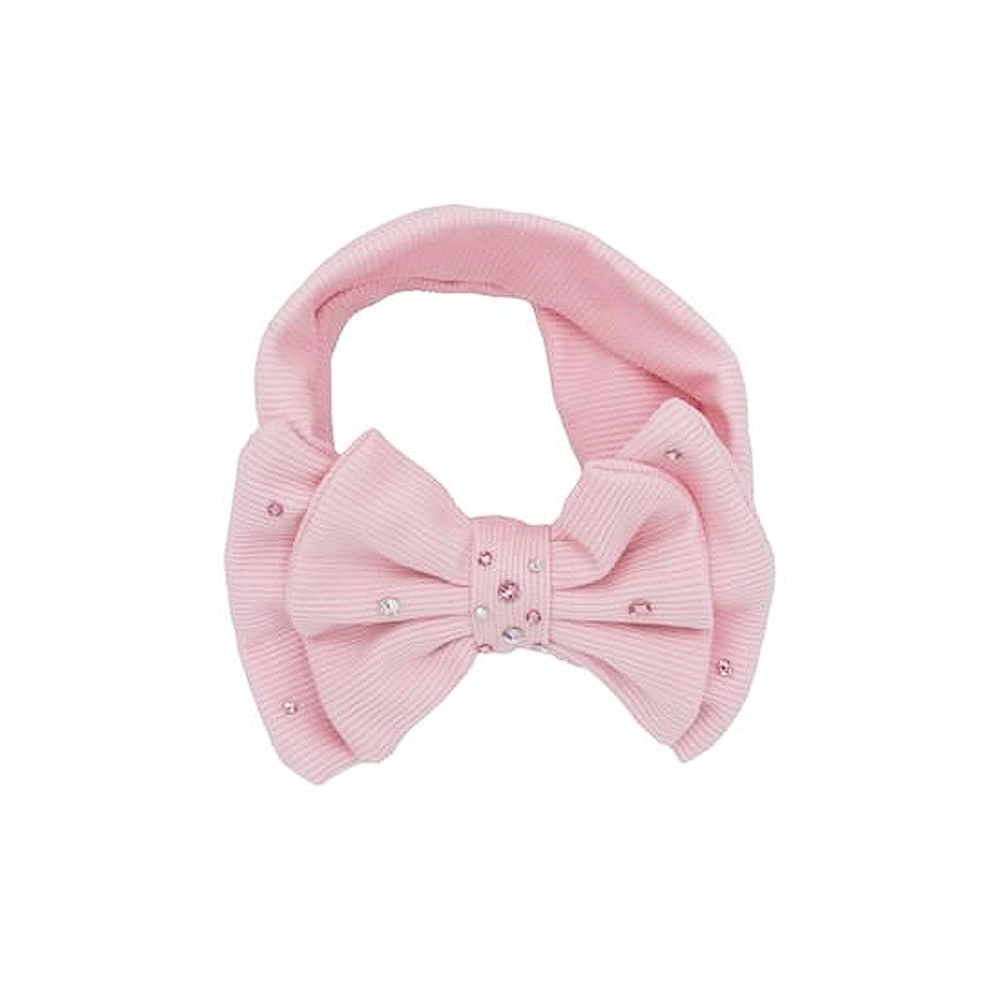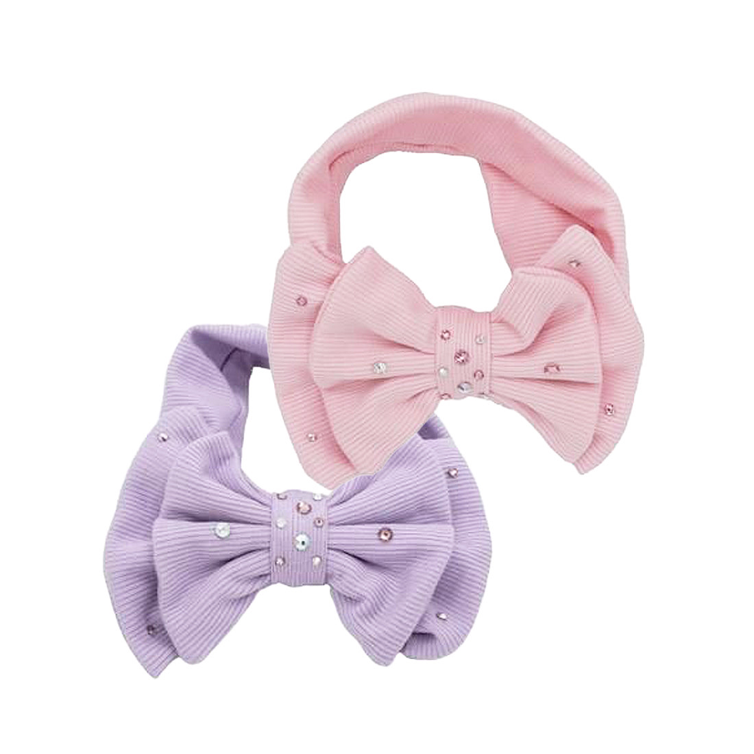 Bari Lynn baby ribbed cotton elastic headband adorned with a large rhinestoned bow. Made in USA.