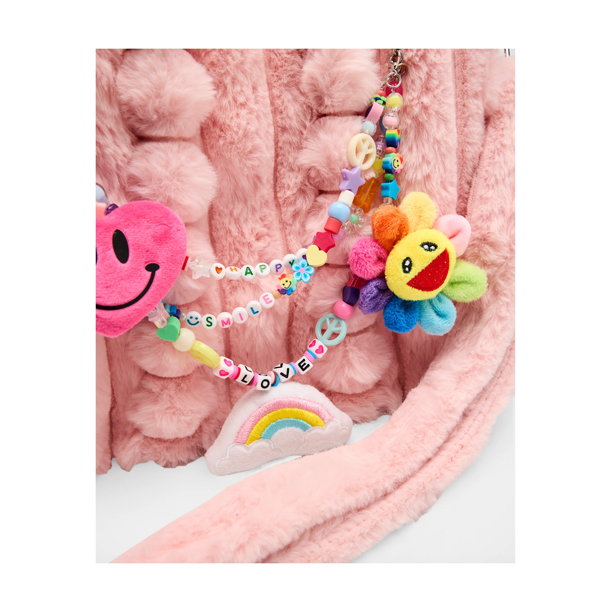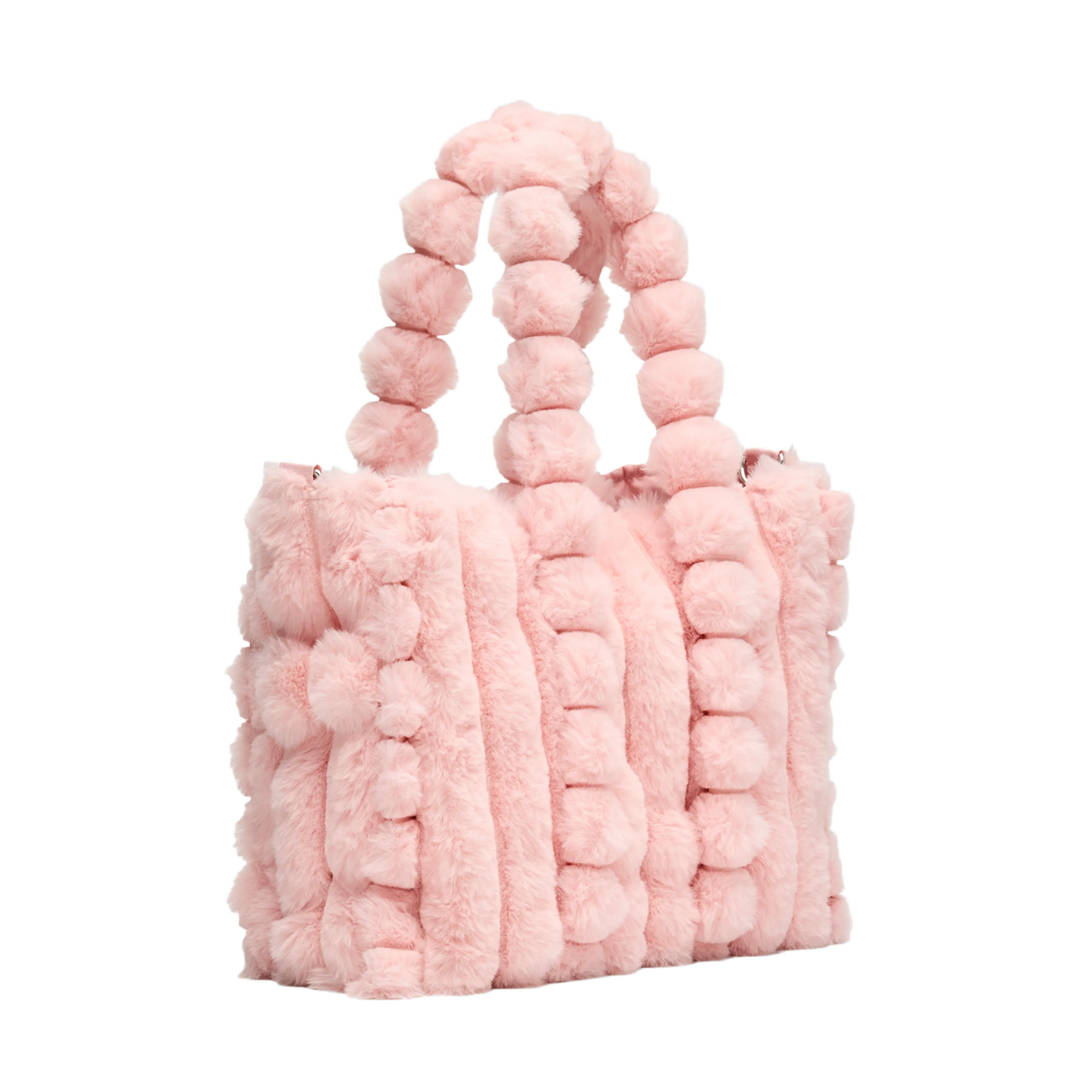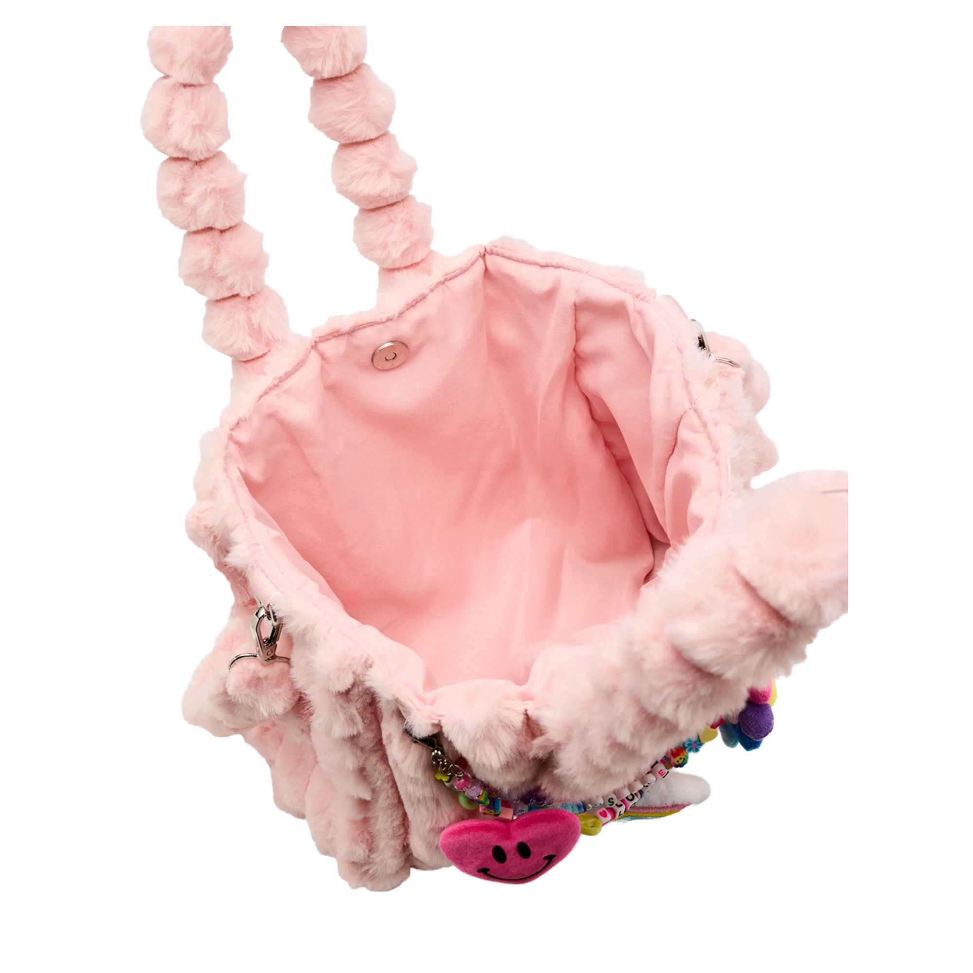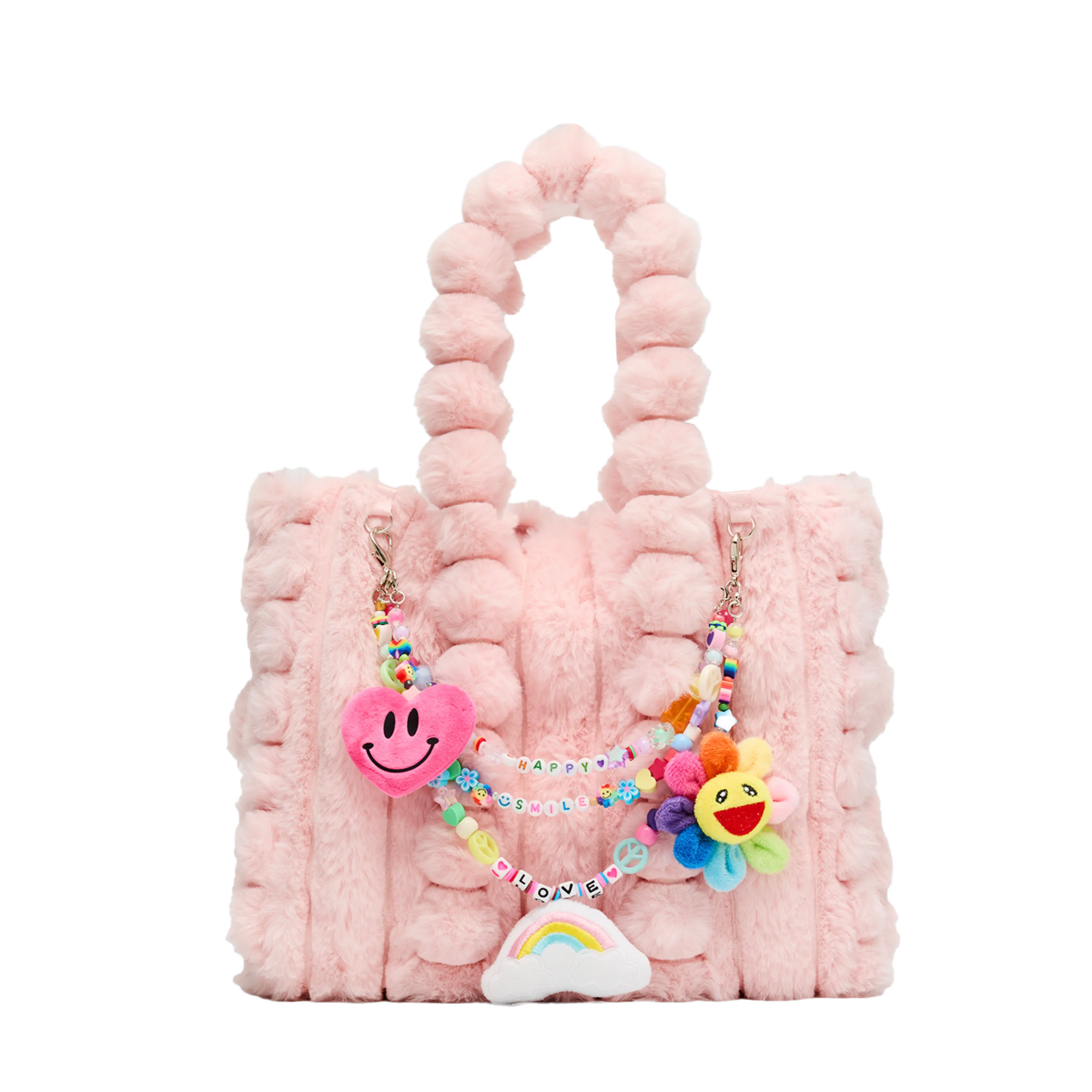 Bari Lynn adorable soft fluffy faux fur tote in pink , is adorned with beaded chains and plush novelty charms. Features: Dual top handles, Magnetic top closure, Exterior, detachable keychains, Interior, one main compartment.