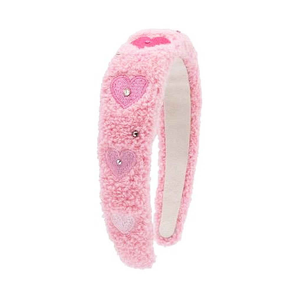 Bari Lynn pink sherpa headband adorned with rhinestones and embroidered hearts. Made in USA.