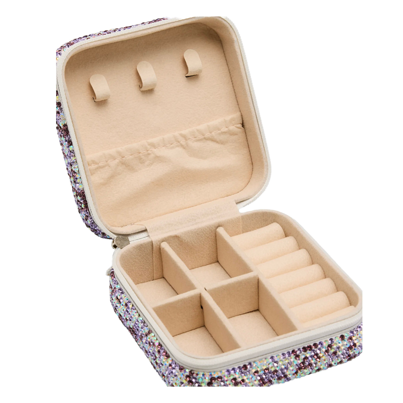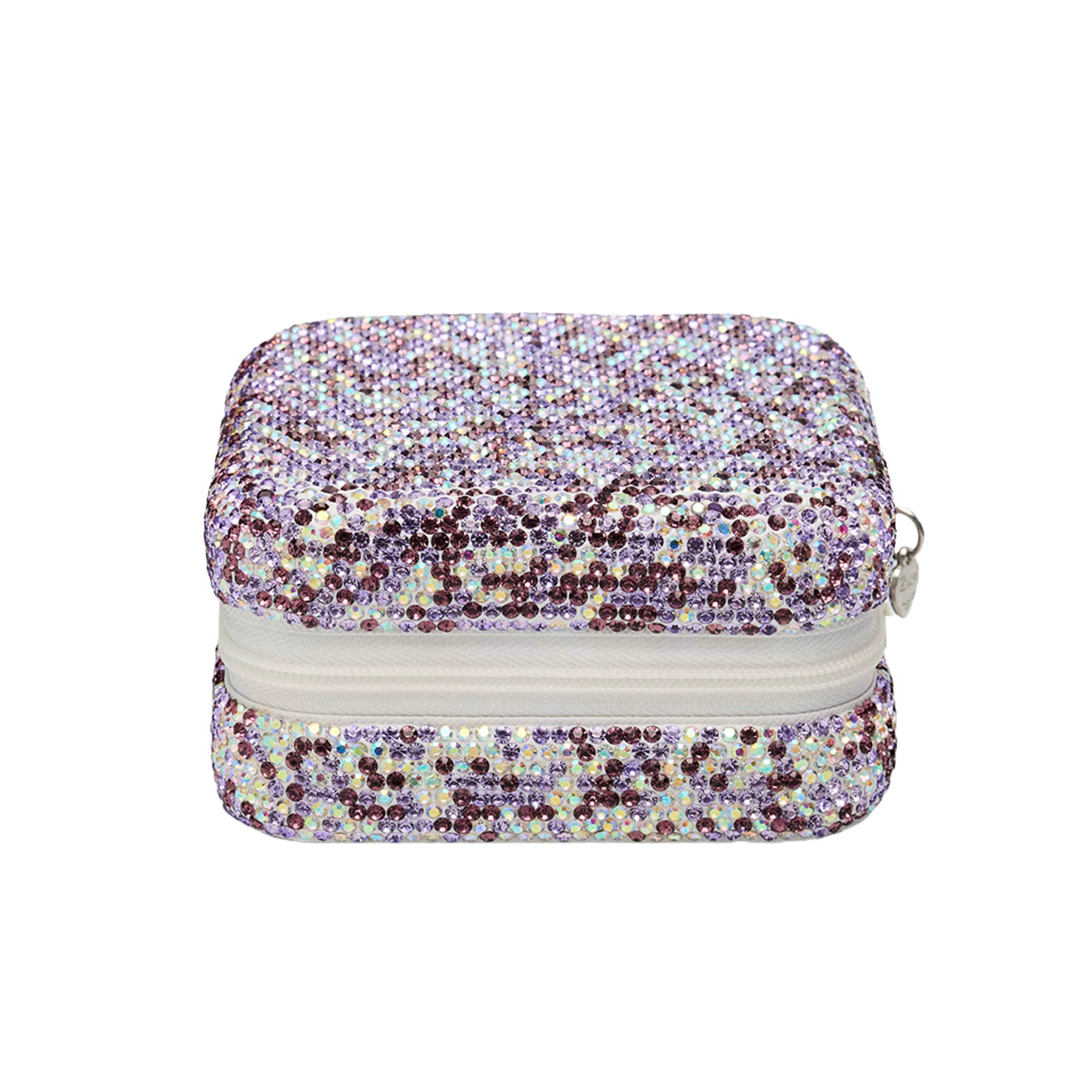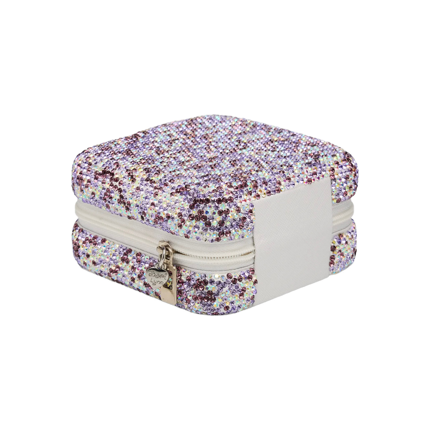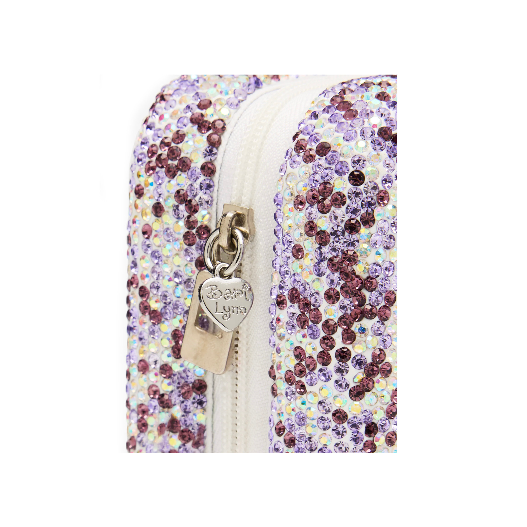 Bari Lynn glamorous jewelry box adorned with purple rhinestones. 3 hooks and one slip pocket. 4 small compartments and 6 ring/earring bars. Zip-around closure. Measures: 4 x 4 x 2 inches.