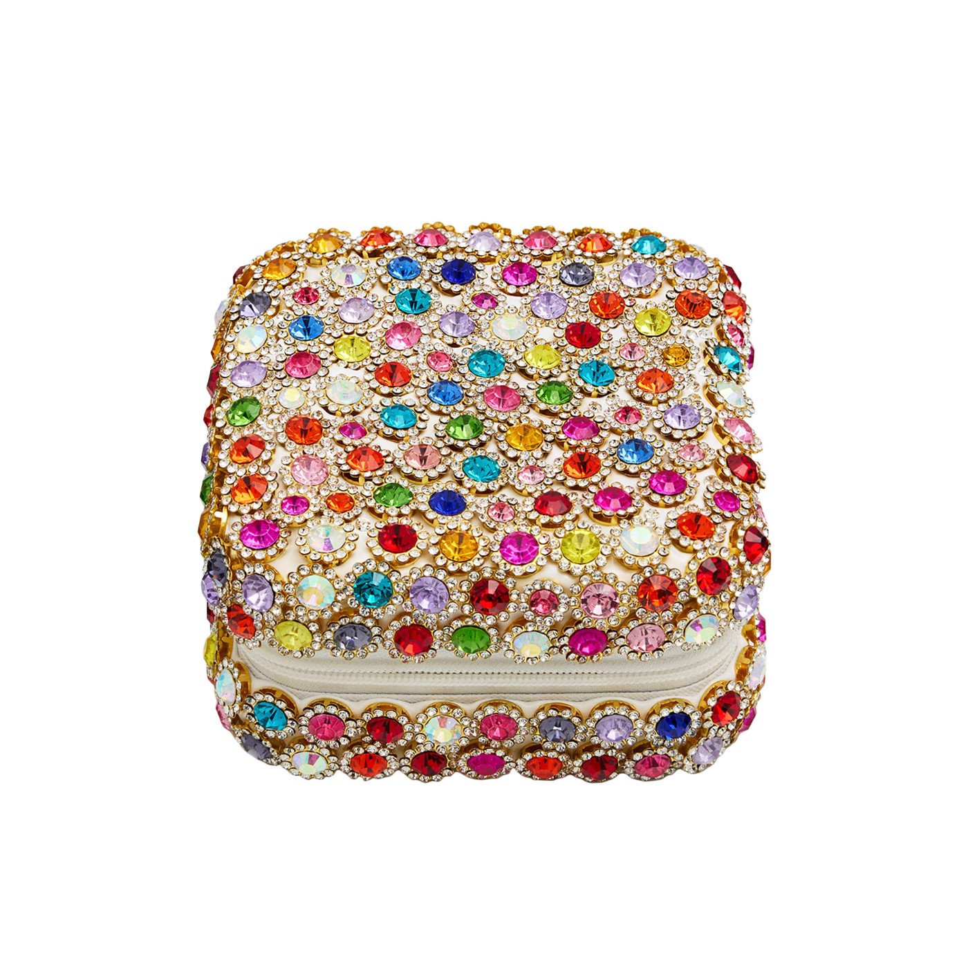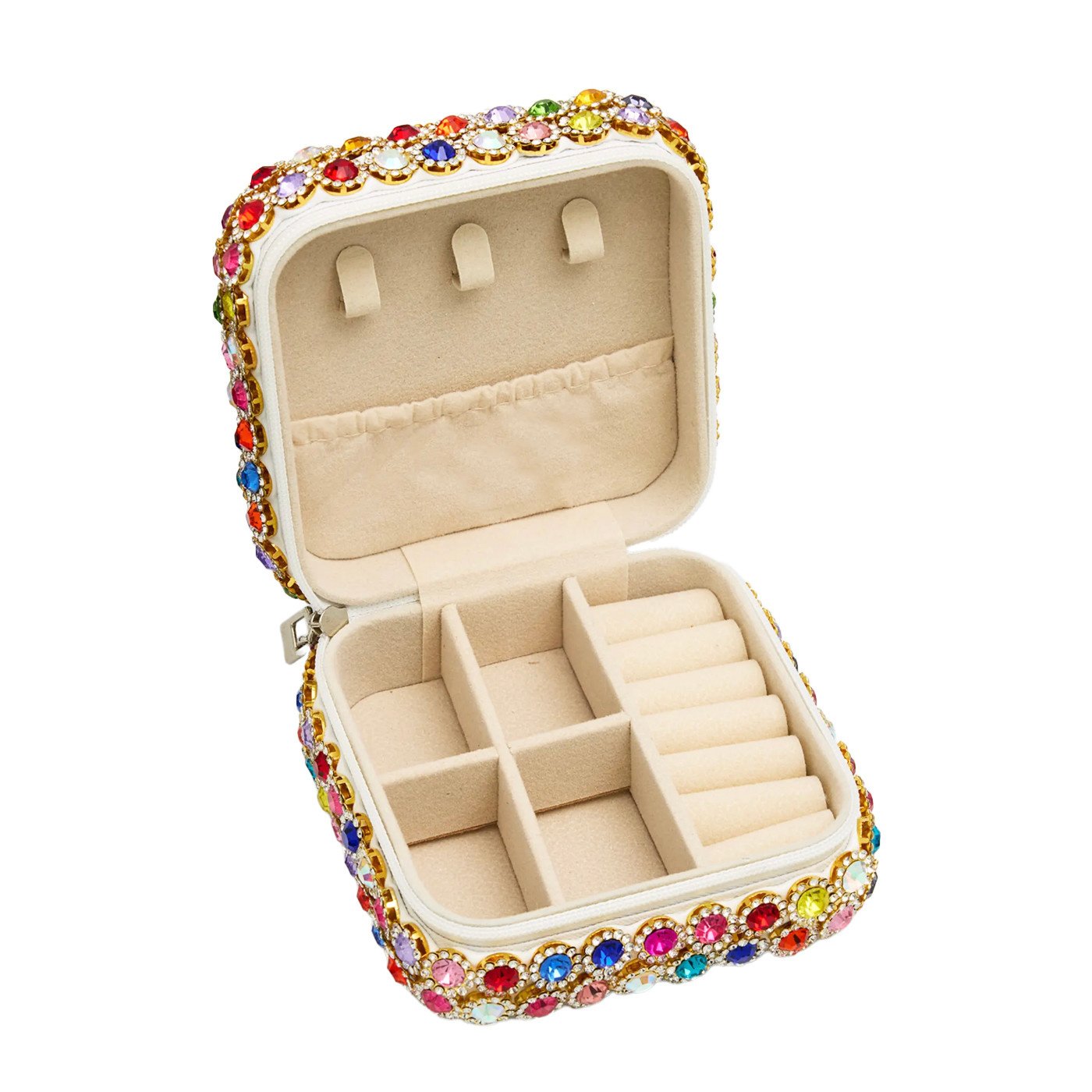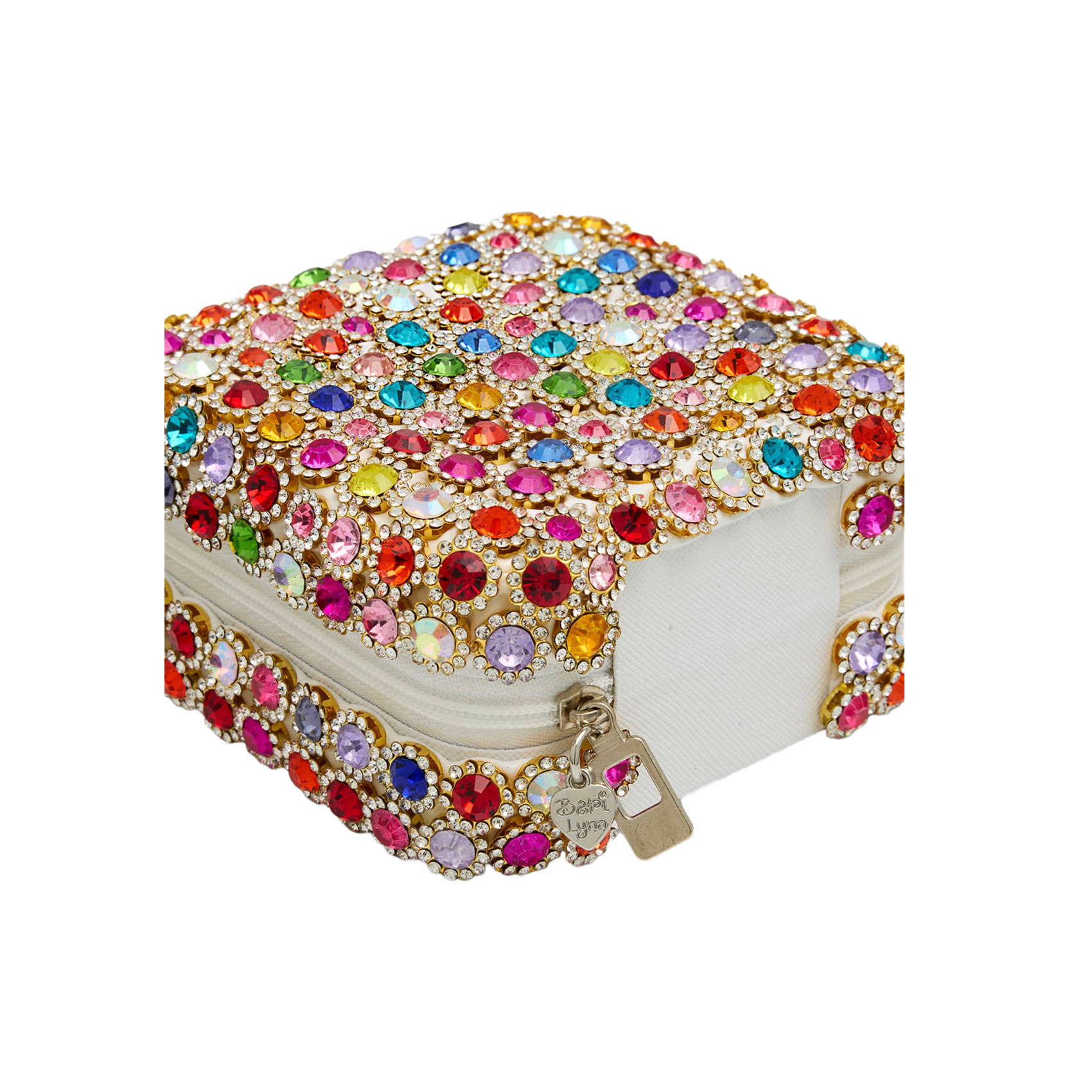 Bari Lynn glamorous jewelry box adorned with rainbow crystals. 3 hooks and one slip pocket. 4 small compartments and 6 ring/earring bars. Zip-around closure. Measures: 4 x 4 x 2 inches.