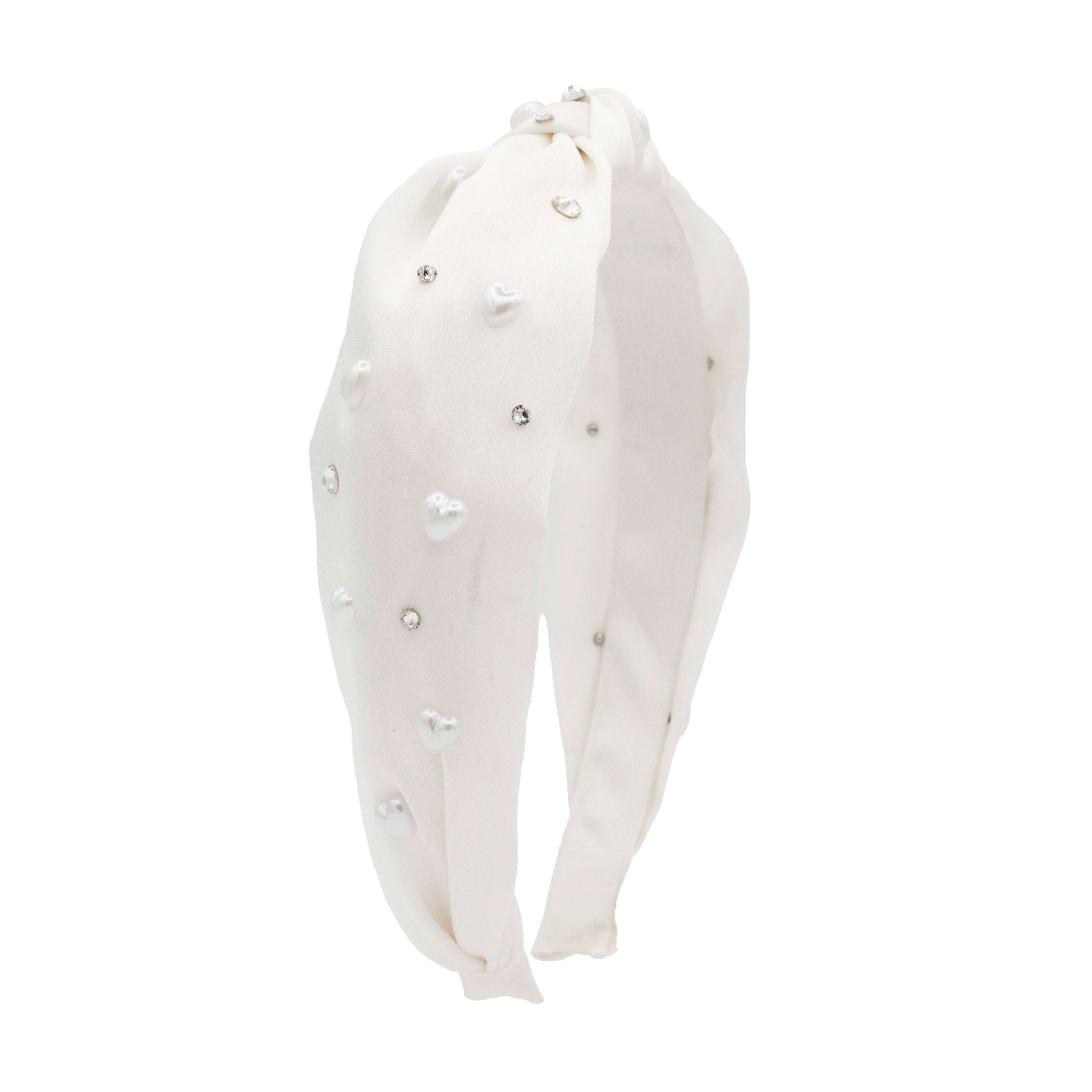 Bari Lynn's white satin knotted headband features pearl hearts and crystal embellishments.