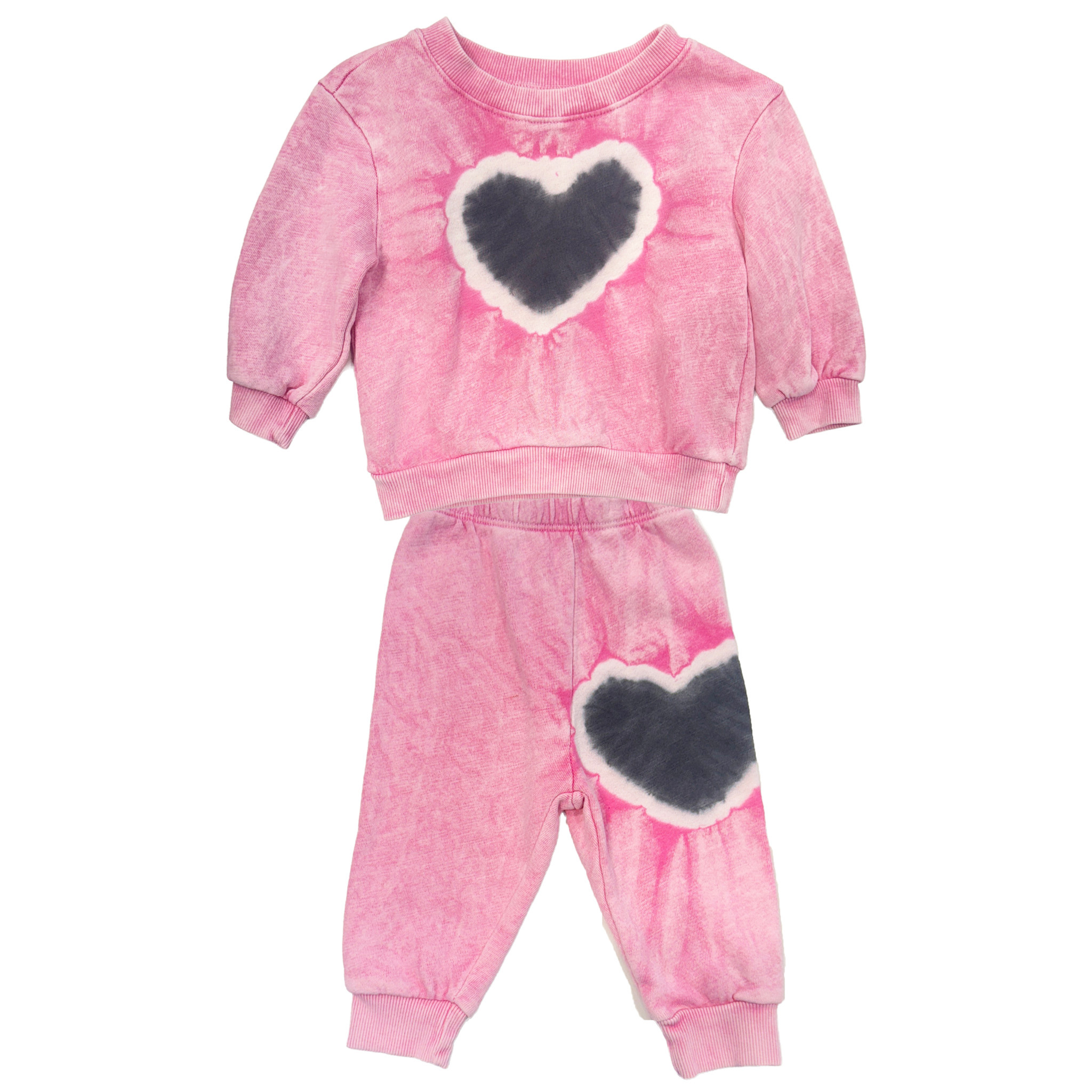 Californian Vintage Baby Girls pink pullover sweatshirt and pant set in black heart print. Soft fabric and relaxed fit. 100% Cotton. Made in Los Angeles California.