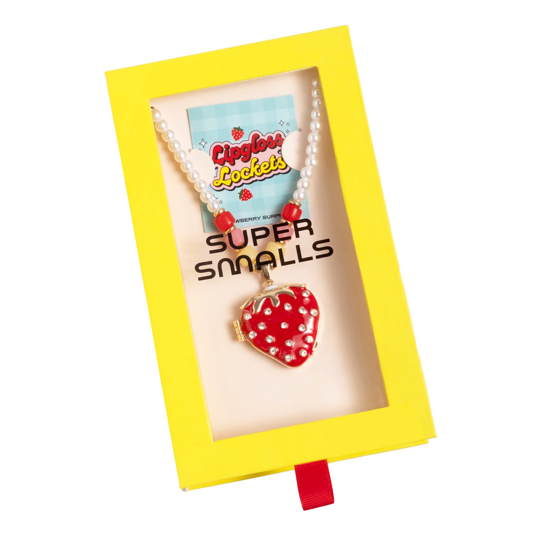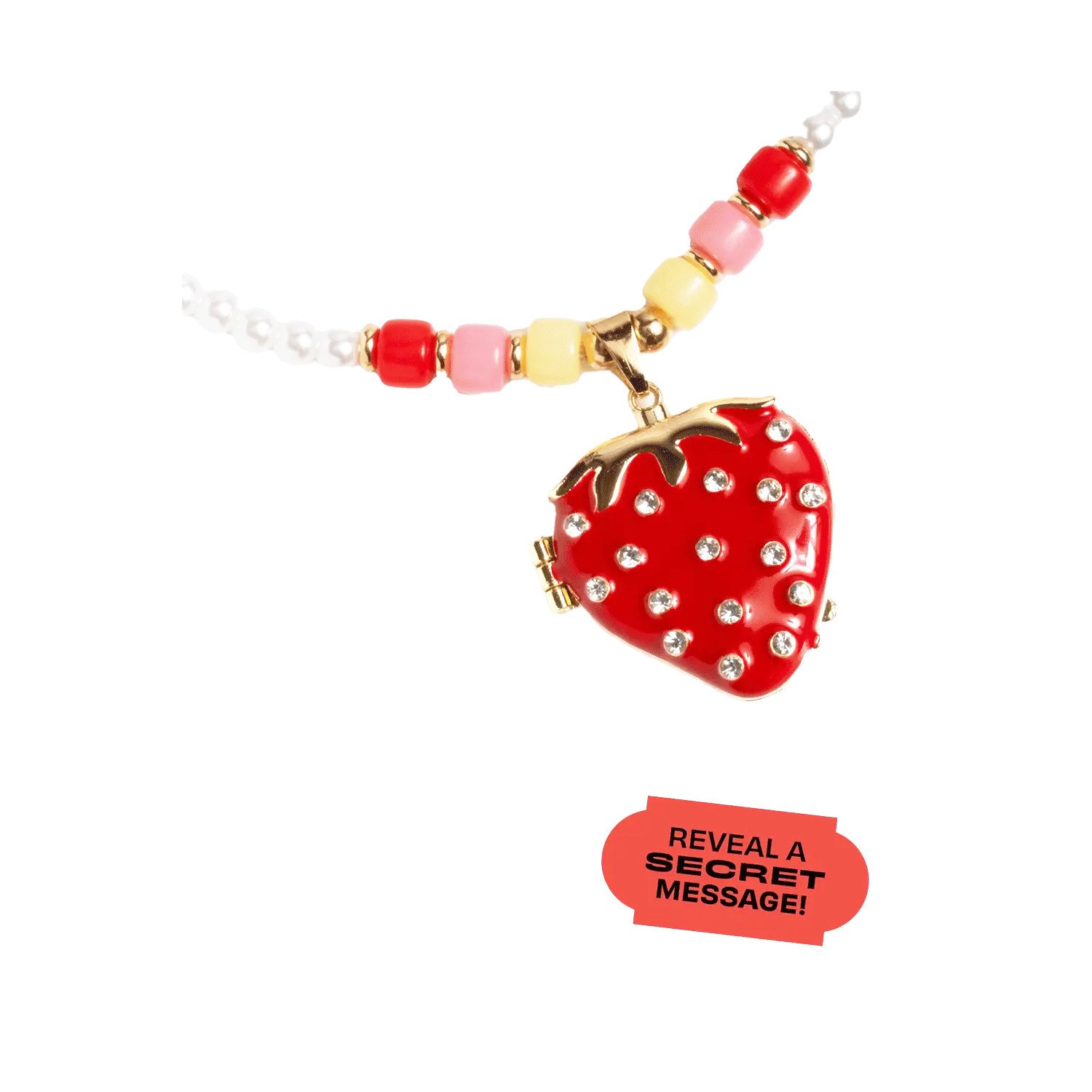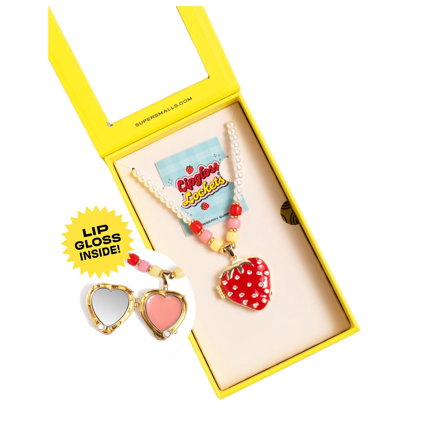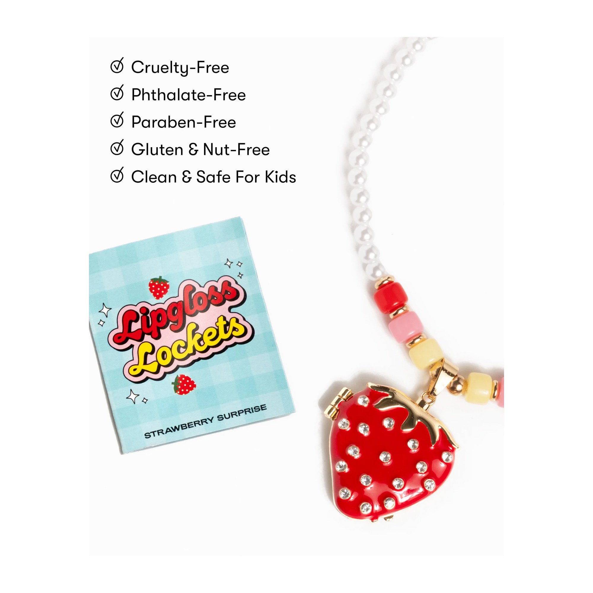 - Gem-studded strawberry-shaped locket with a shiny, strawberry-scented lip gloss inside