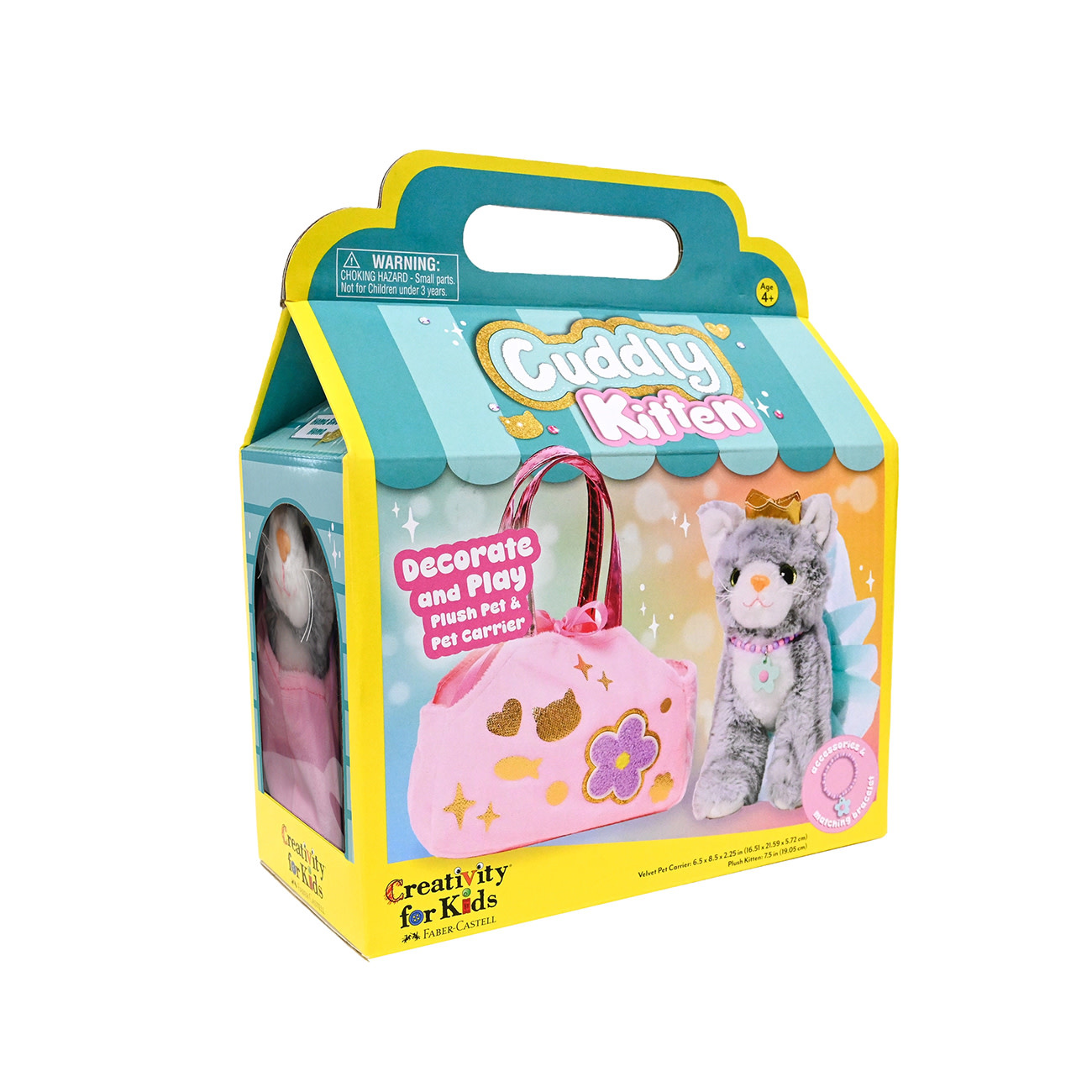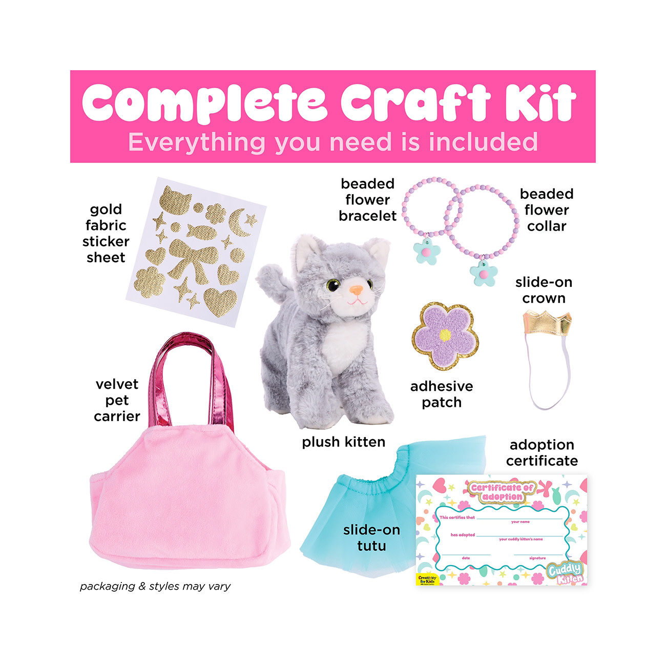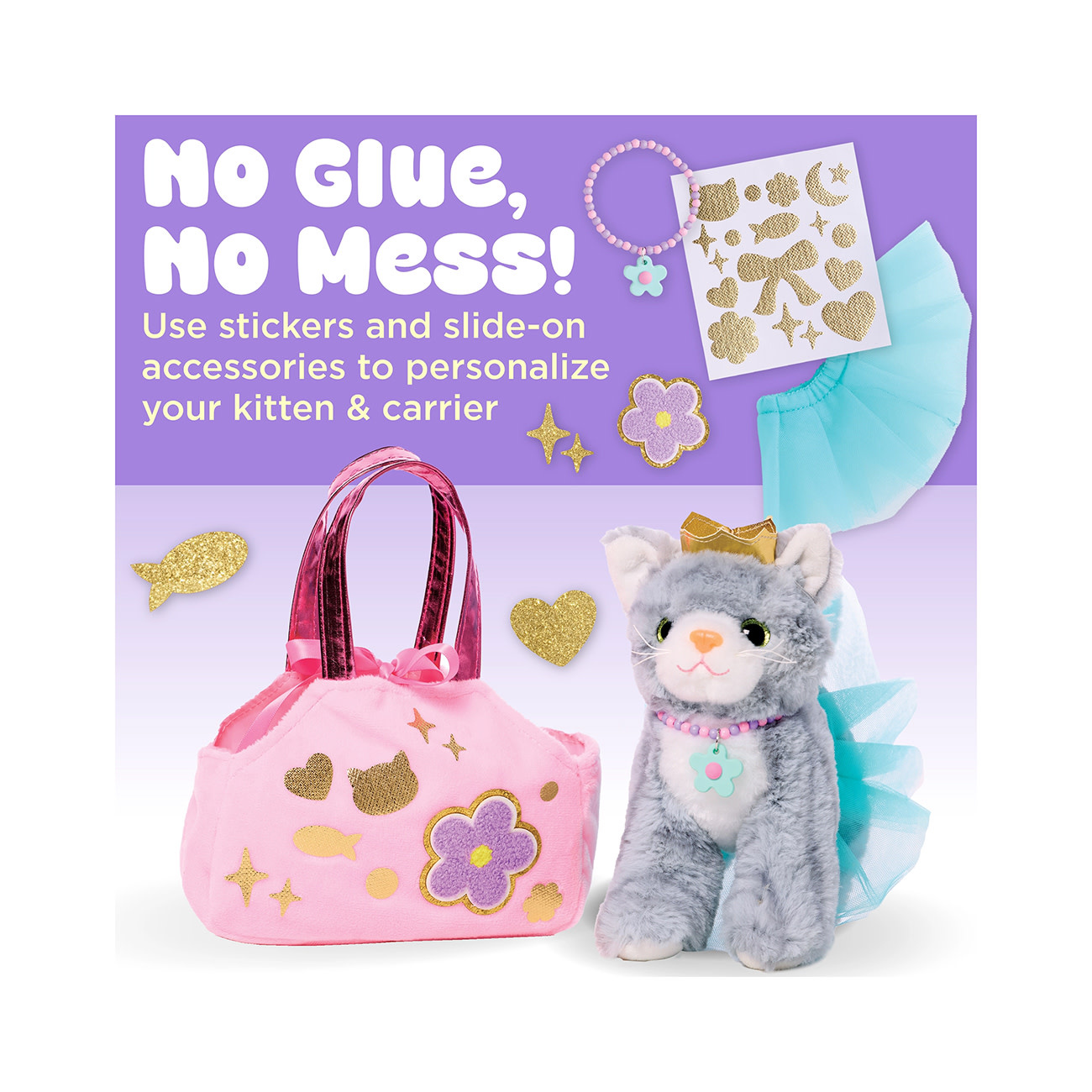 This cuddly kitten will be your purr-fect crafting companion. Decorate this plush kitten & velvety pet carrier with an array of adorable accessories including: ribbon & bell collar, metallic gold stickers, unicorn horn & butterfly wings. No glue, no mess!