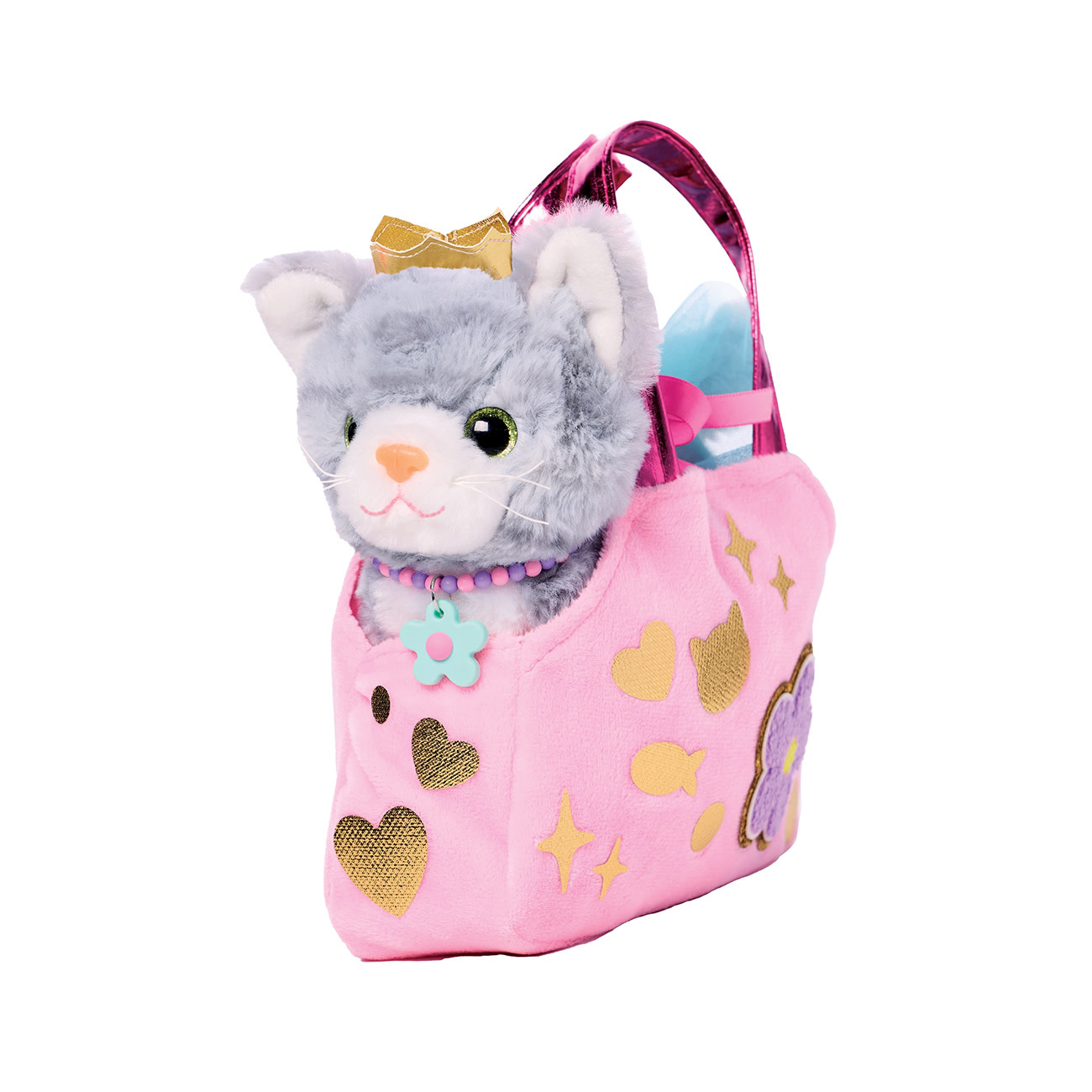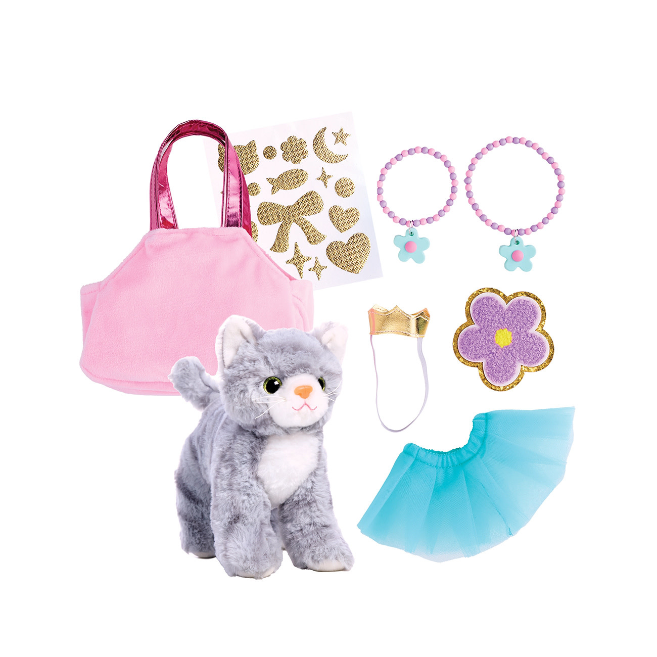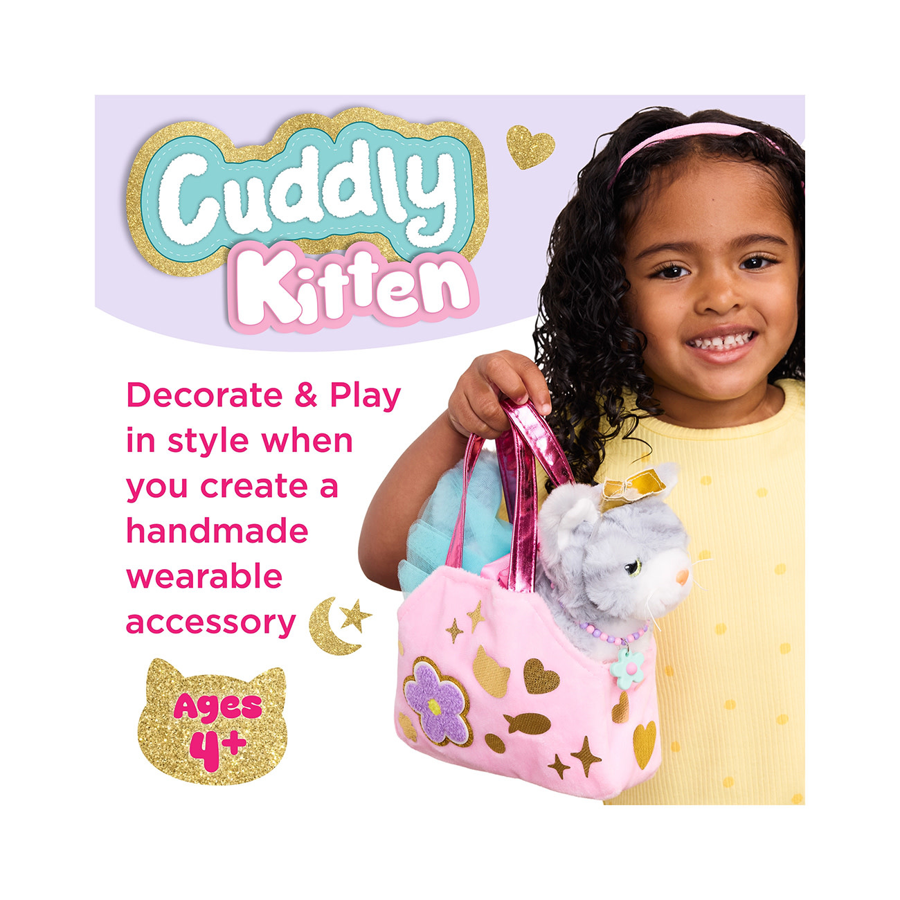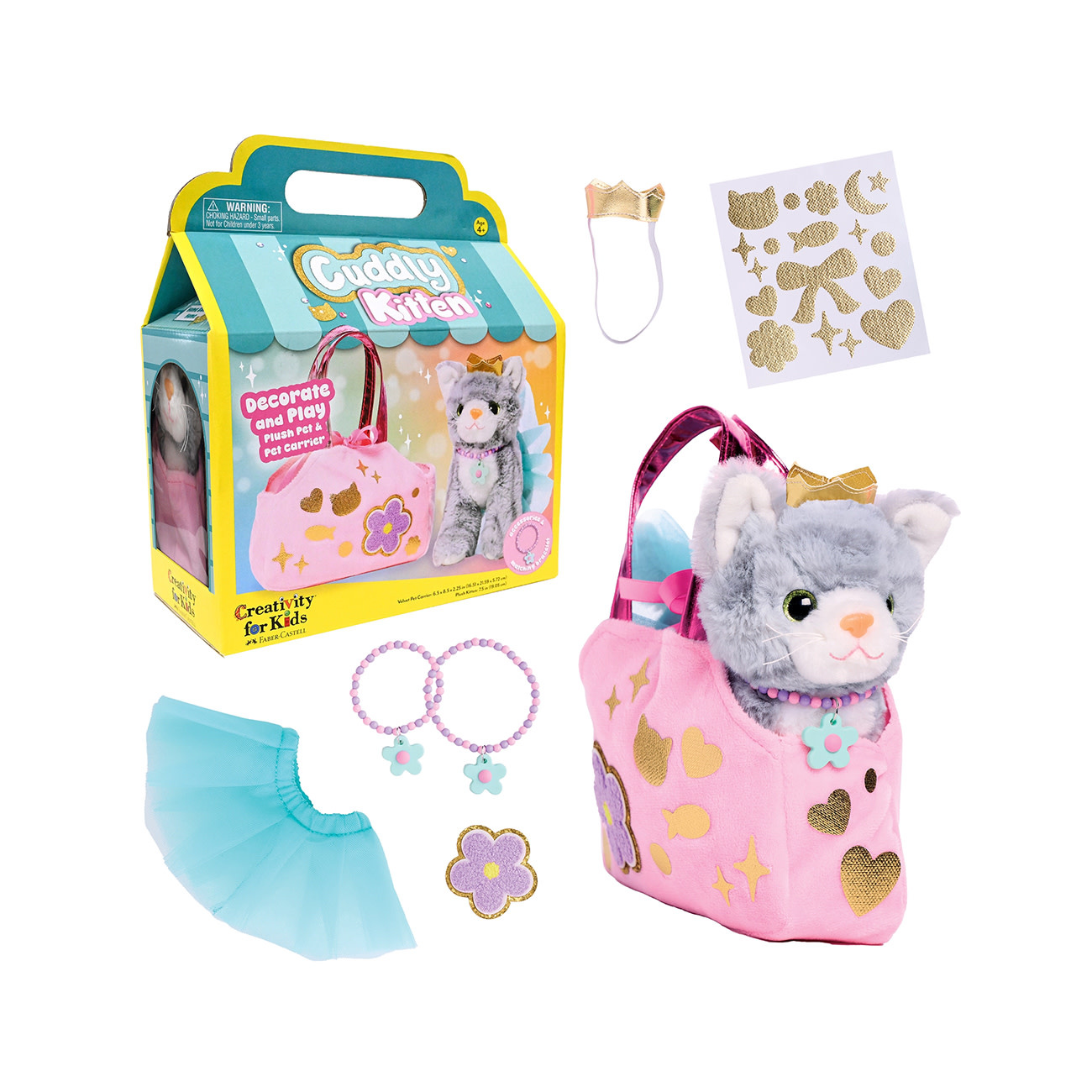 This cuddly kitten will be your purr-fect crafting companion. Decorate this plush kitten & velvety pet carrier with an array of adorable accessories including: ribbon & bell collar, metallic gold stickers, unicorn horn & butterfly wings. No glue, no mess!