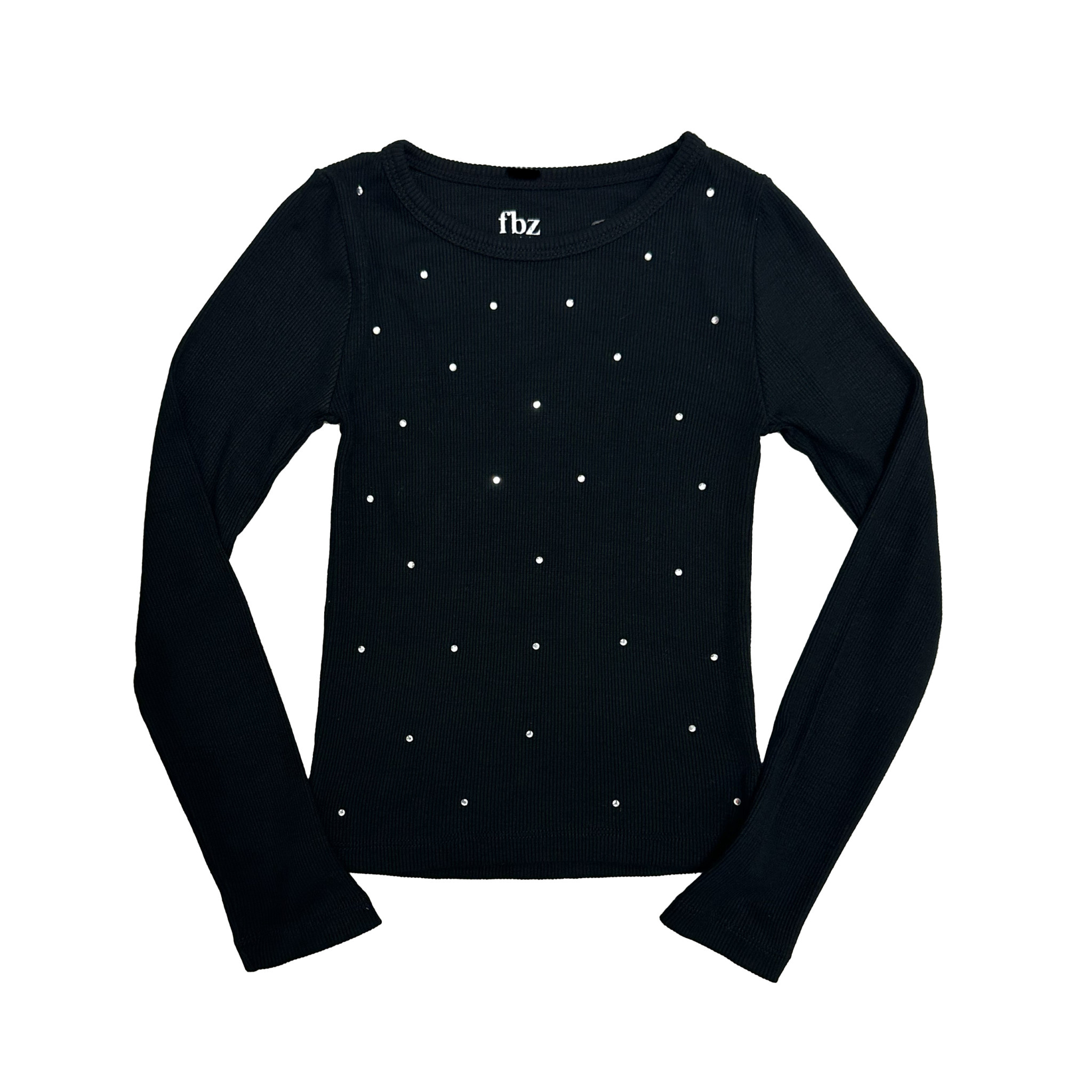 Flowers by Zoe black ribbed long sleeve top adorned with allover rhinestone crystals.