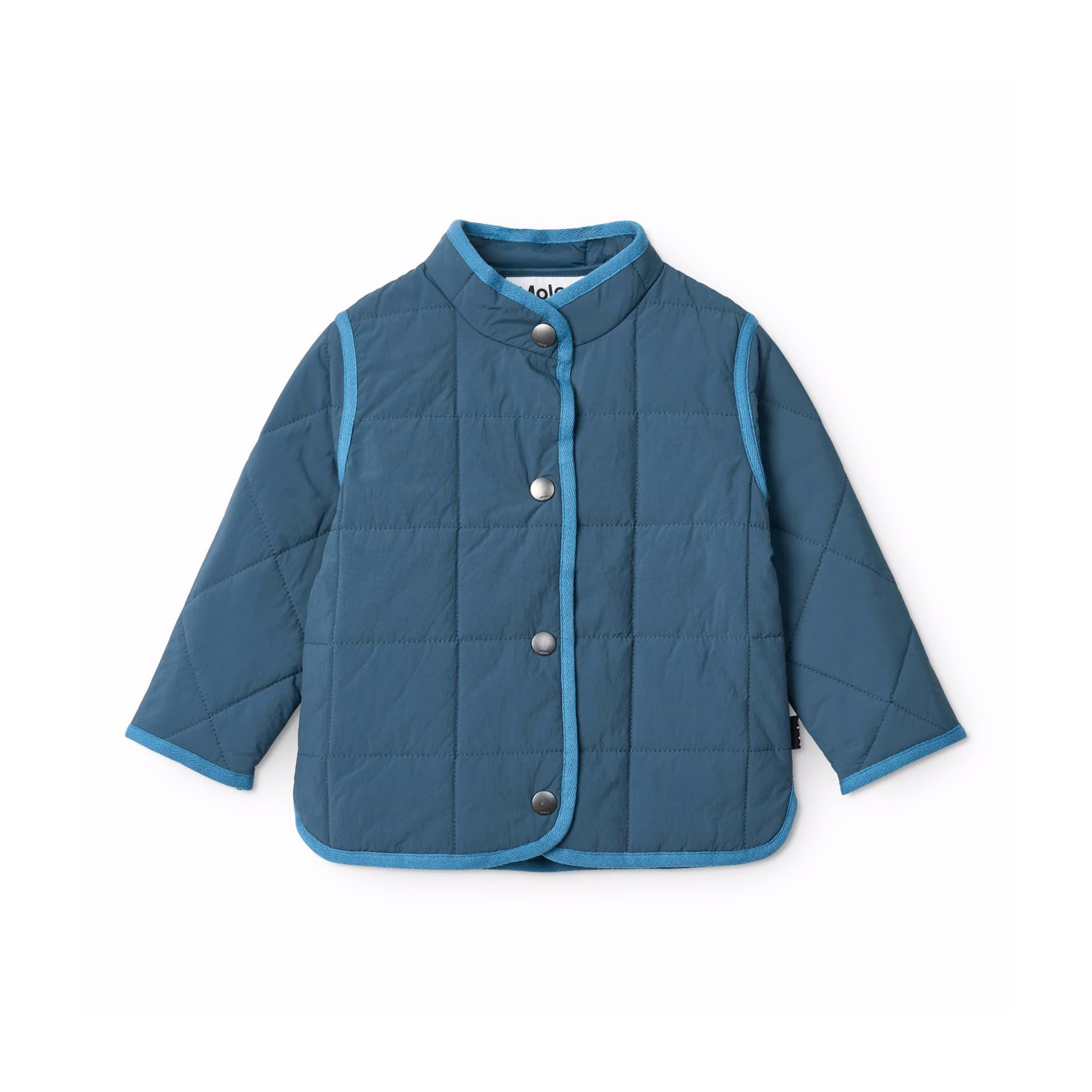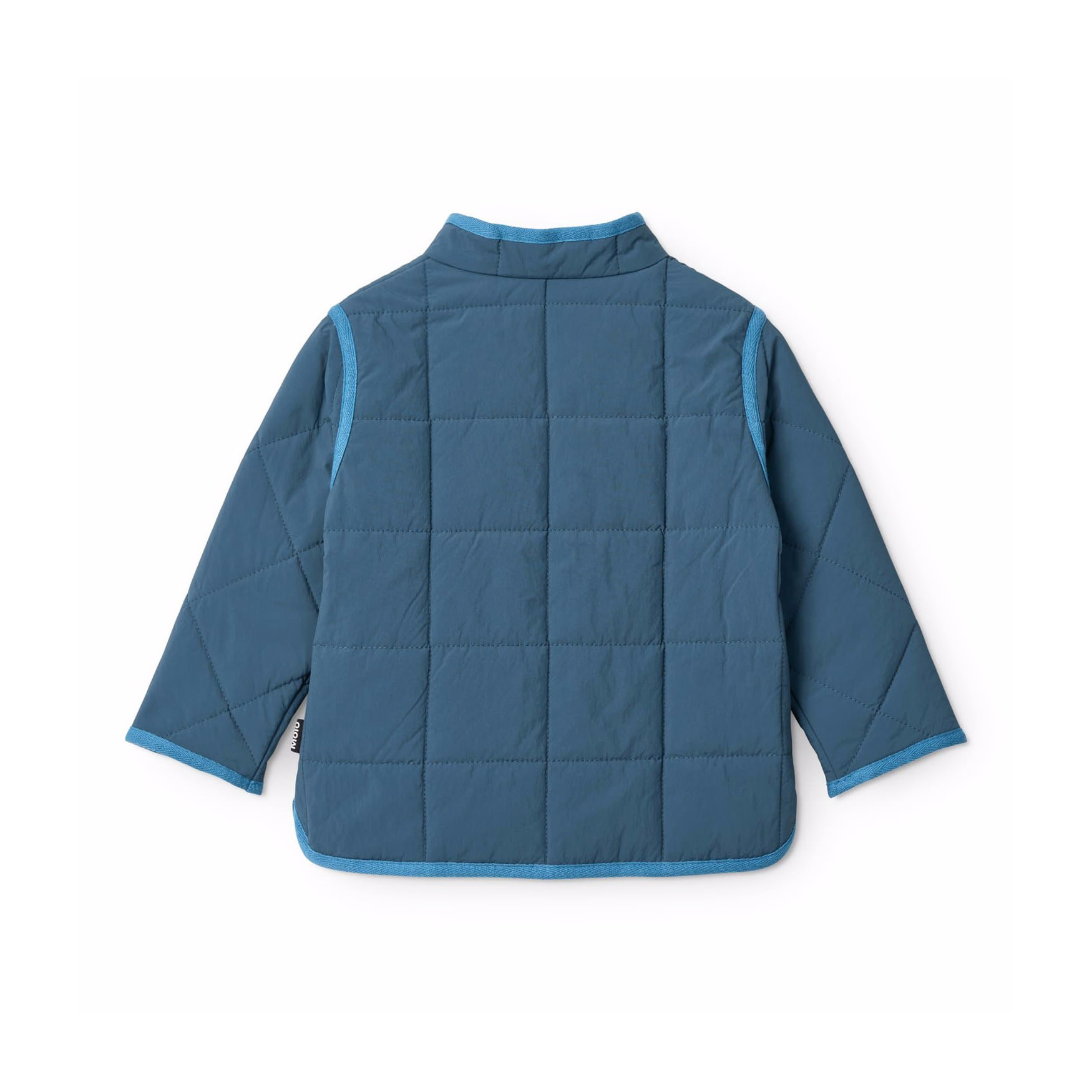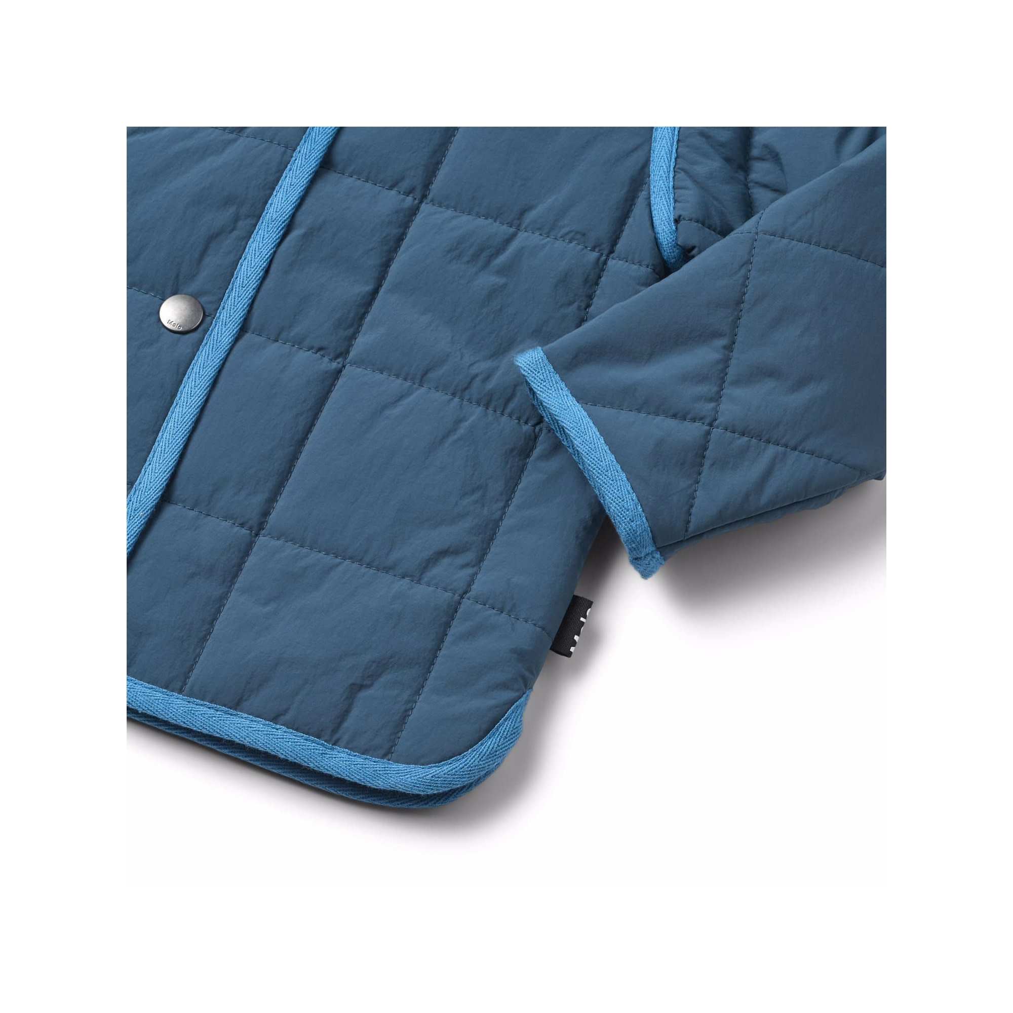 Blue water-repellent thermal jacket in recycled nylon with quilted pattern. The jacket has a regular fit, side pockets, button closure on the front, and matching edge tape, which gives a nice finish.