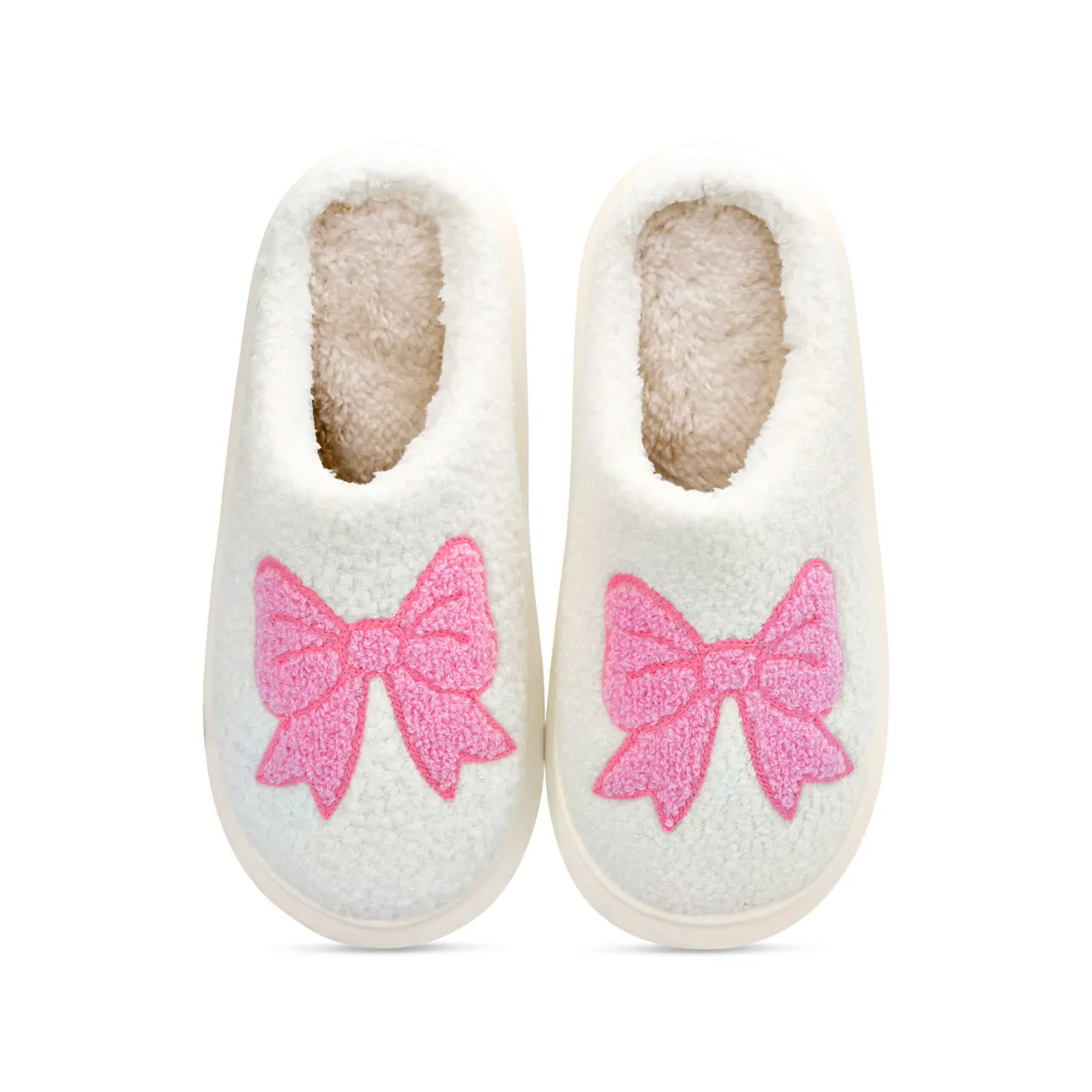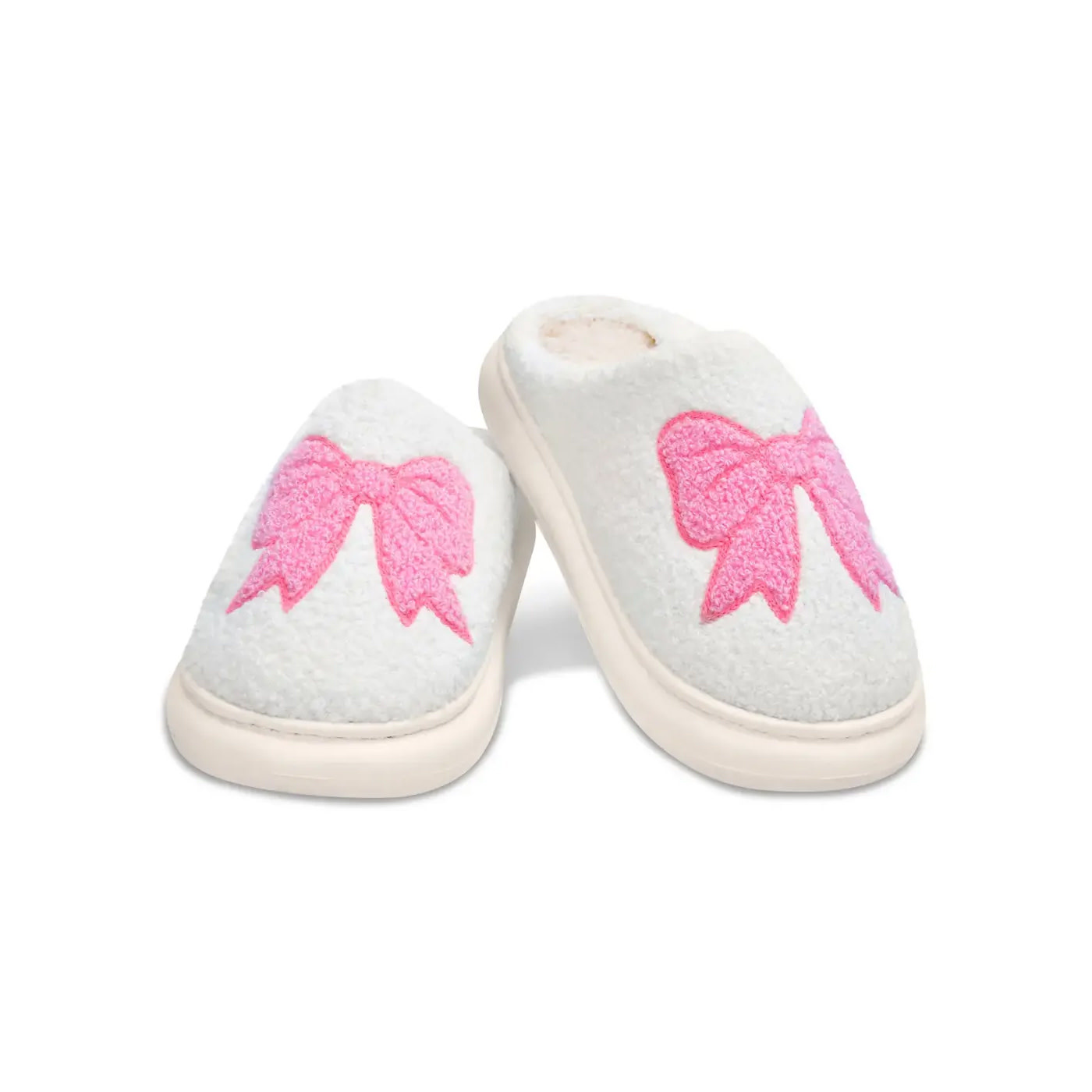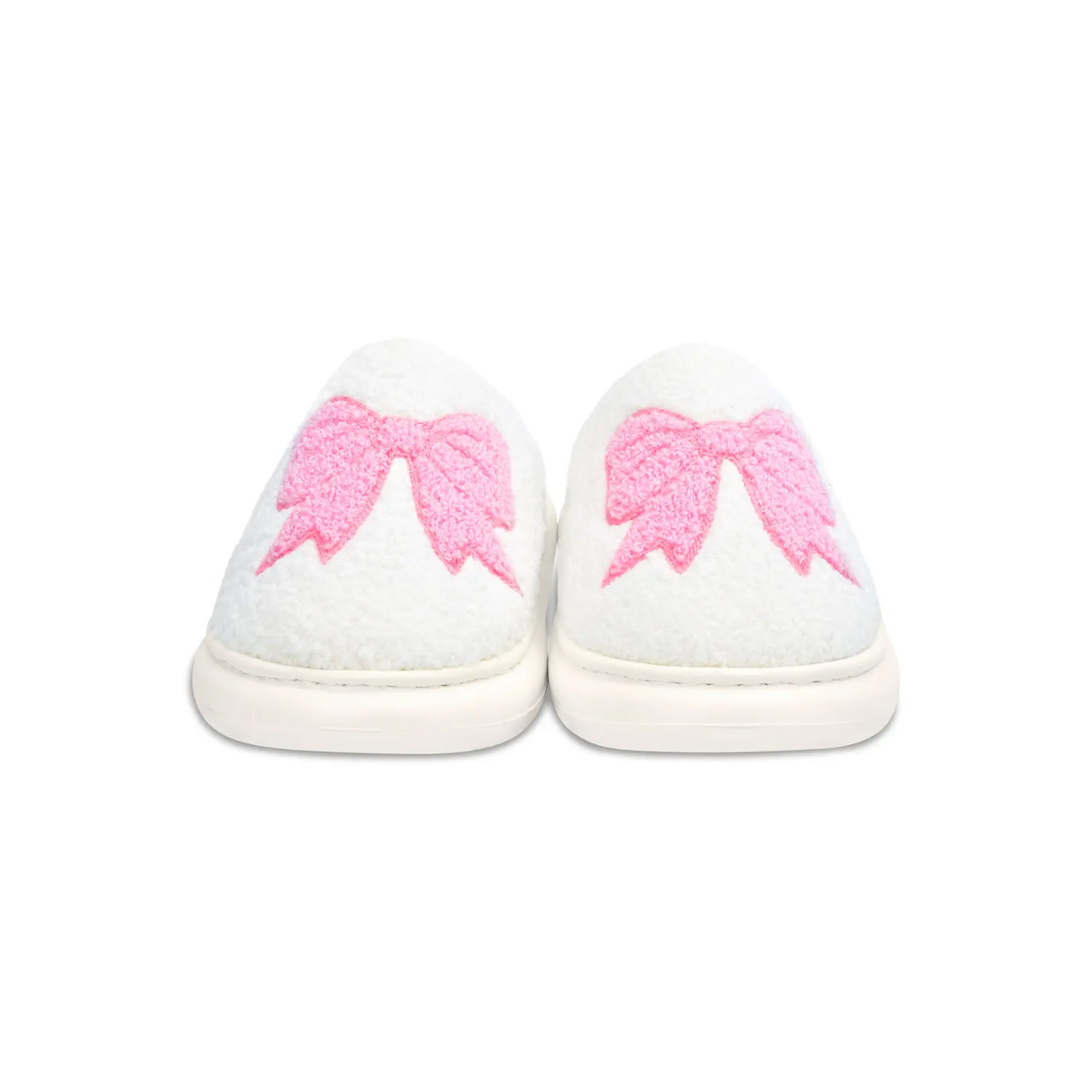 Cozy Bows Slippers by Iscream. Chenille material. Embroidered detail. Skid-resistant sole.