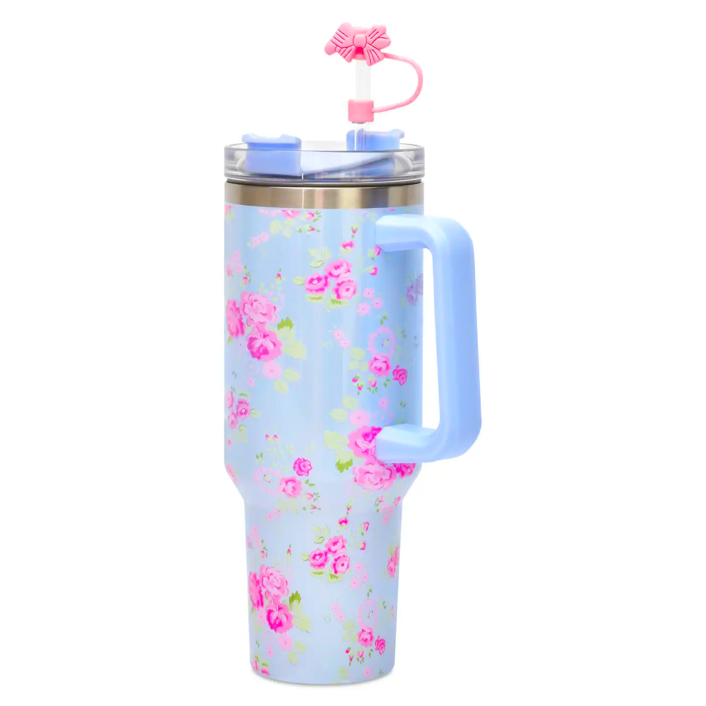 Ditsy Travel Cup by Iscream. Made of PS plastic. Double-wall insulated, stainless steel. BPA free. 40.5 fl. Oz. Includes straw with topper.