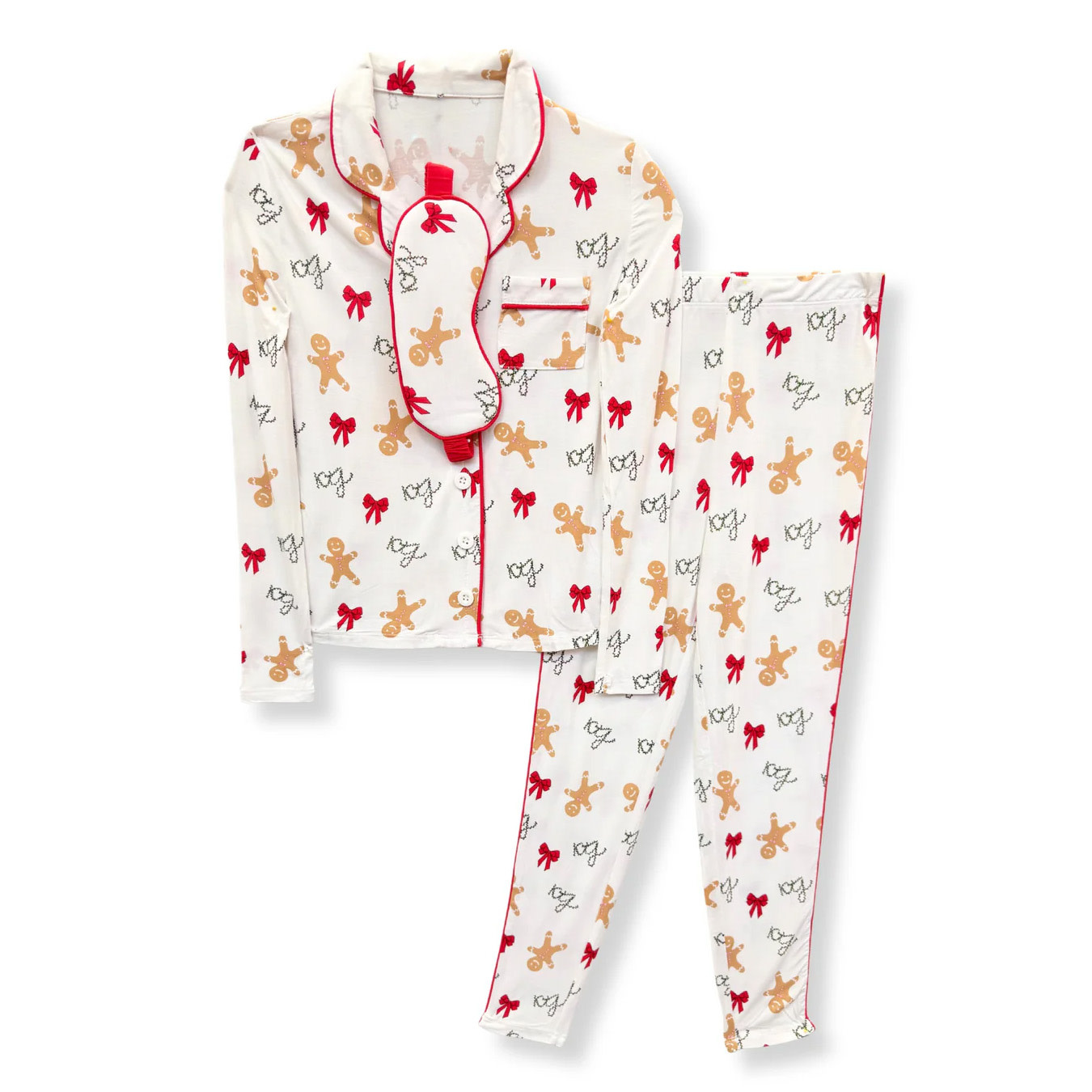 Snuggle up in festive comfort with Maia Pajamas in delightful holiday print! These charming PJs feature cheerful prints that capture the spirit of the season. Each set comes with a matching eye mask! Perfect for cozy nights by the fire.