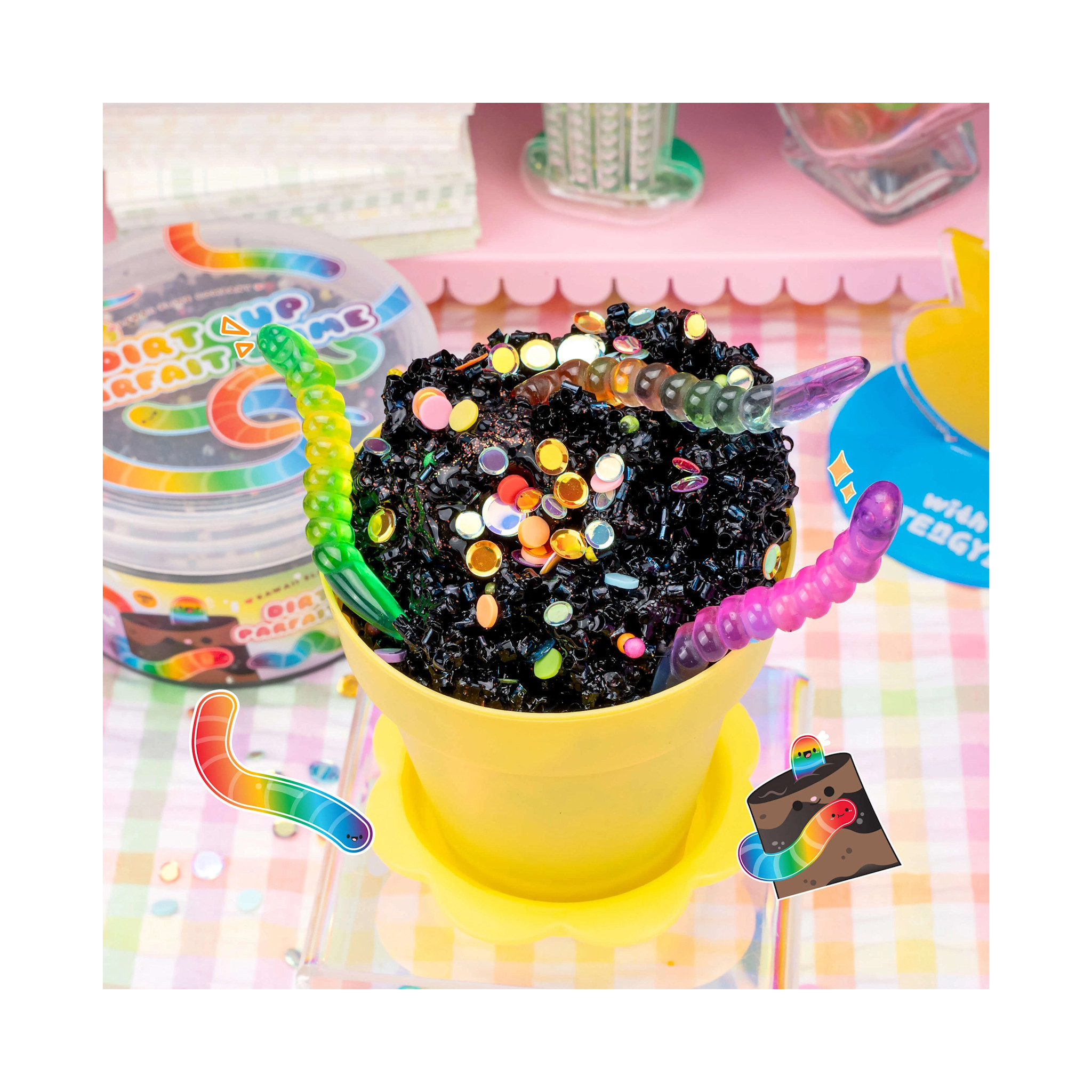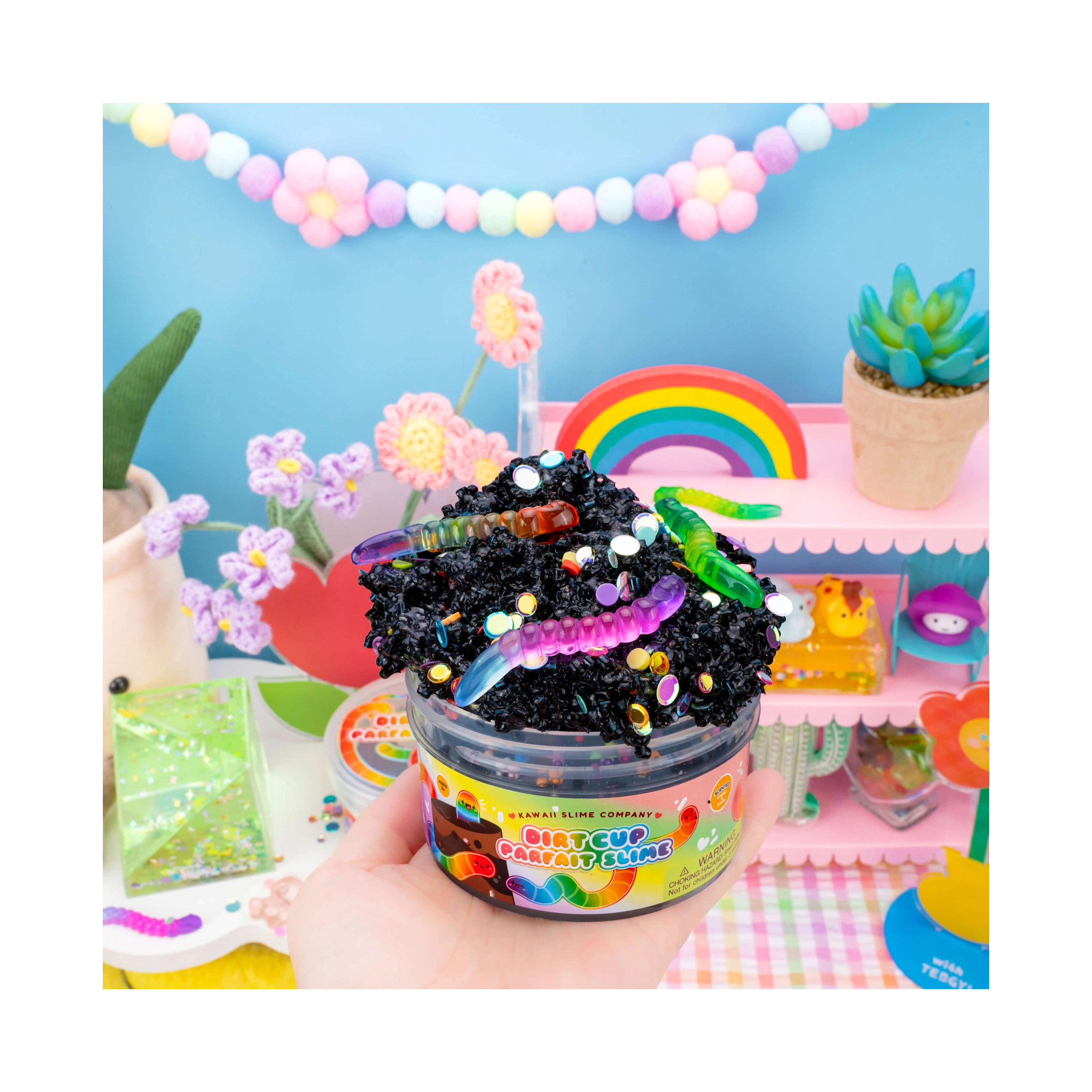 Create an account- Inside kawaii signature dome lid, you’ll discover rainbow worm charms and confetti sprinkle mix, making this Slime extra exciting to play with! It’s a little cup of happiness, perfect for endless squishy, stretchy fun!