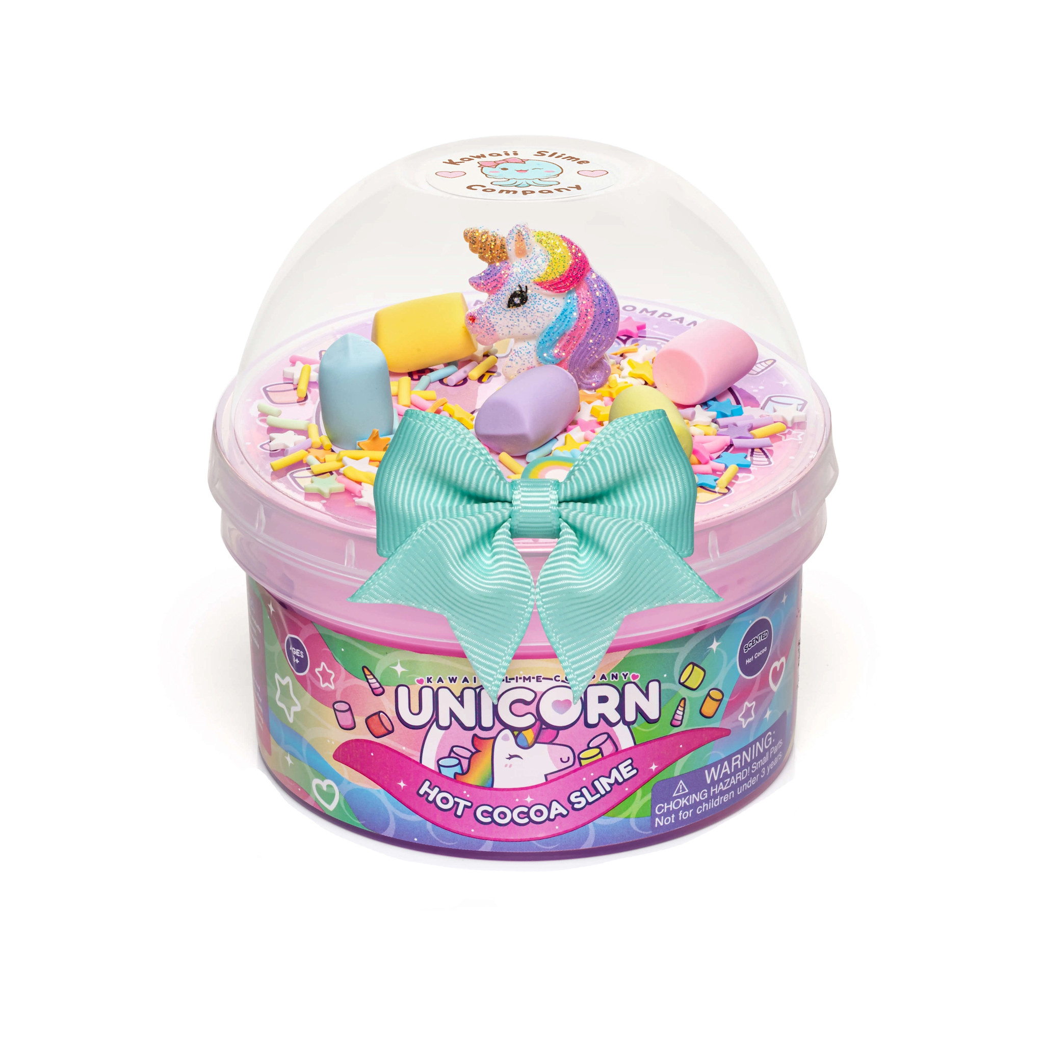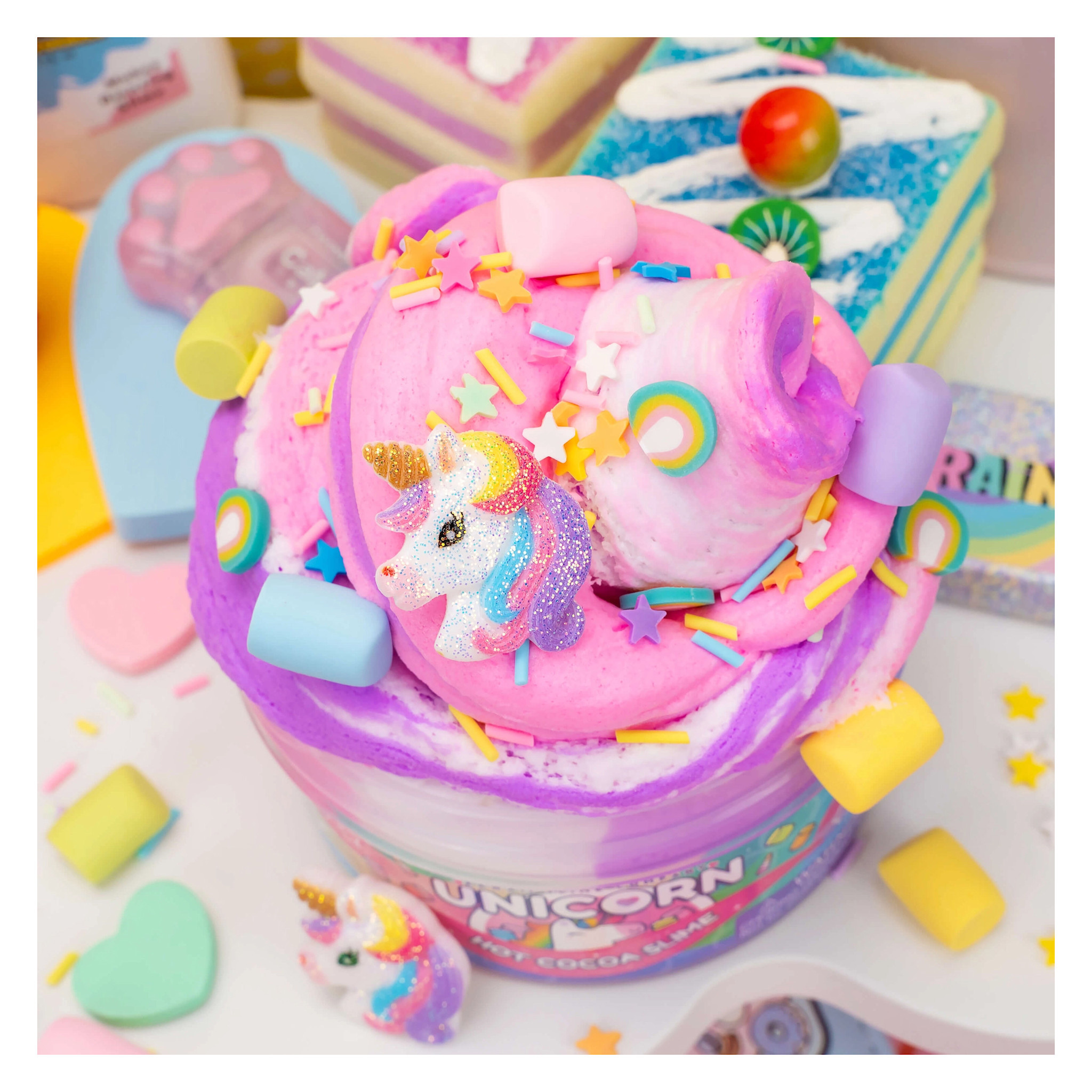 Unicorn Hot Cocoa Butter Slime is a magical experience that combines the scent of hot cocoa with a playful, whimsical twist! Each slime comes with adorable toppings & mix-ins, including marshmallow charms, a sprinkle mix, & glittery unicorn charm.