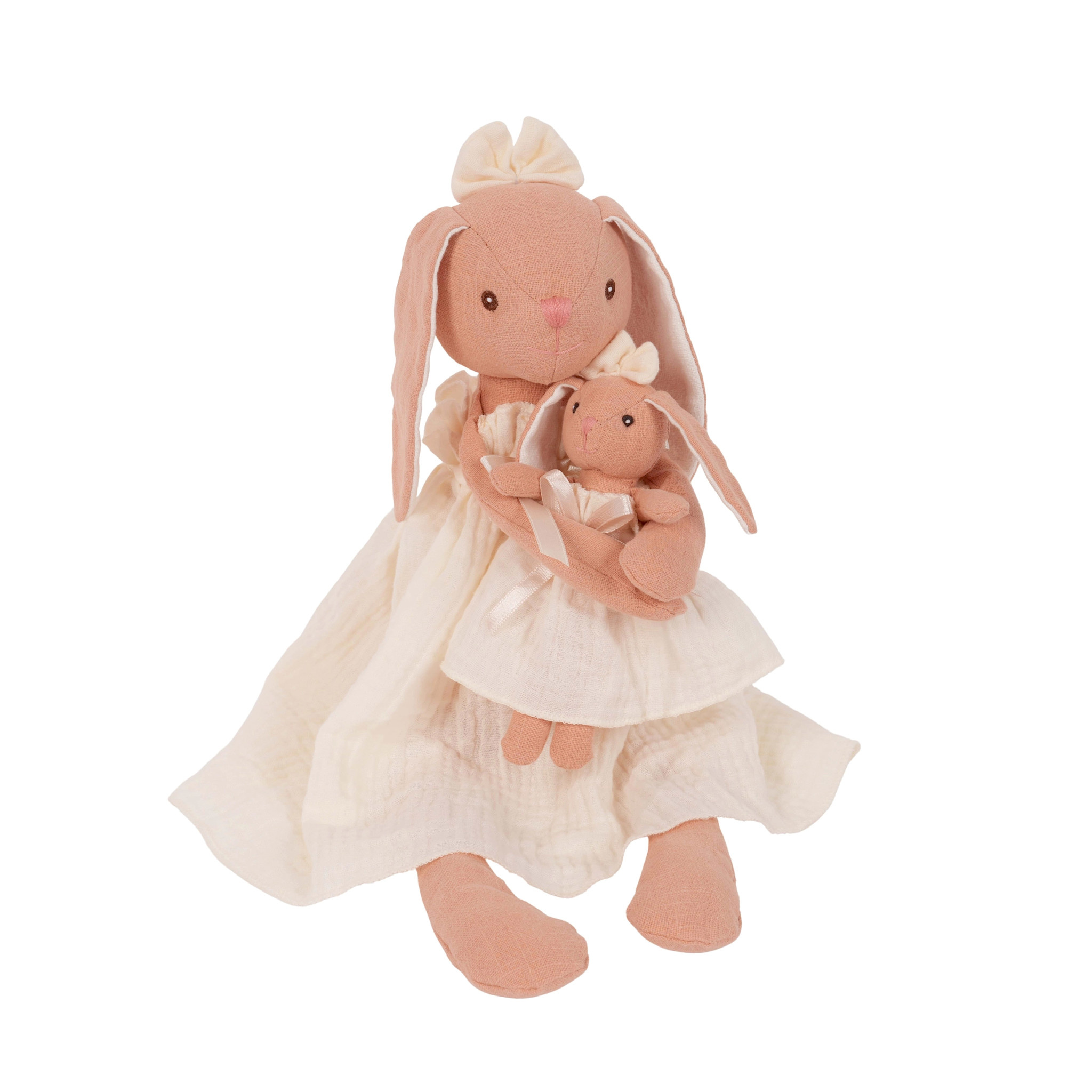 This bunny duo is handcrafted from soft linen and cotton, featuring a gentle mom bunny in a dress holding her tiny baby bunny in matching attire. With long floppy ears, hand-stitched features, and a dainty bow, with vintage charm & are perfect for cuddles