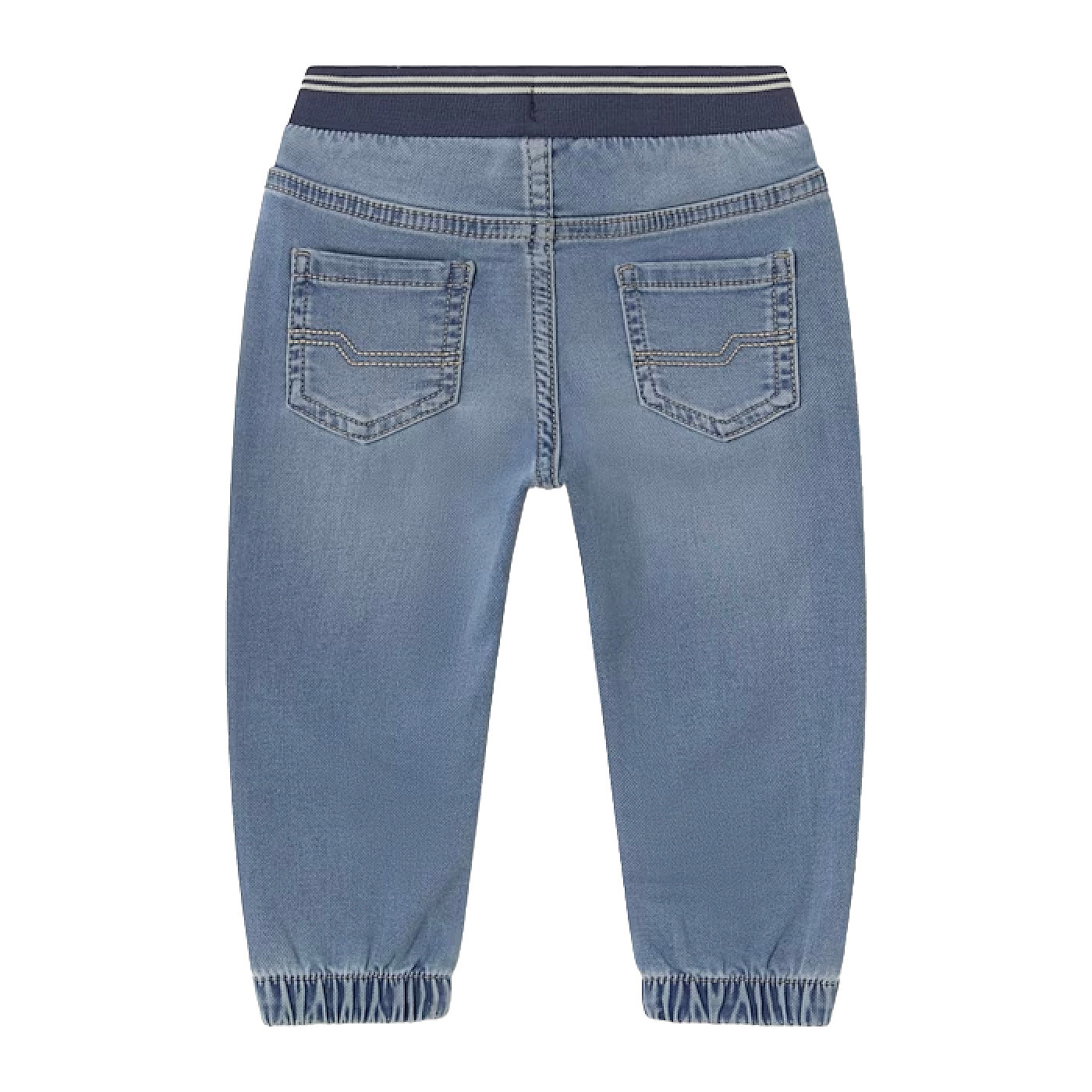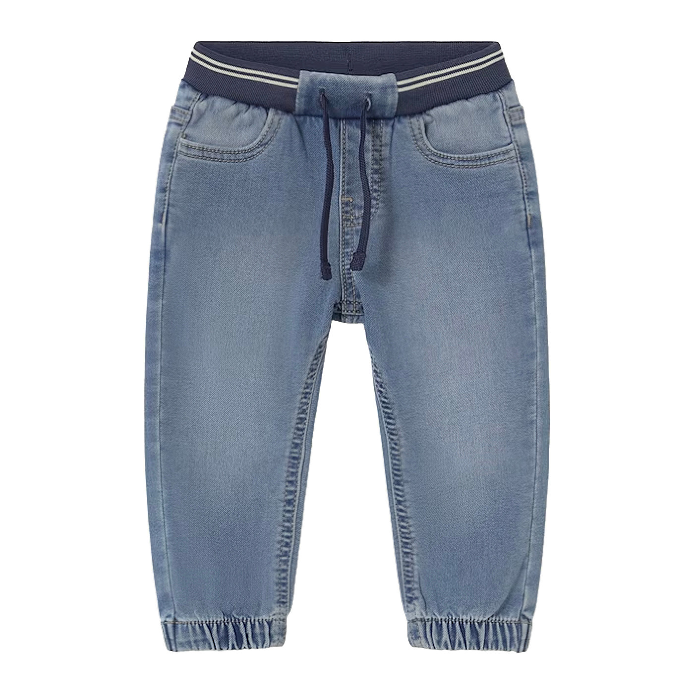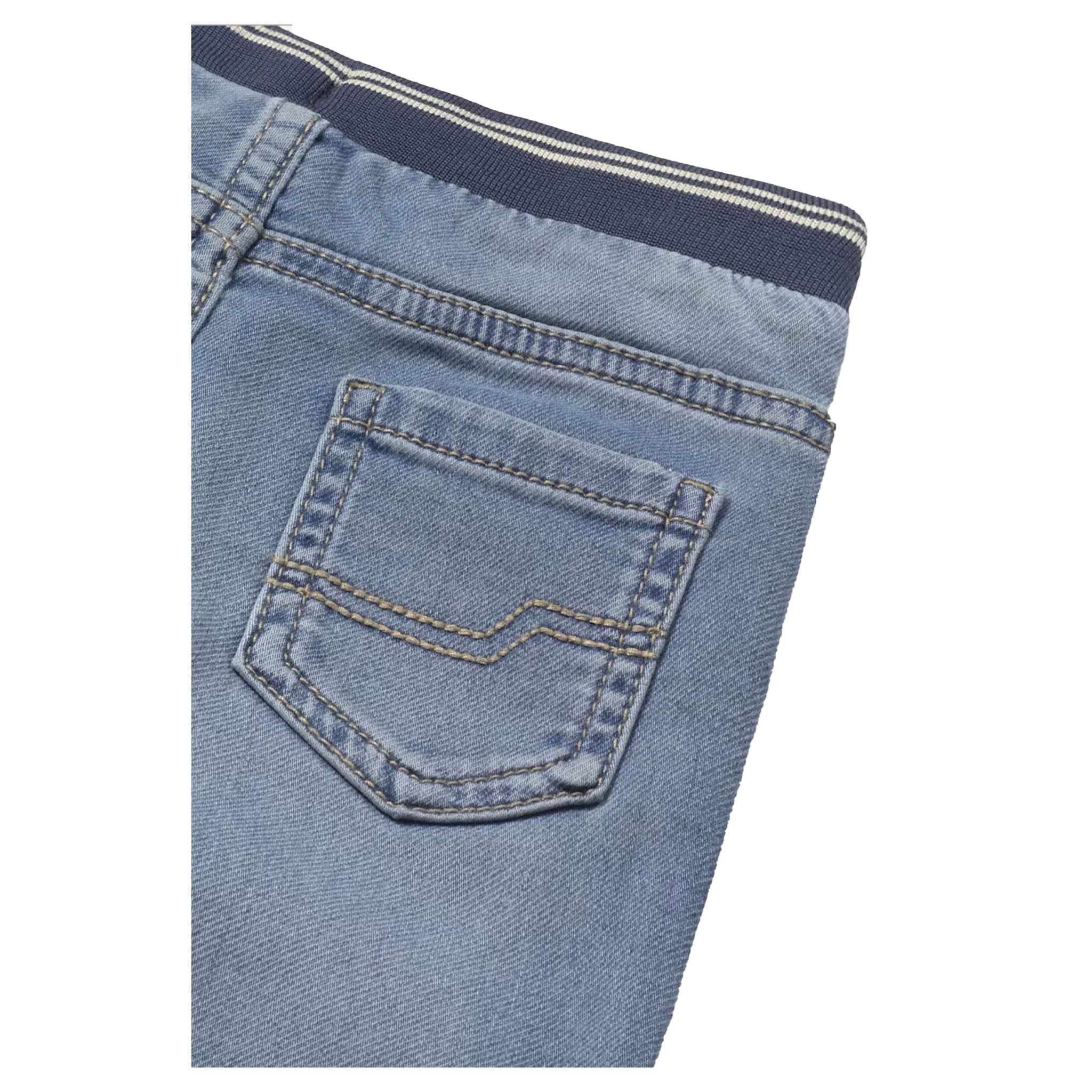 Blue jeans for younger boys made in comfortable jersey denim with a washed finish. Great for active little ones, these casual trousers have a stretchy ribbed waistband with simple drawstring ties. They have functional pockets and elasticated cuffs.