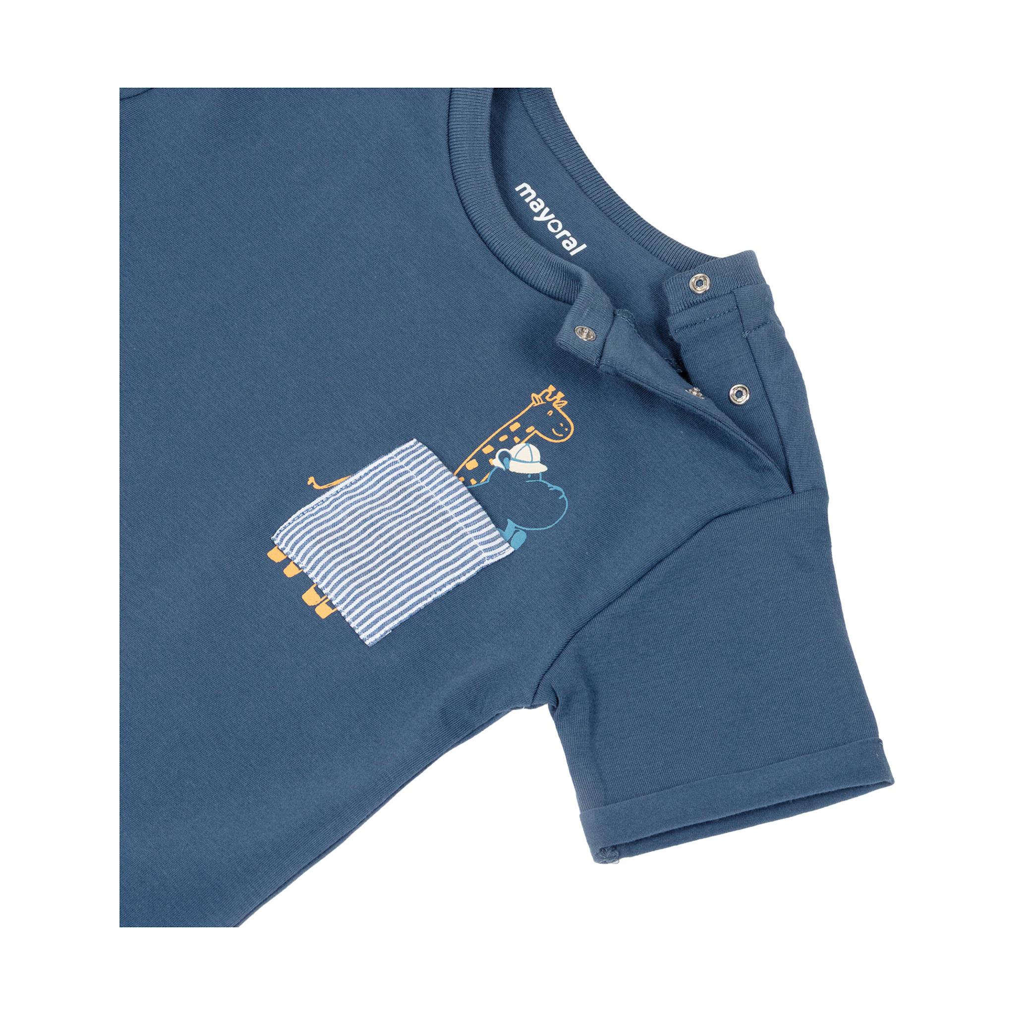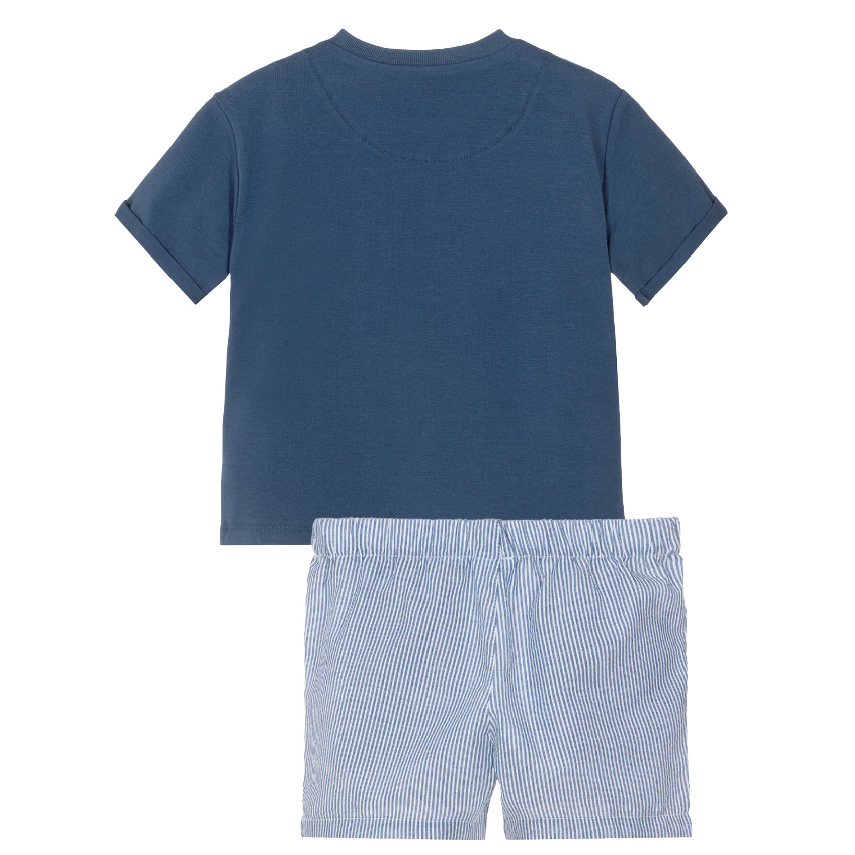 Mayoral baby boys blue shorts set is a cute & comfortable outfit. The T-shirt has a playful giraffe & hippo motif inside a pinstripe patch pocket, & shoulder snaps. The striped shorts are made in lightweight seersucker fabric, & have an elastic waistband.