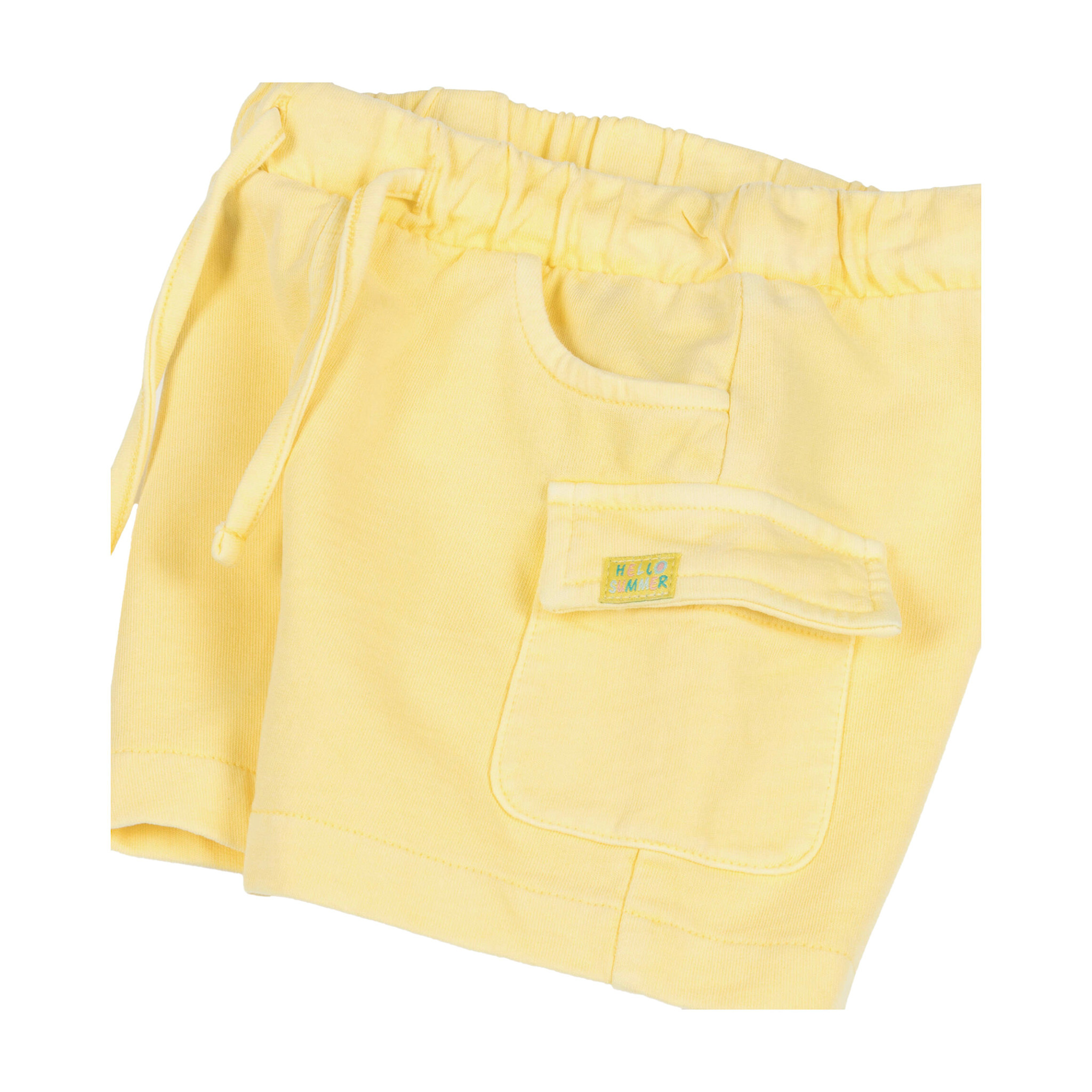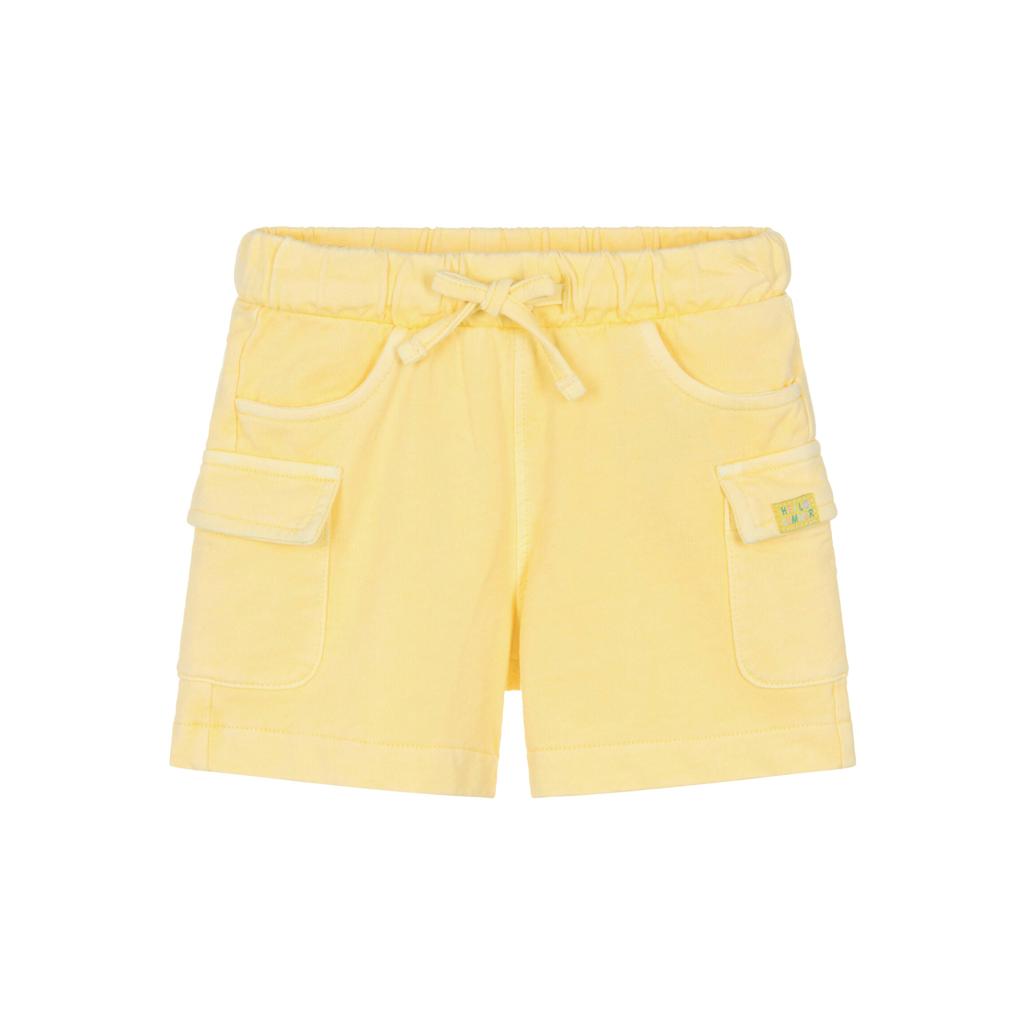 Mayoral baby boys yellow cargo shorts, made in soft cotton jersey. Casual and comfortable, they have an elasticated drawstring waistband and pockets. A cute 'hello summer' label is sewn on one of the pockets for a playful finish.