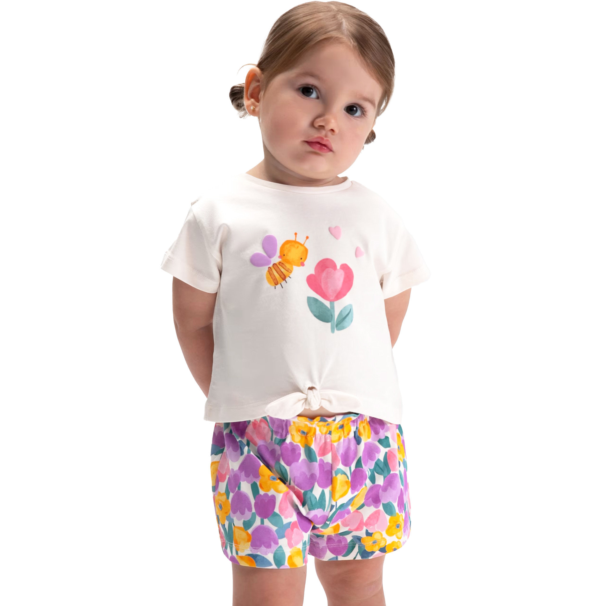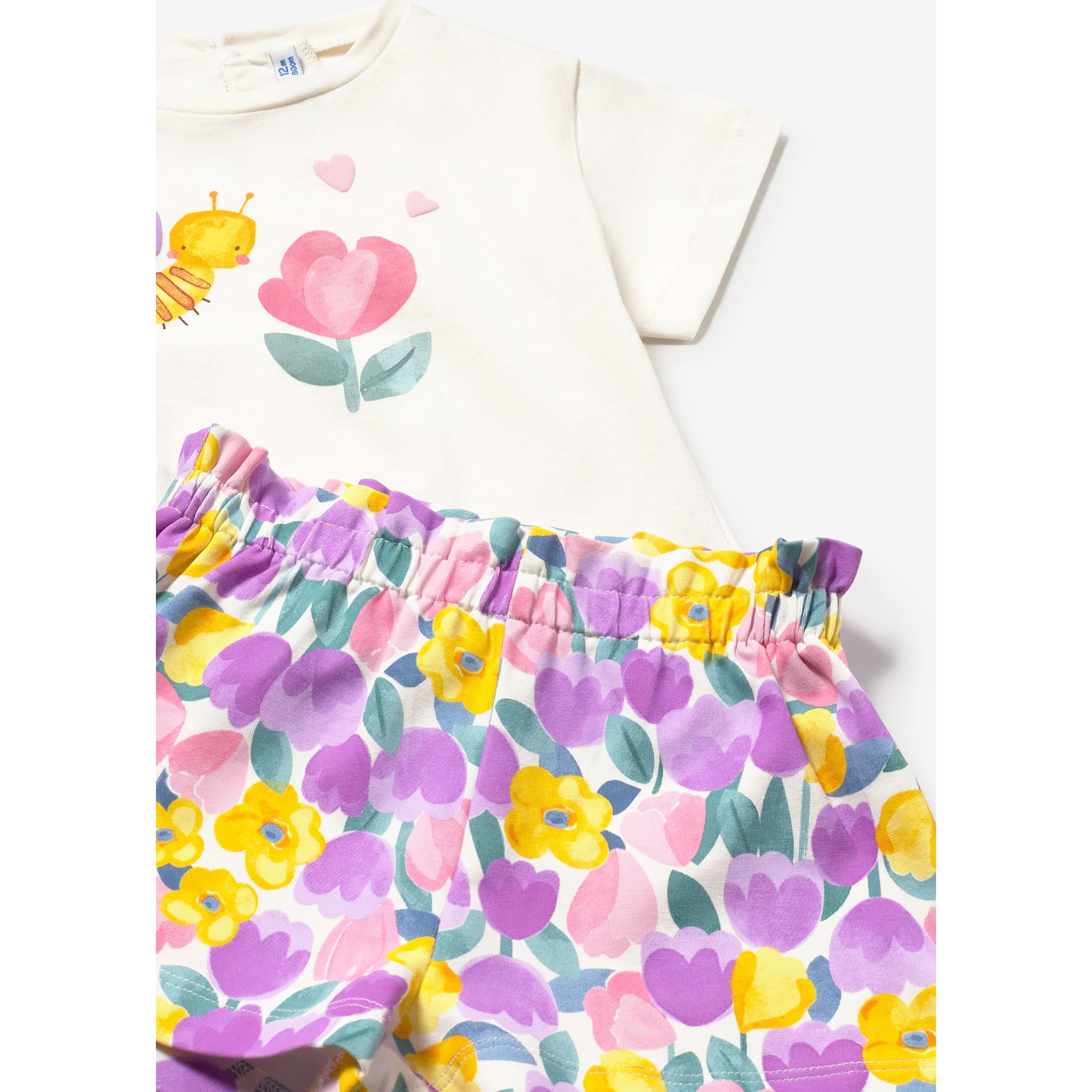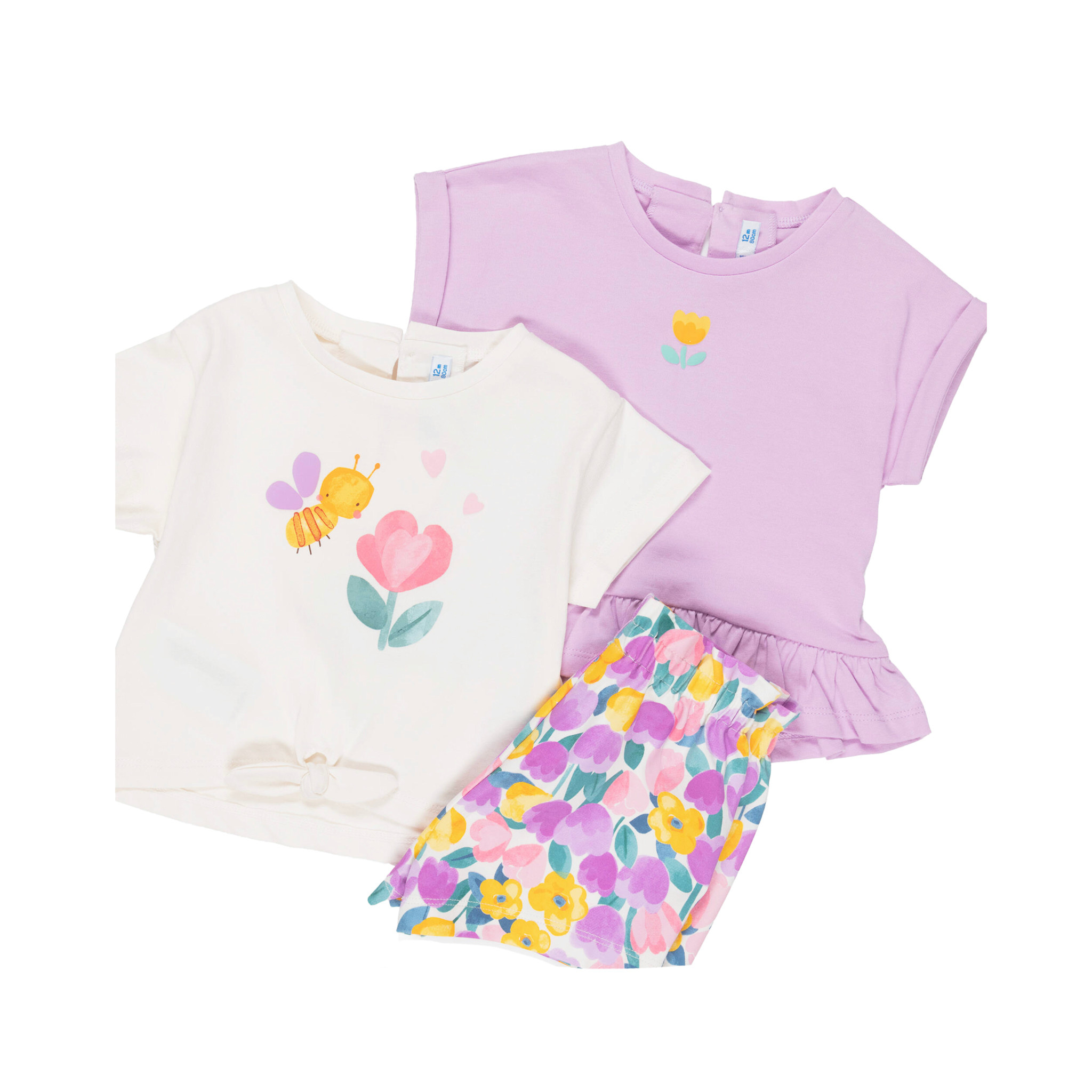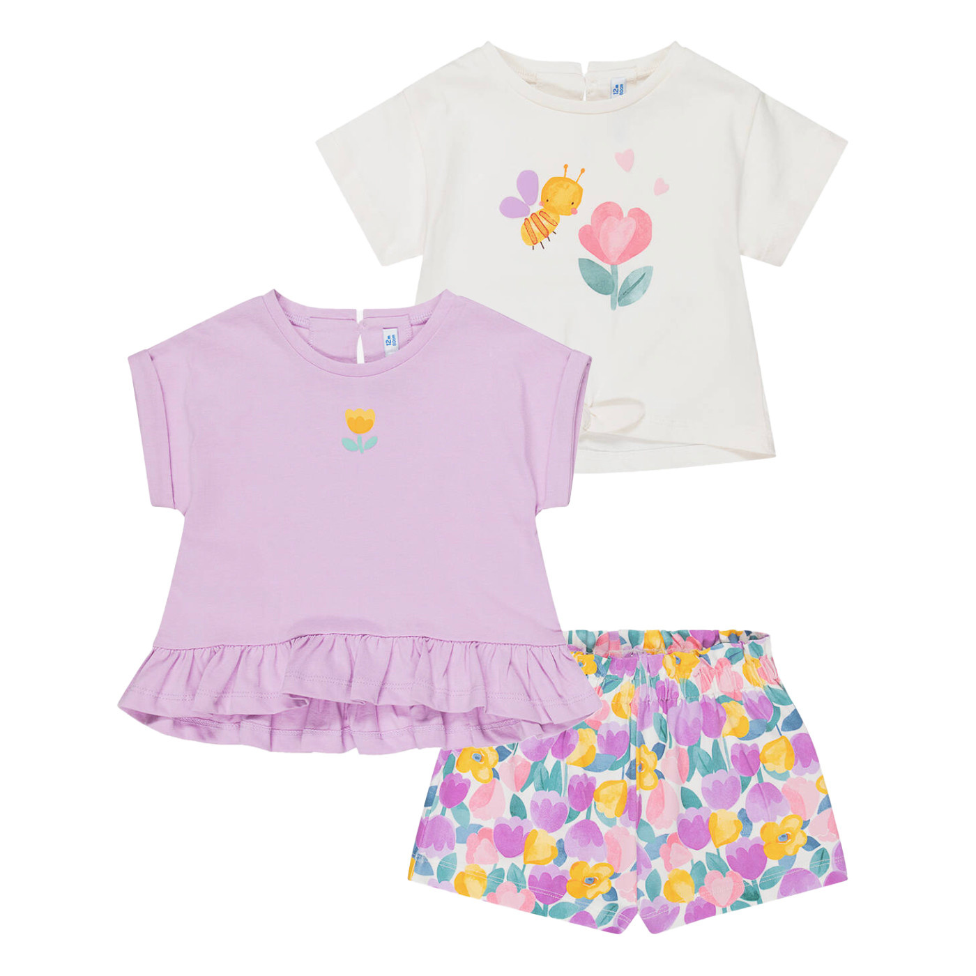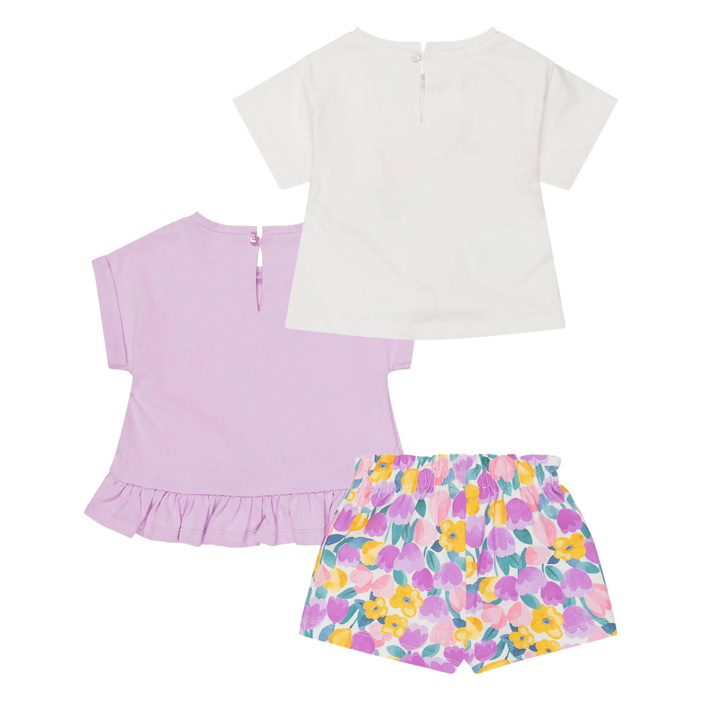 Mayoral baby girls adorable cotton jersey shorts set. Includes 2 shirts and shorts. T-shirts have a cute flower print with keyhole button fastenings. They pair beautifully with vibrant floral shorts, which are soft, lightweight and an elasticated waist.