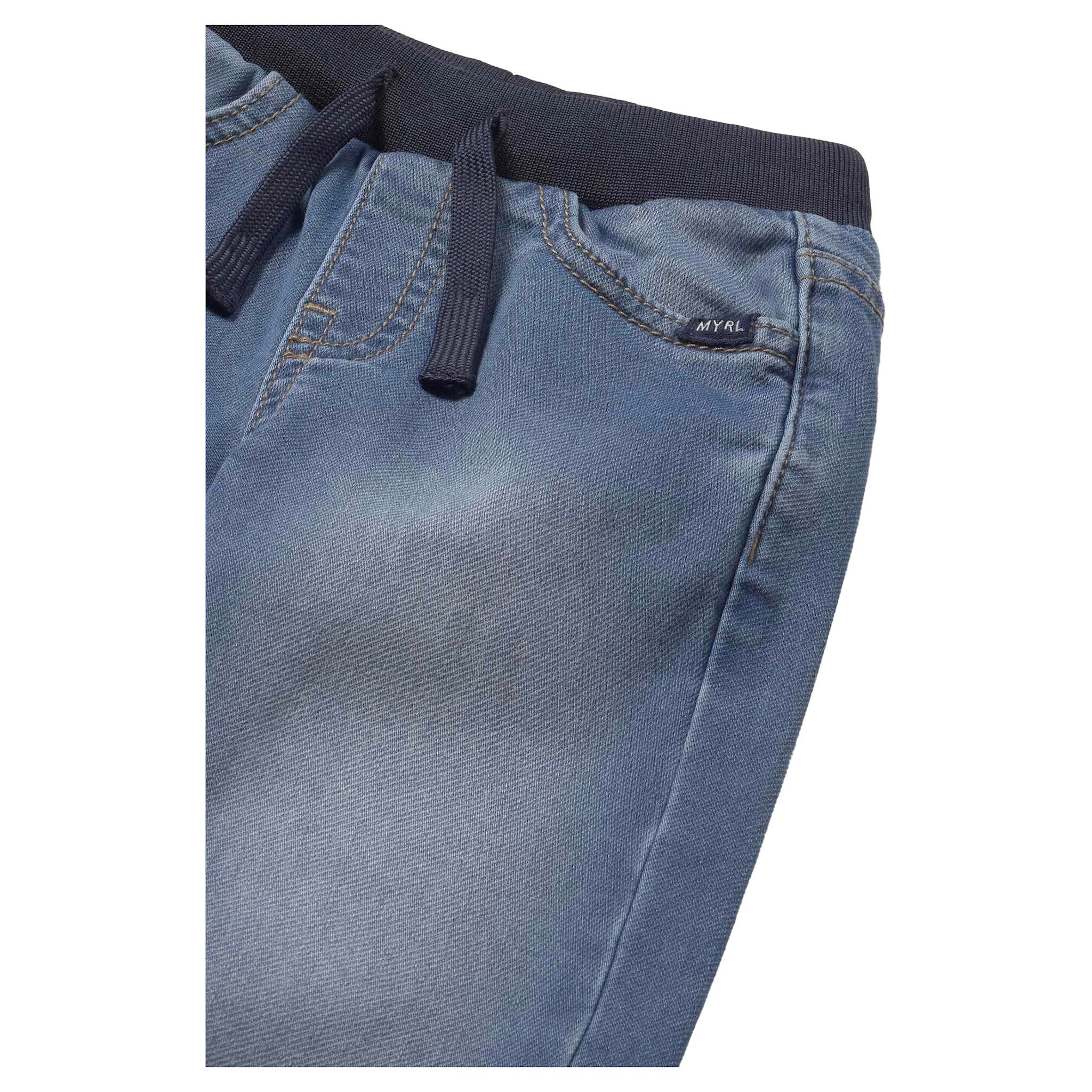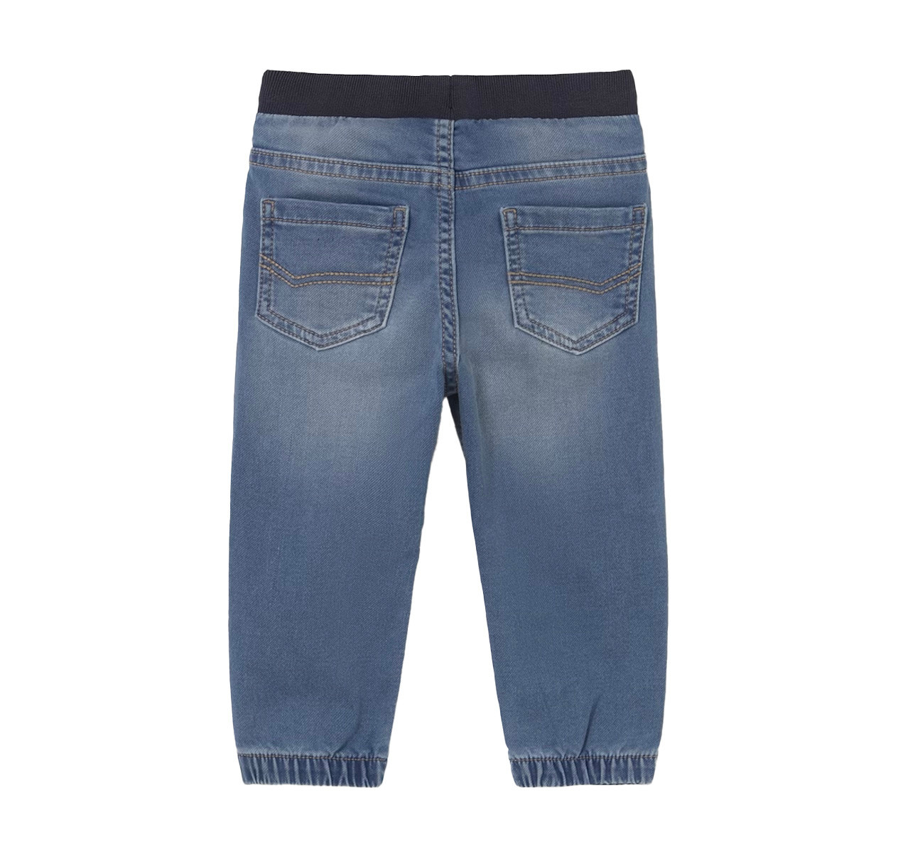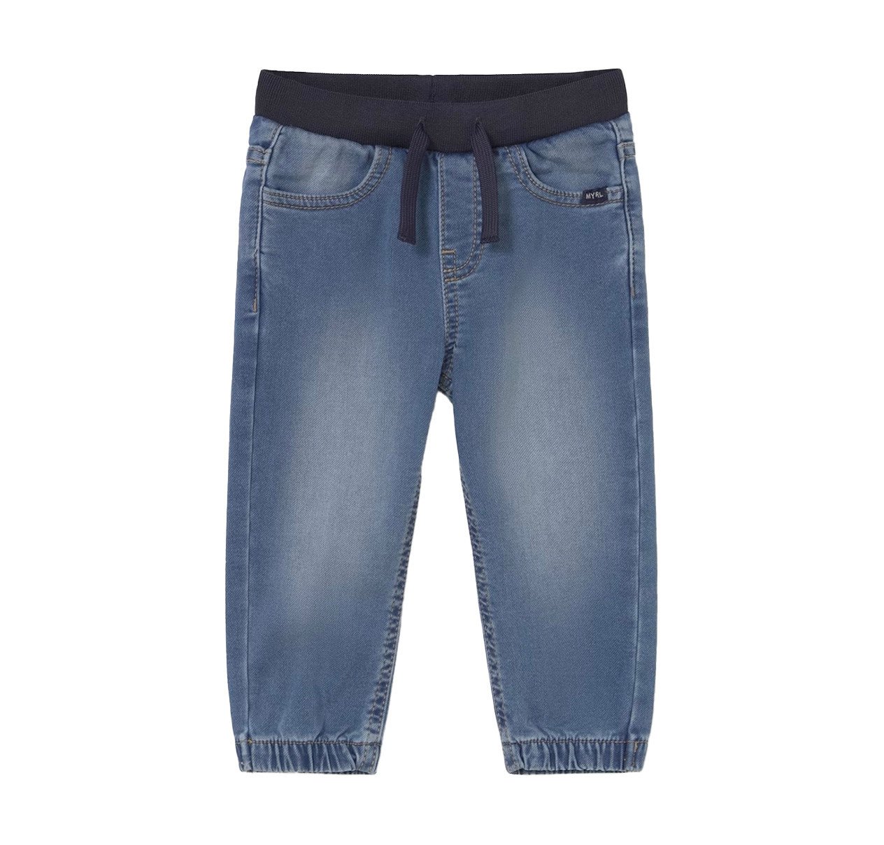 Mayoral joggers for baby in medium blue denim, baggy at the top of the joggers but narrower towards the ankle. Elasticated waistband with adjustable drawstring. Comfortable denim fabric, perfect for everyday outfits.