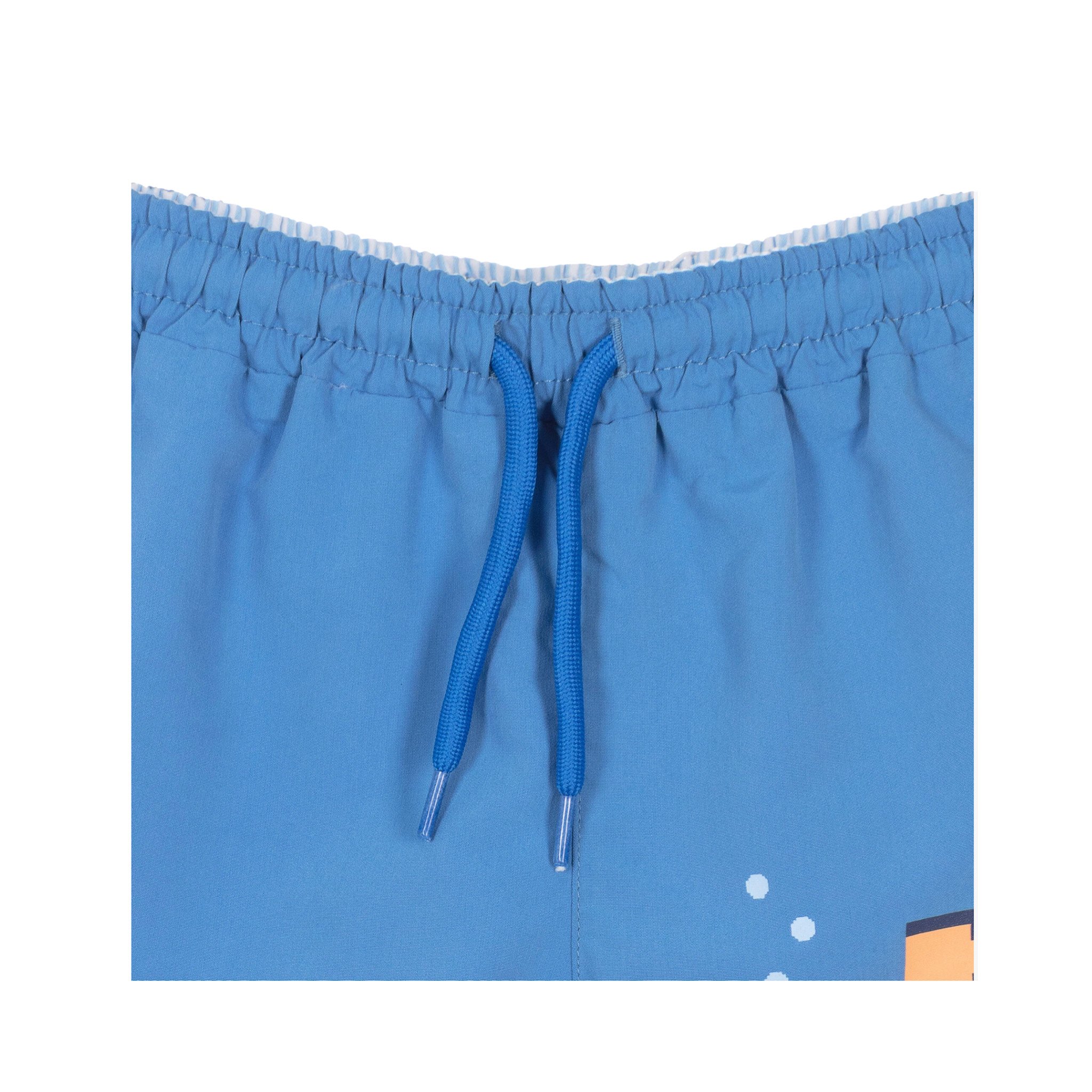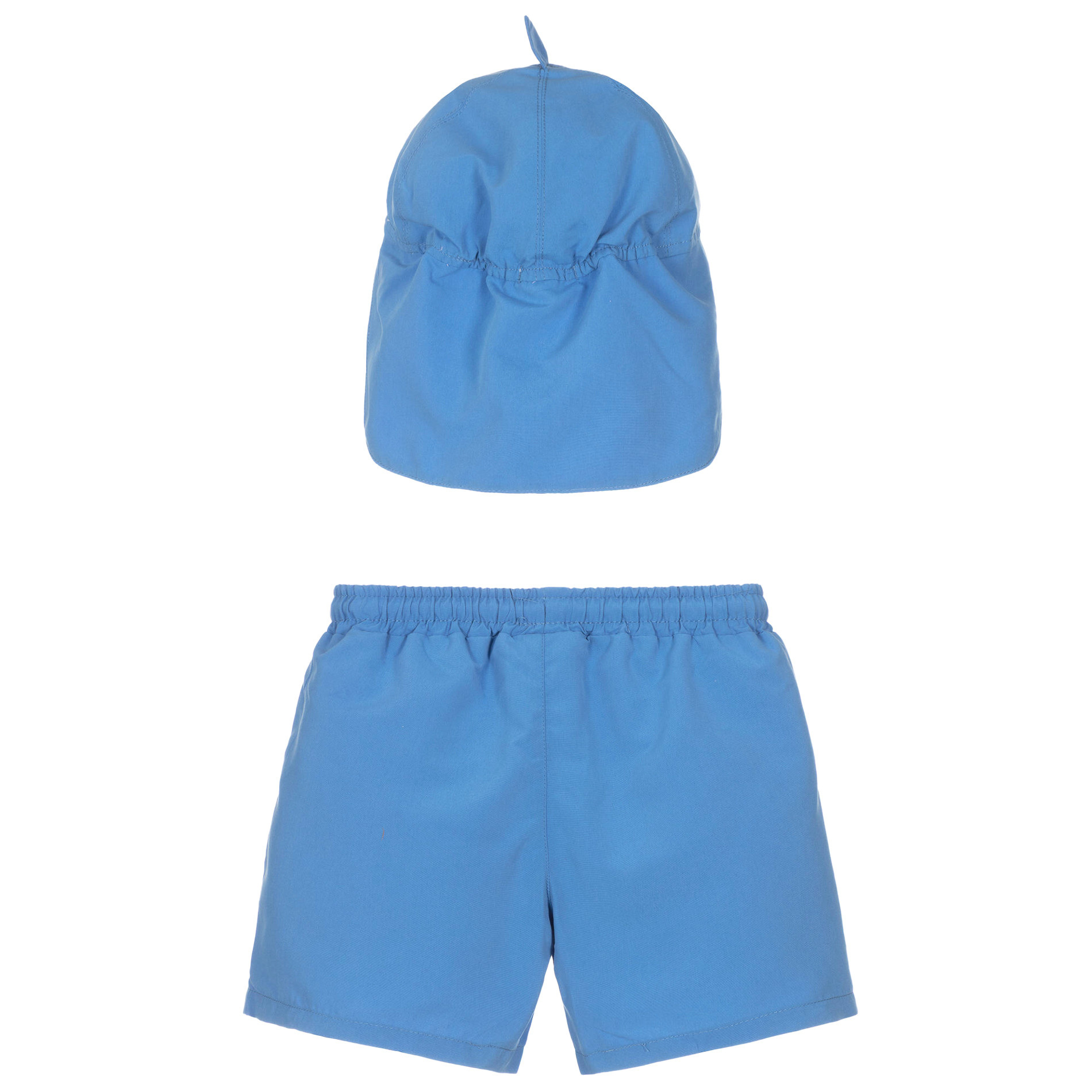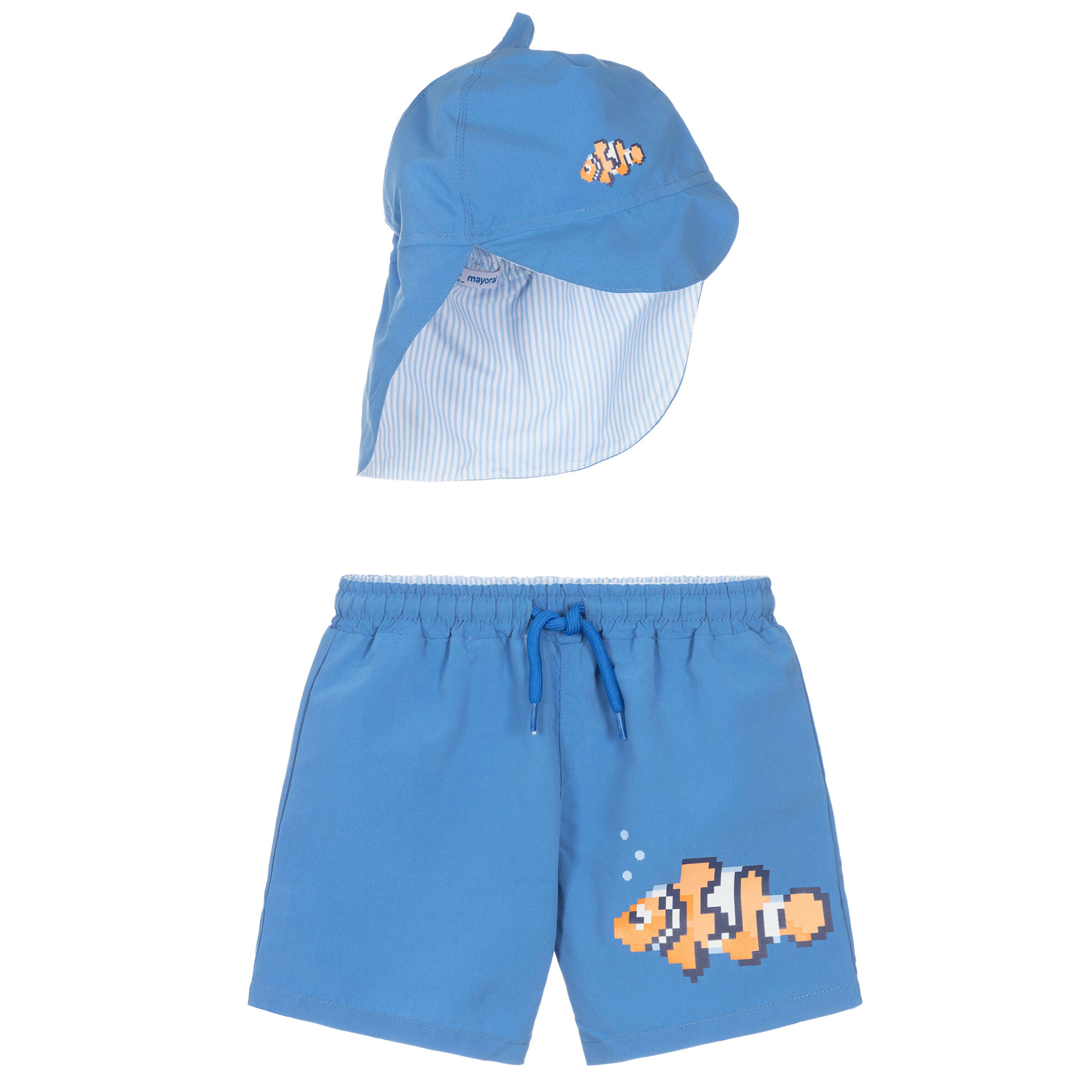 Mayoral baby boys blue swim set, featuring playful fish graphics, the set includes swim shorts with a comfortable drawstring waistband and soft mesh lining. A matching cap with an adorable fin detail and a protective neck flap completes the sweet look.