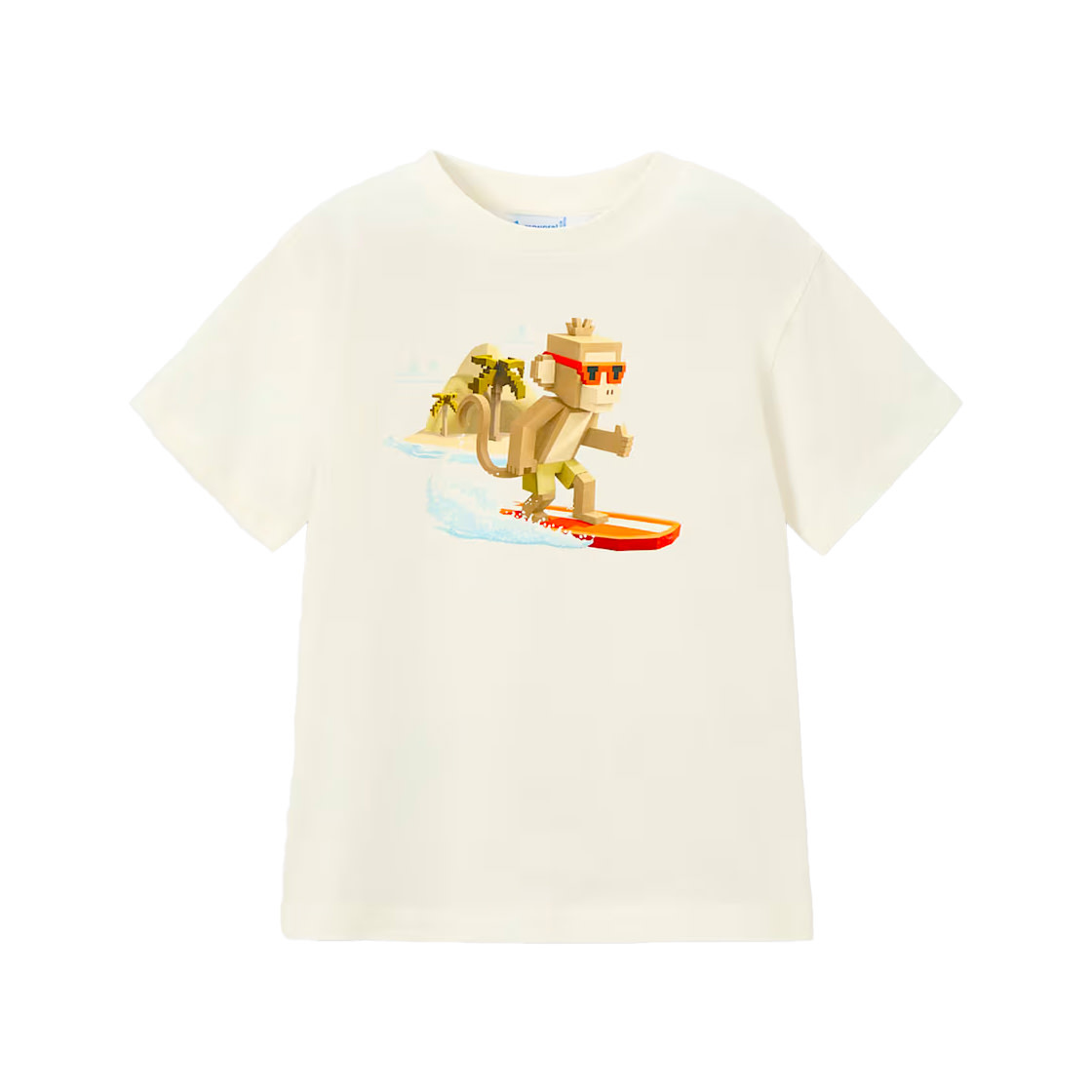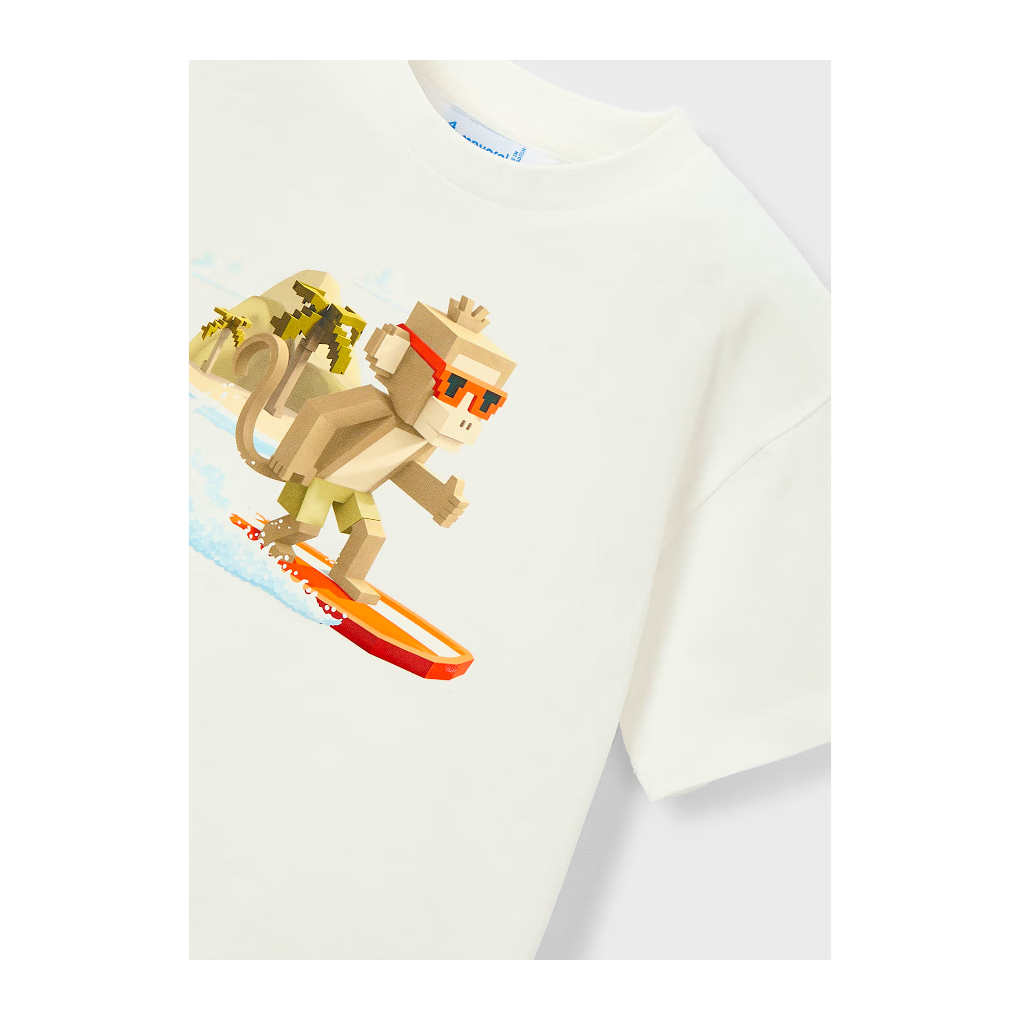 Mayoral boys casual ivory t-shirt, made in soft cotton jersey. This short-sleeved top has a cool pixelated monkey graphic on the front, surfing on a tropical wave for a modern finish.