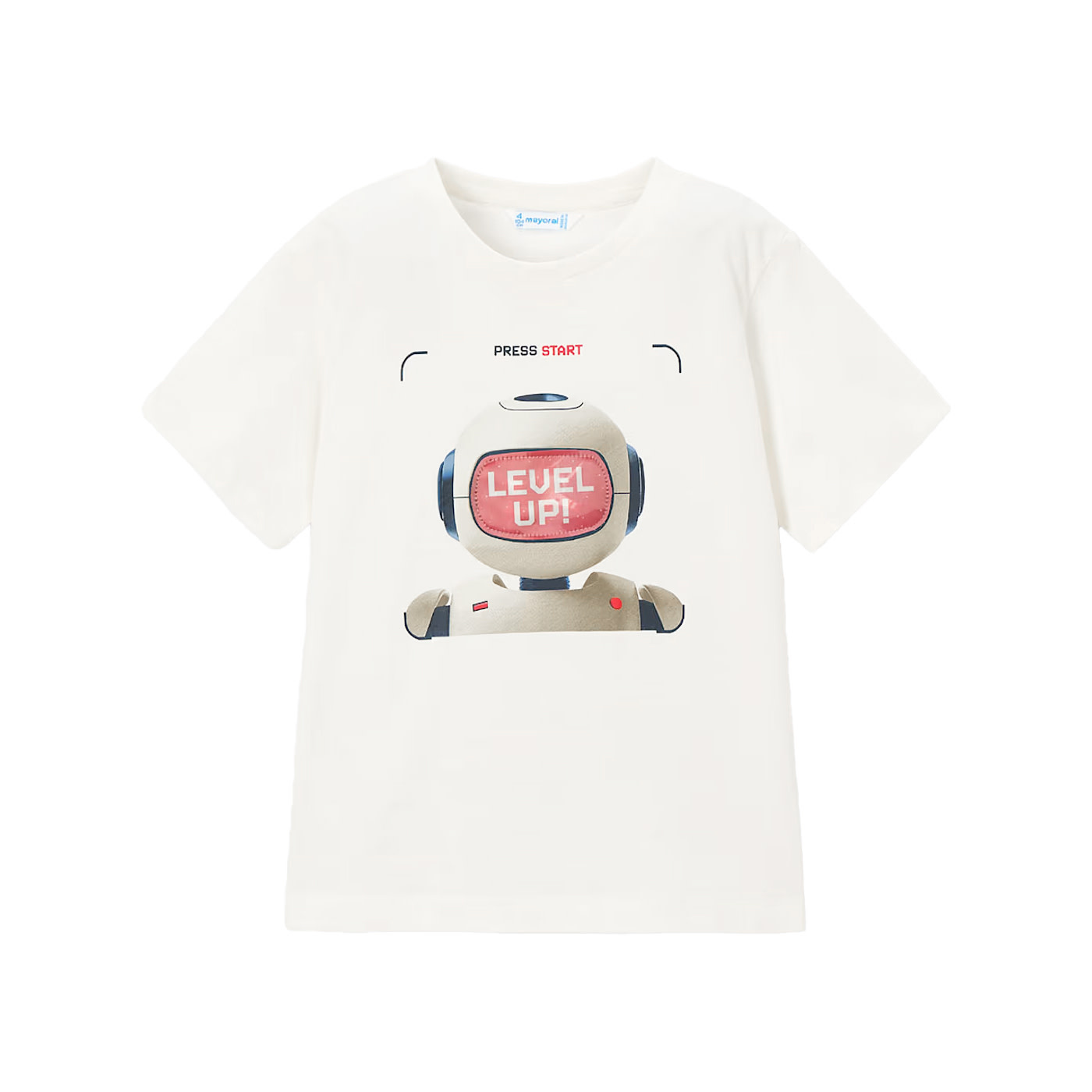 Mayoral boys ivory t-shirt features a cool lenticular robot graphic on the front, which alternates between a rocket ship and a level-up screen. Casual and comfortable, it is made in soft cotton jersey with a classic crew neckline