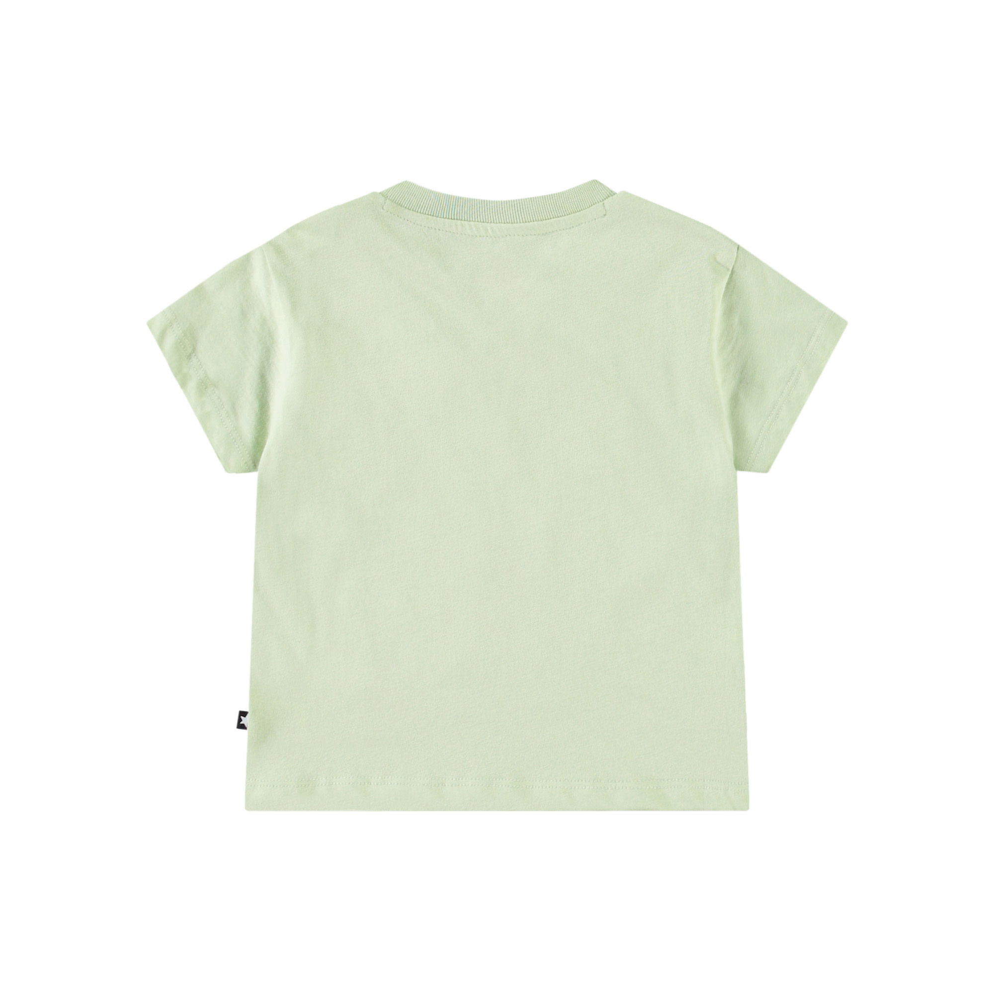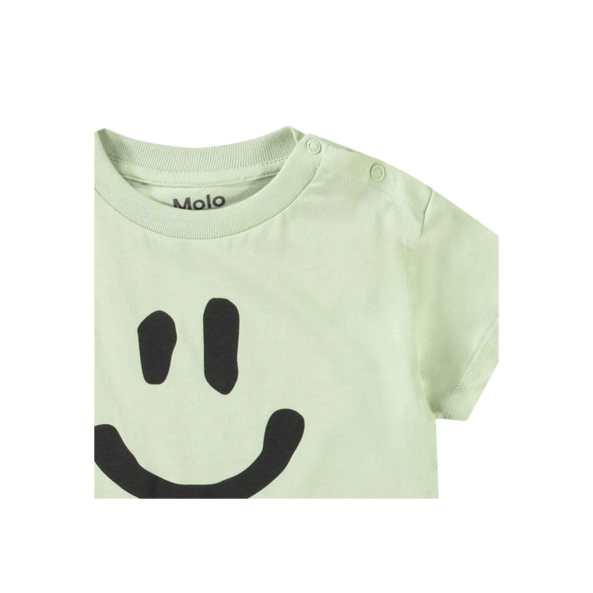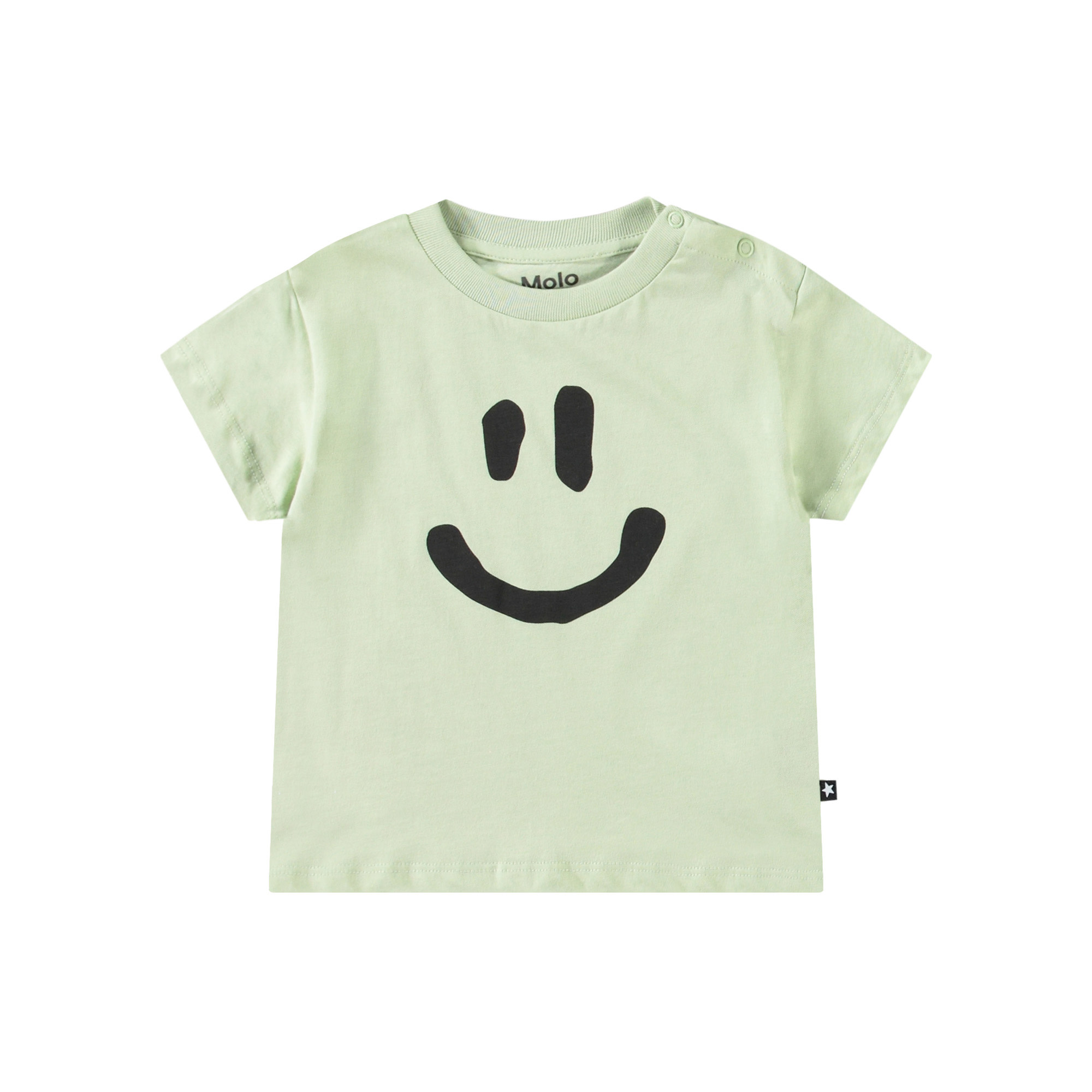 Classic t-shirt for the little ones in 100% organic cotton. The t-shirt has a loose fit, round neckline with ribbed edge, and button fastening on the left shoulder, making it easy to put on. The t-shirt is light green with a smiling face.