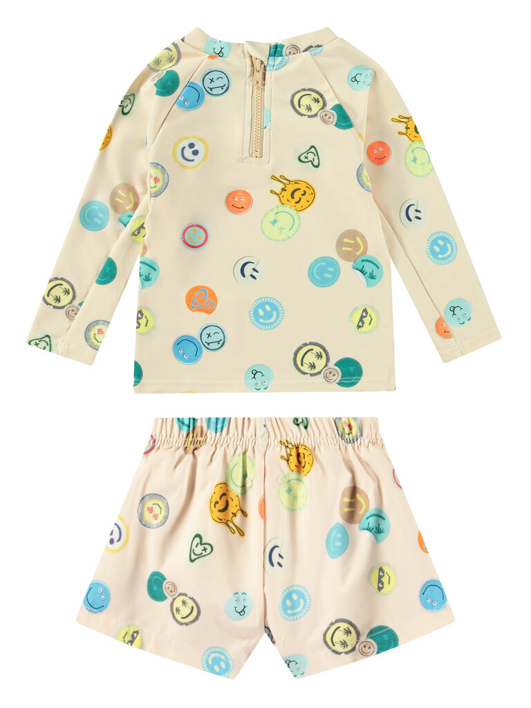 Rash guard set with UV protection 50+, in a print of colorful smiling faces. The shirt has a snug fit, a zip closure at the back, and long raglan sleeves to protect against the sun's rays. Sporty swim shorts have an elastic waistband & drawstring.