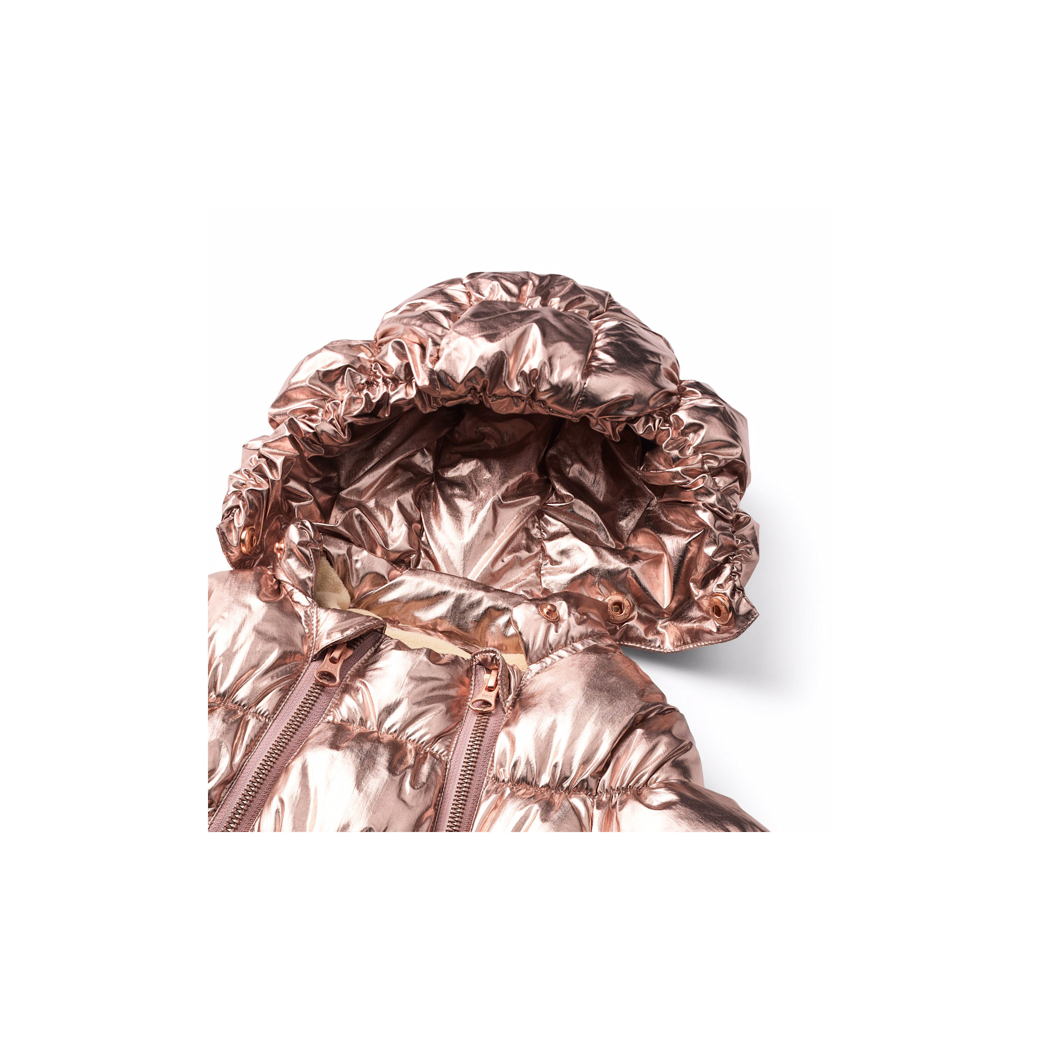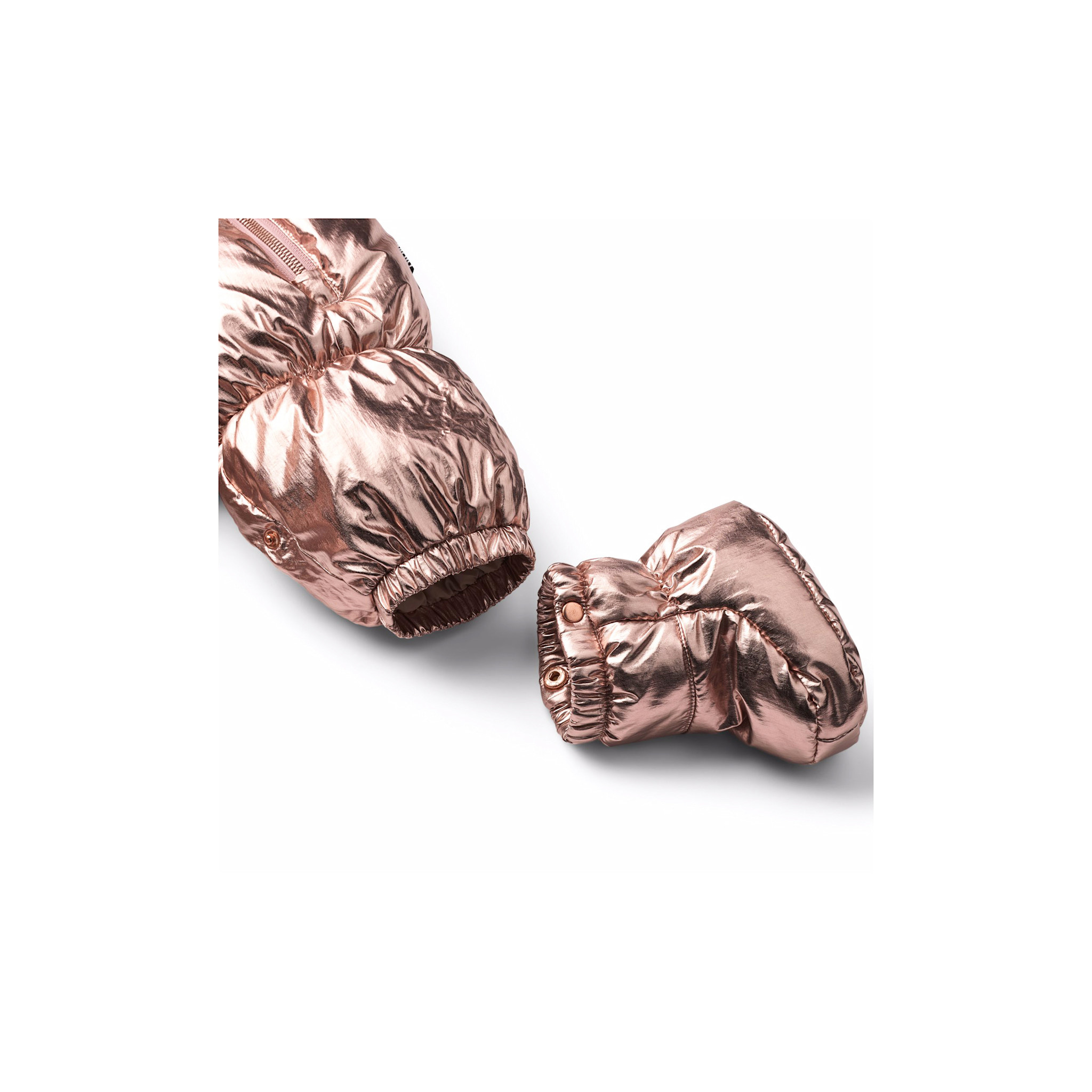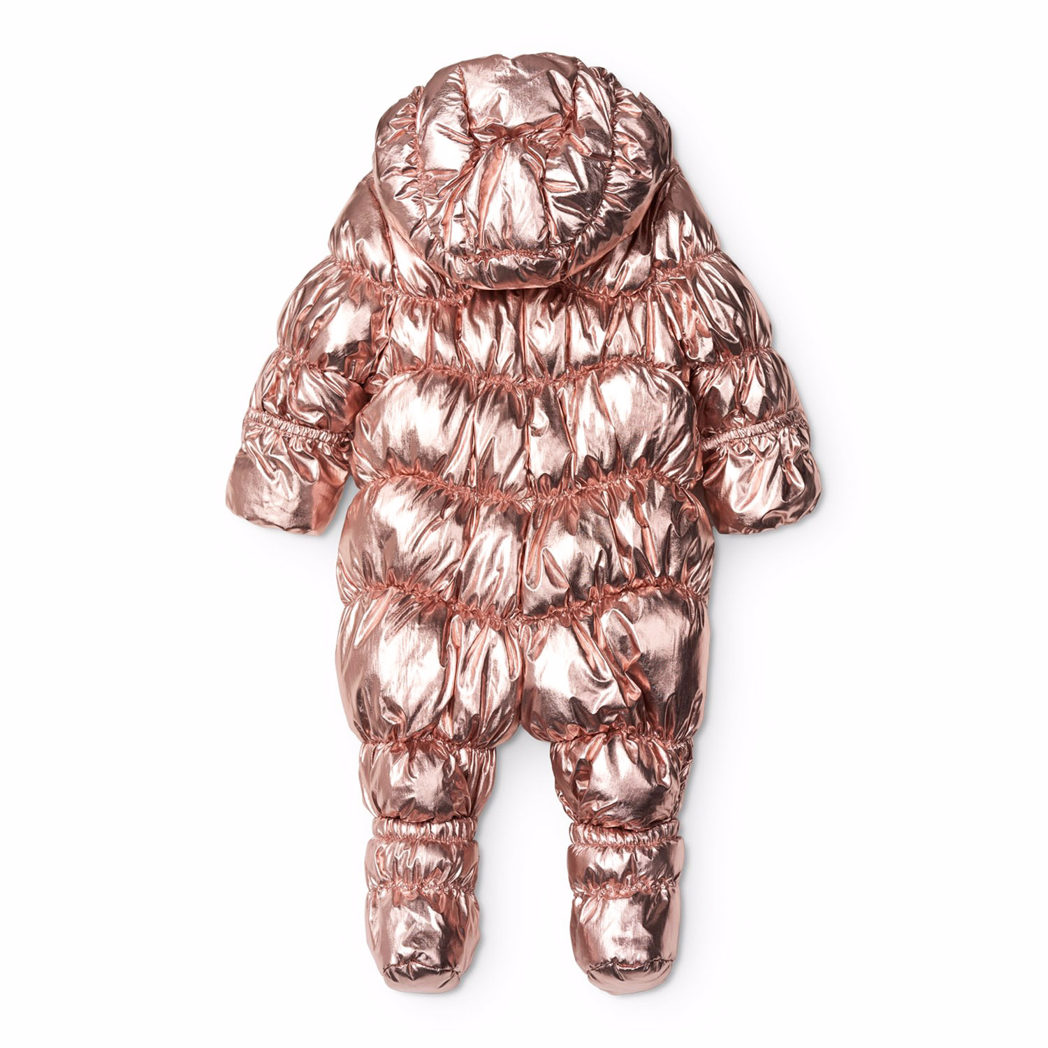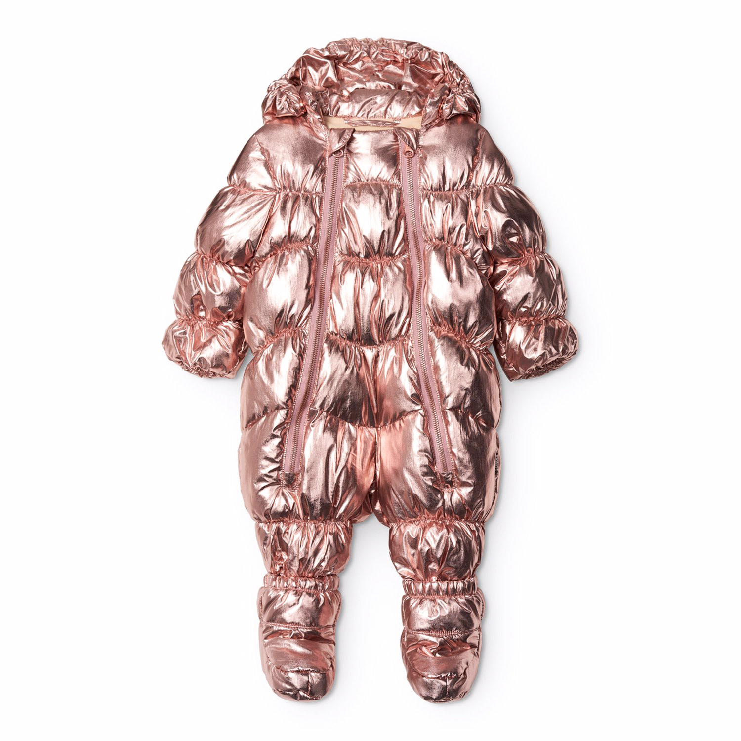 Copper-colored baby suit suitable for walks in the pram on cold days. The suit is equipped with two zippers on the front that make it easy to put on and take off, a detachable hood, and small detachable feet that easily click on and off with buttons.