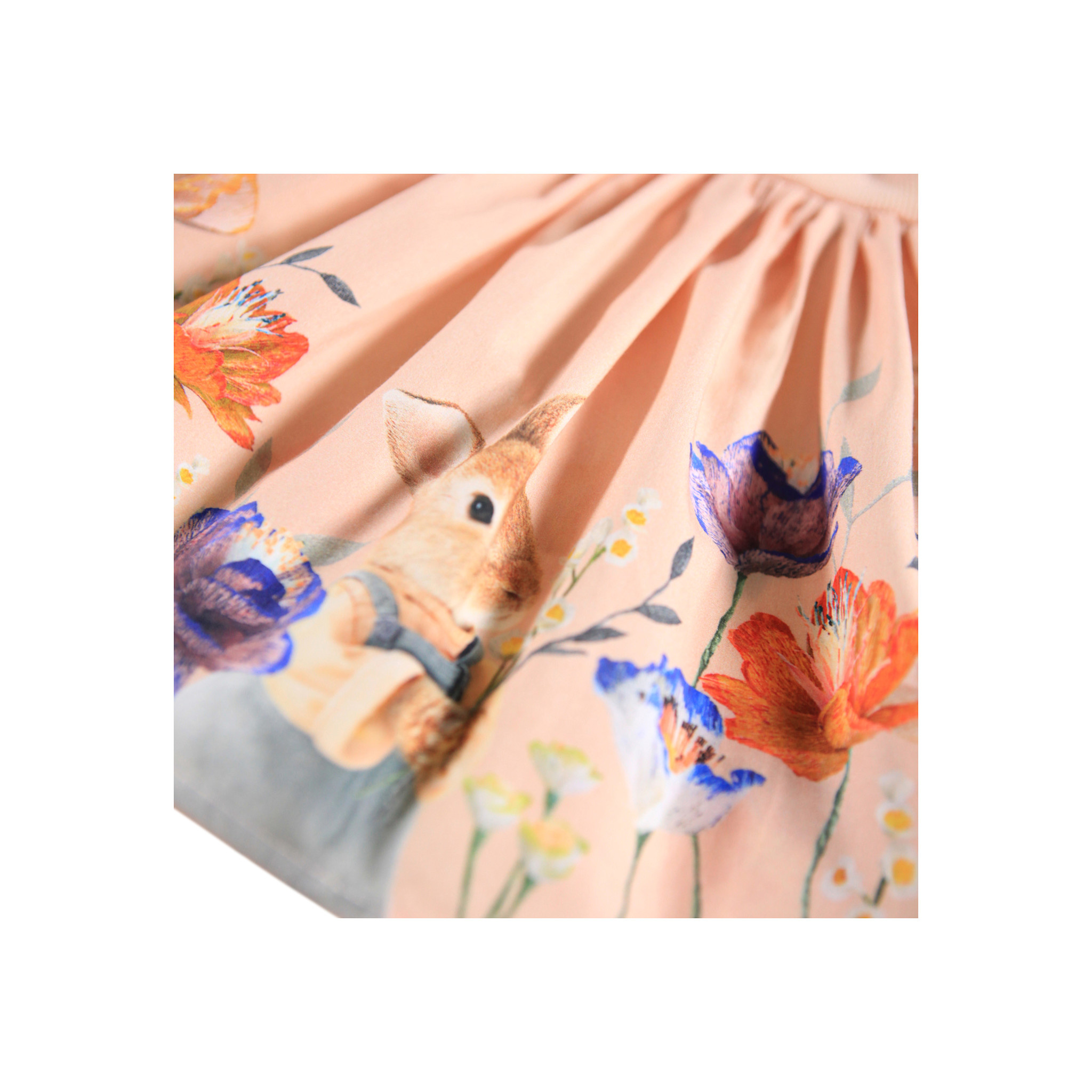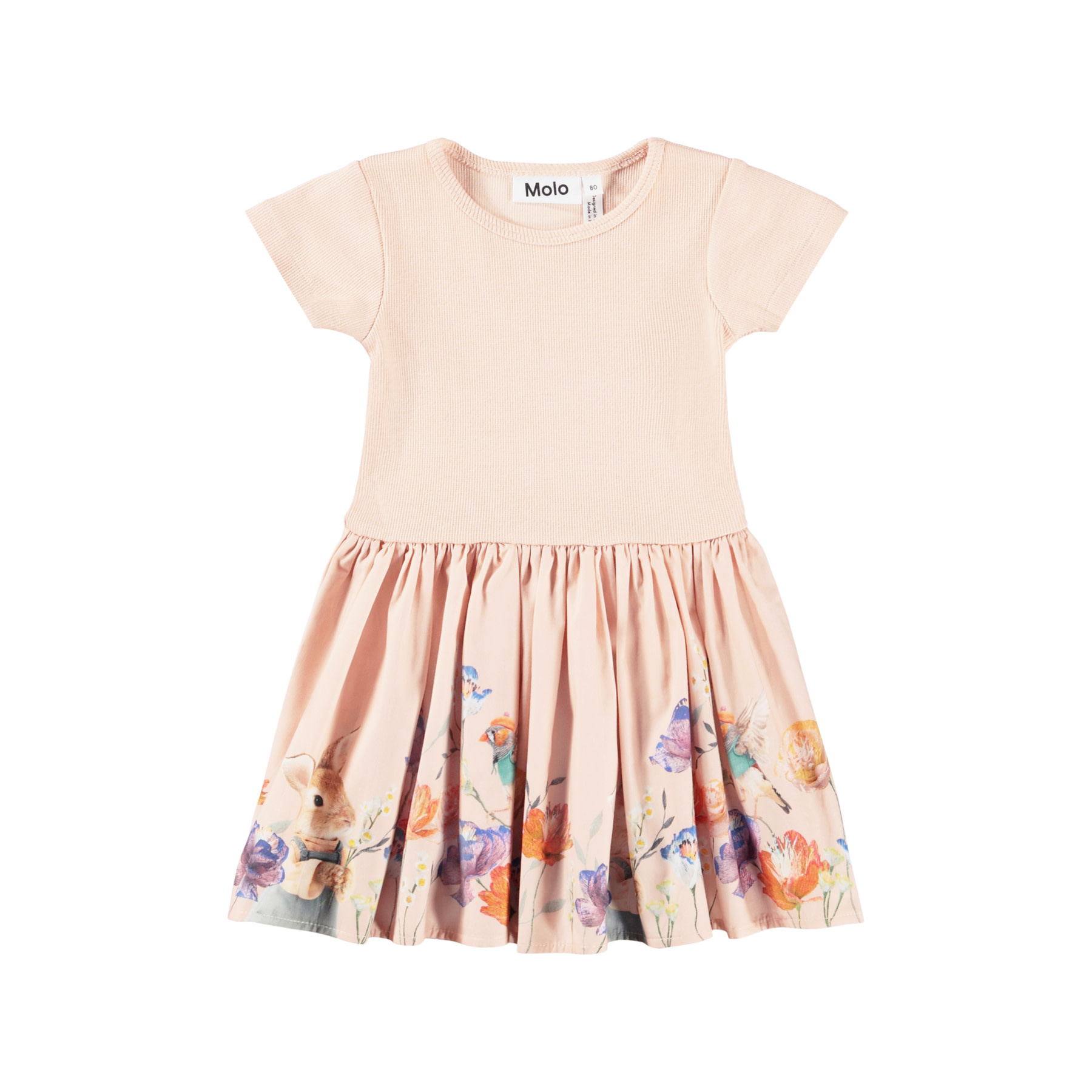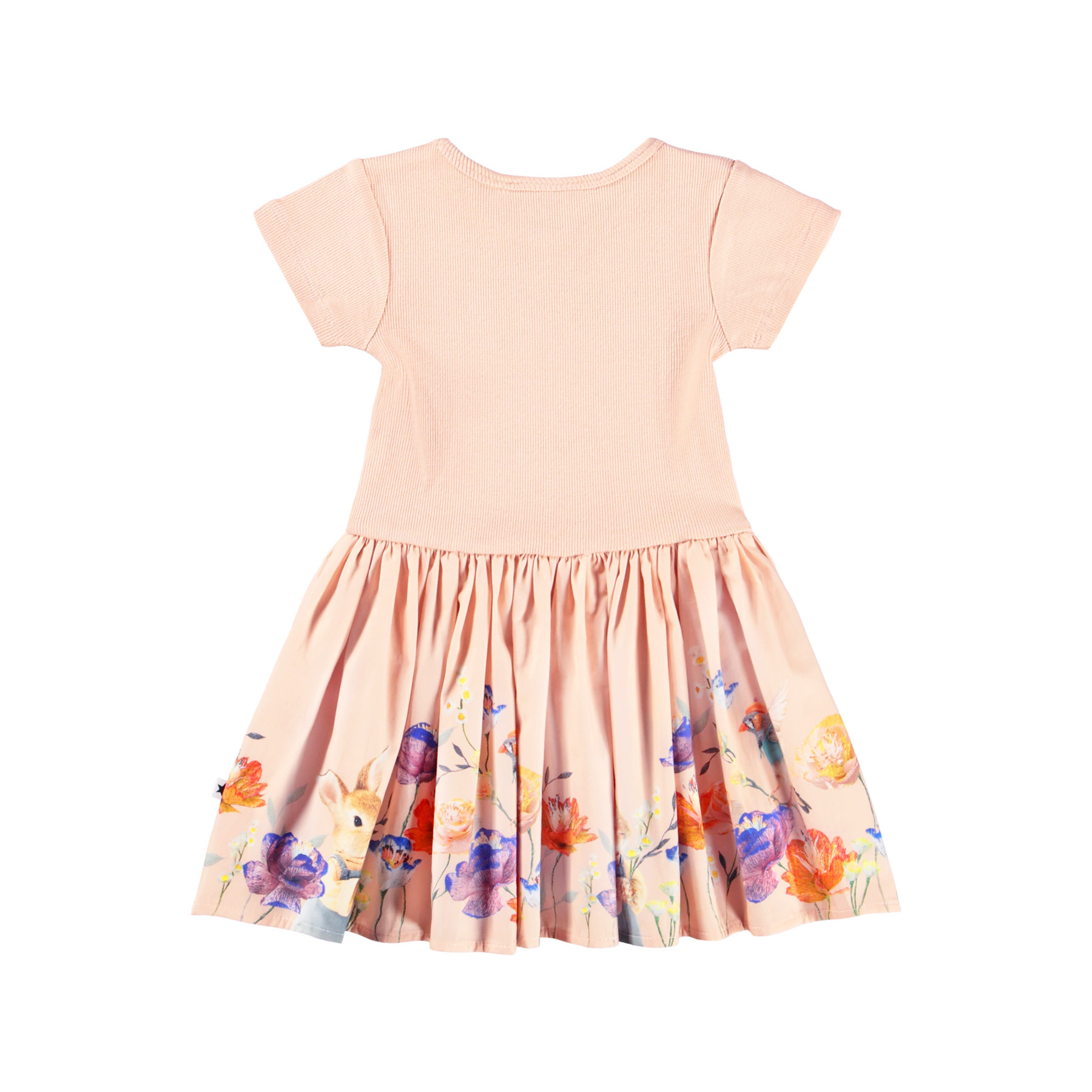 Rose dress made of 100% organic cotton. The skirt has a print of cute animals dressed in clothes & beautiful flowers. The top is close-fitted in ribbed jersey, while the skirt is in poplin, giving the dress volume.
