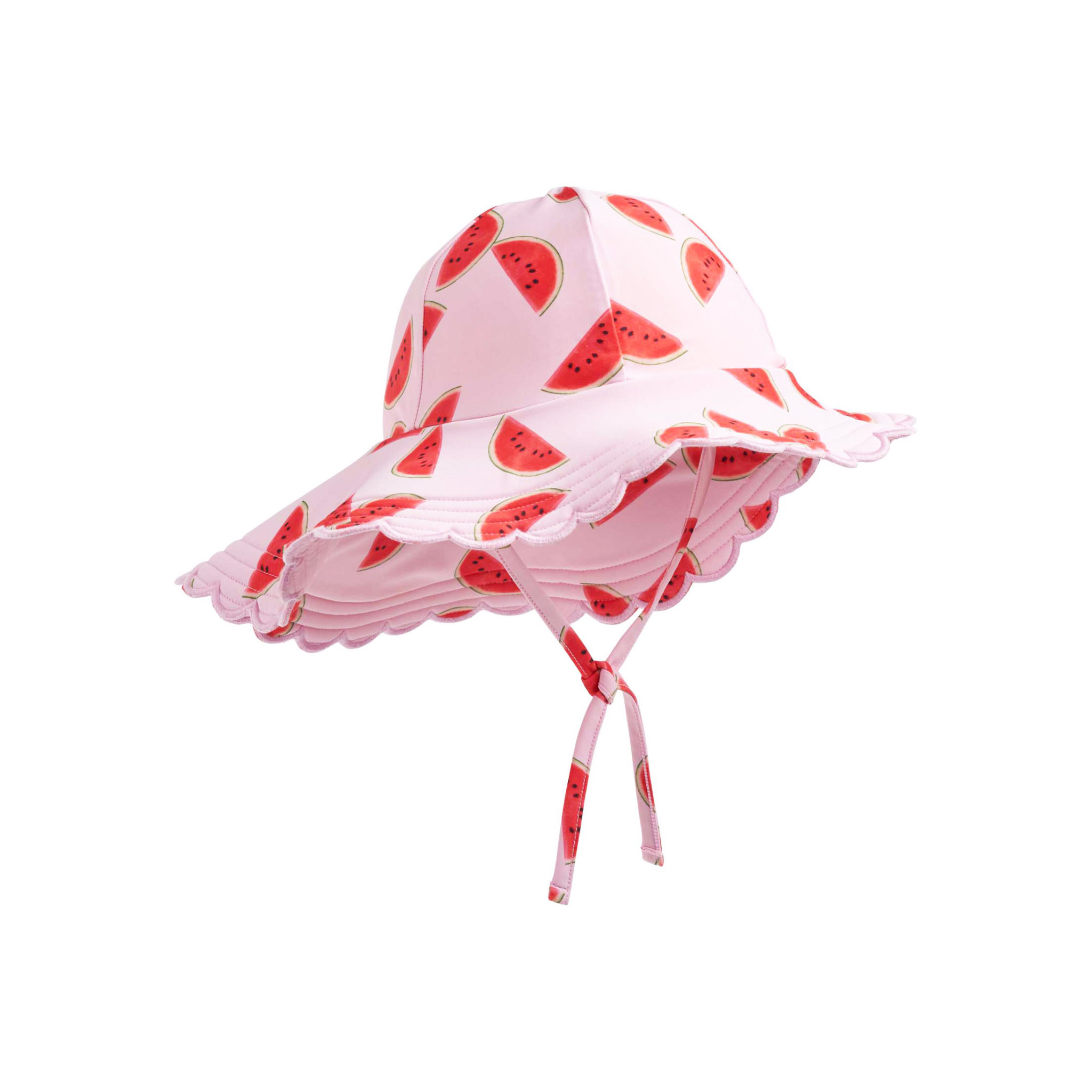 Sun hat with 50+ UV protection, a wide brim and longer on the back to best protect a child. The sun hat is in a print of watermelon slices.