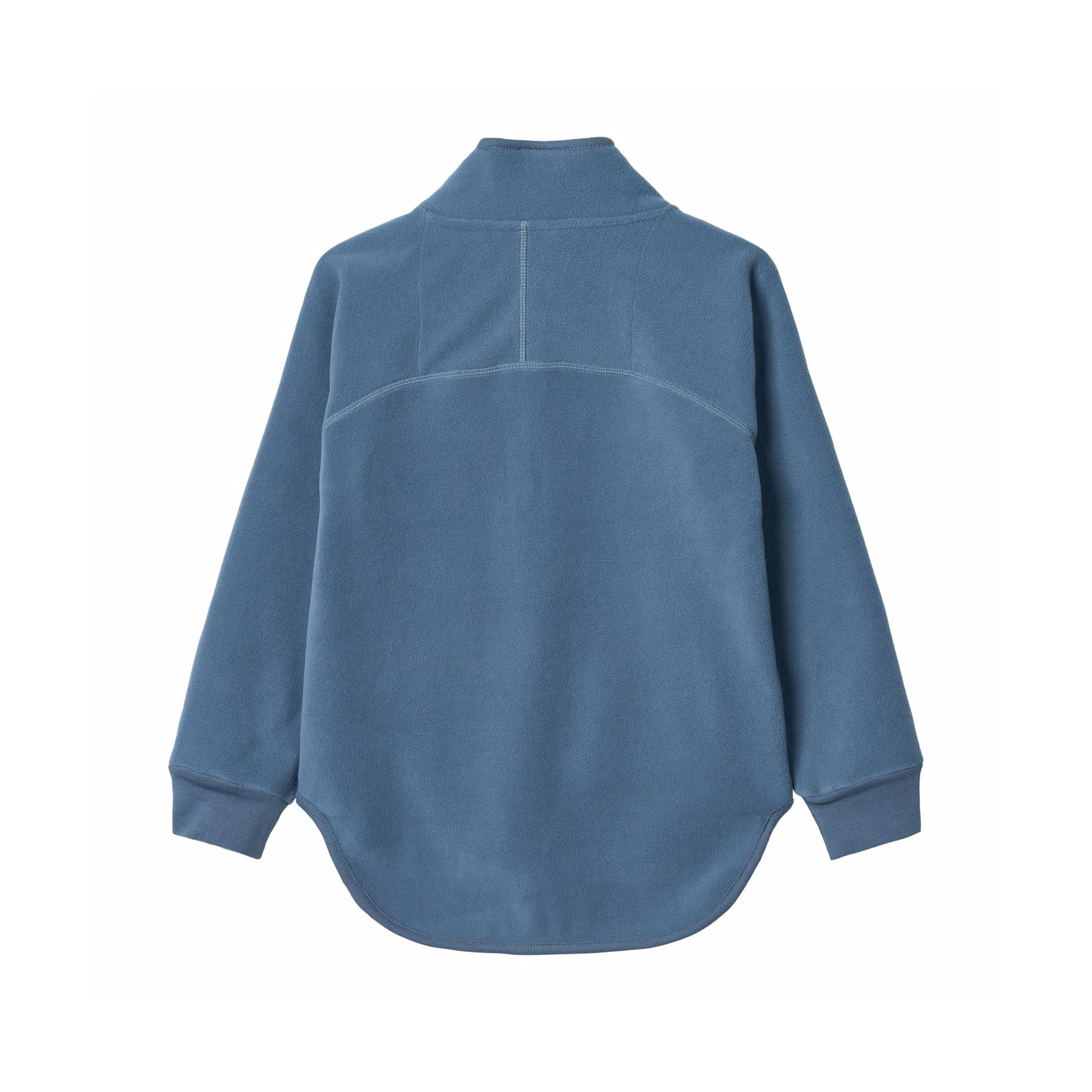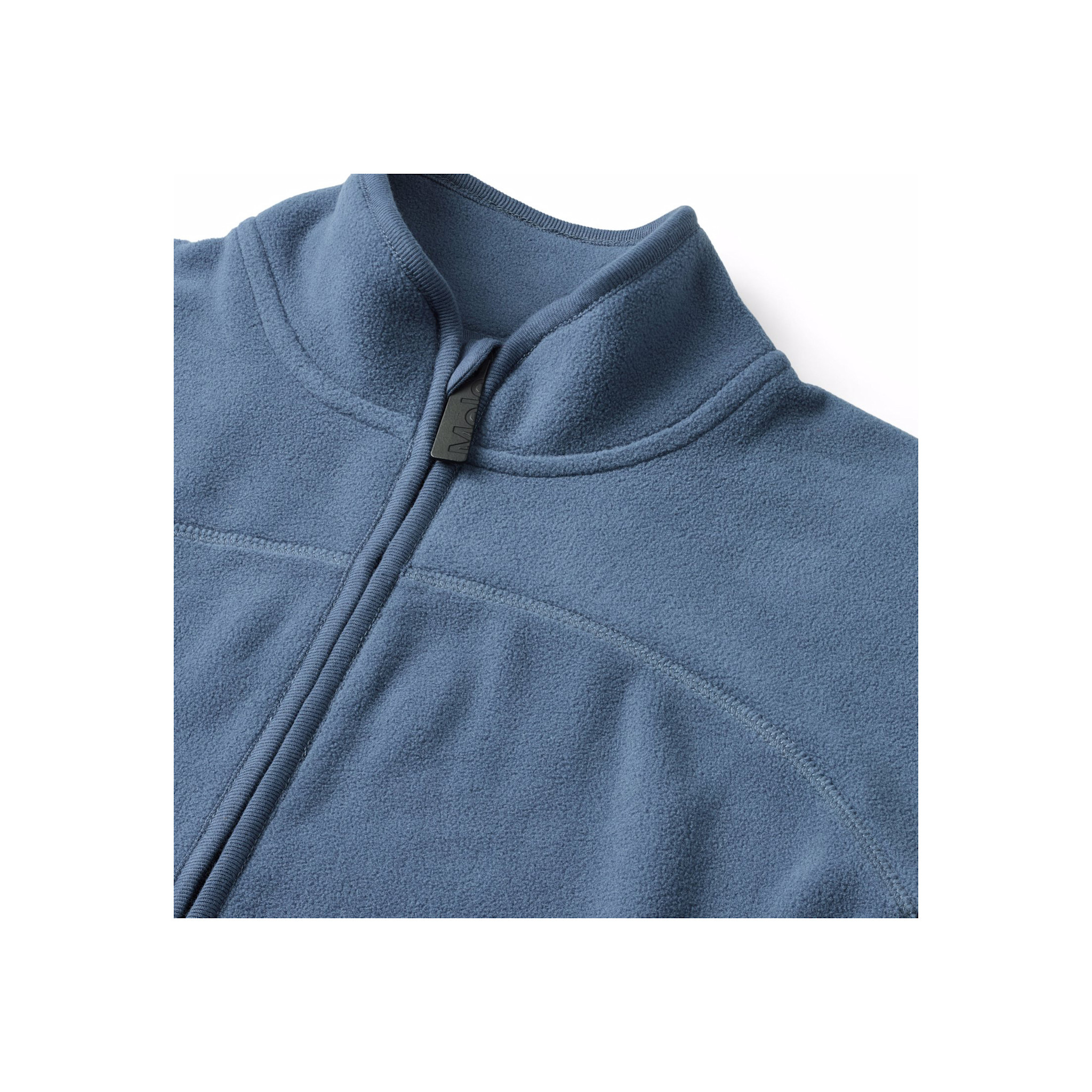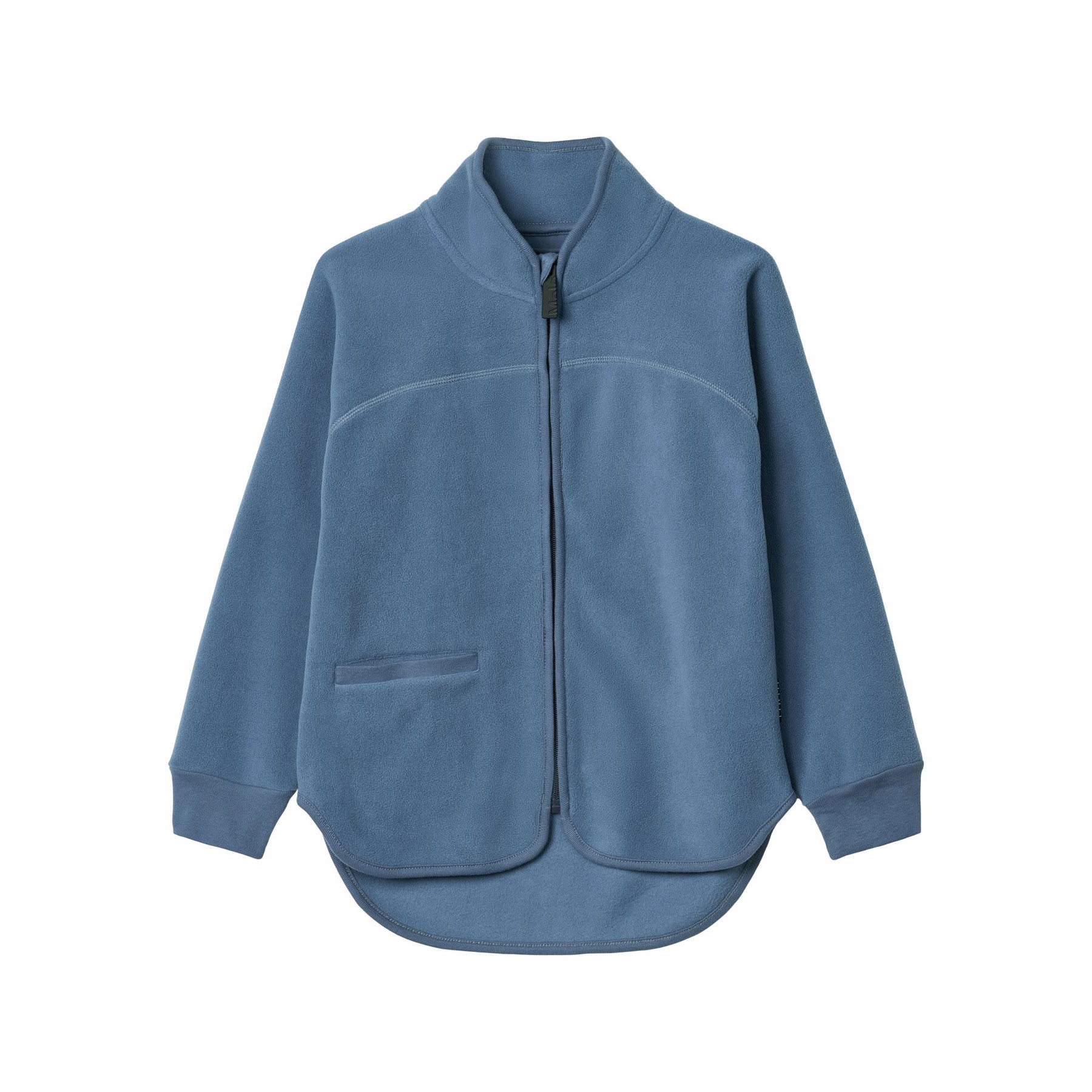 Blue fleece jacket with matching ribbed edges. The jacket has a high collar, a front zipper, a front pocket and an extended back cut. It is soft, has a regular fit and works well both on its own or as an extra layer under a jacket.