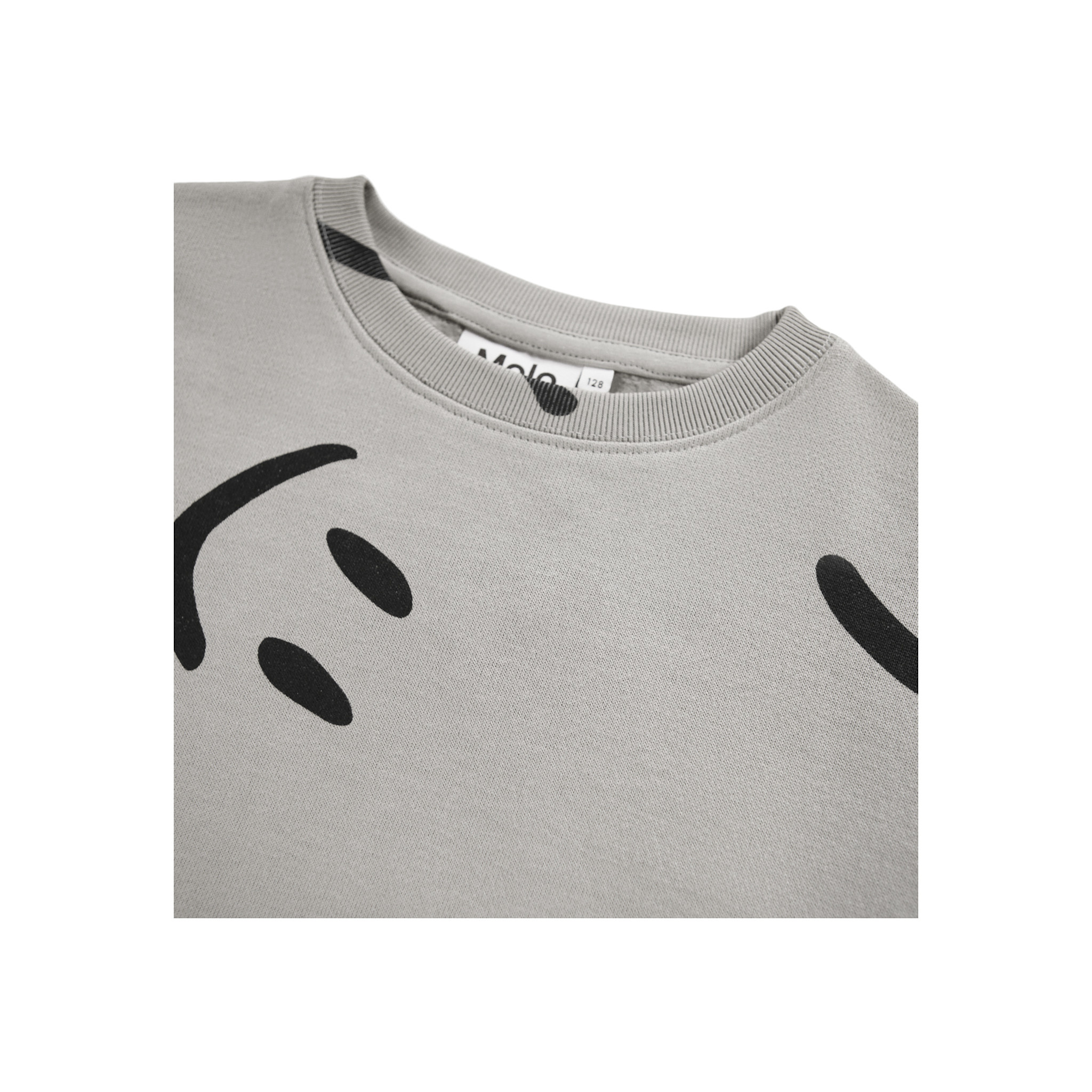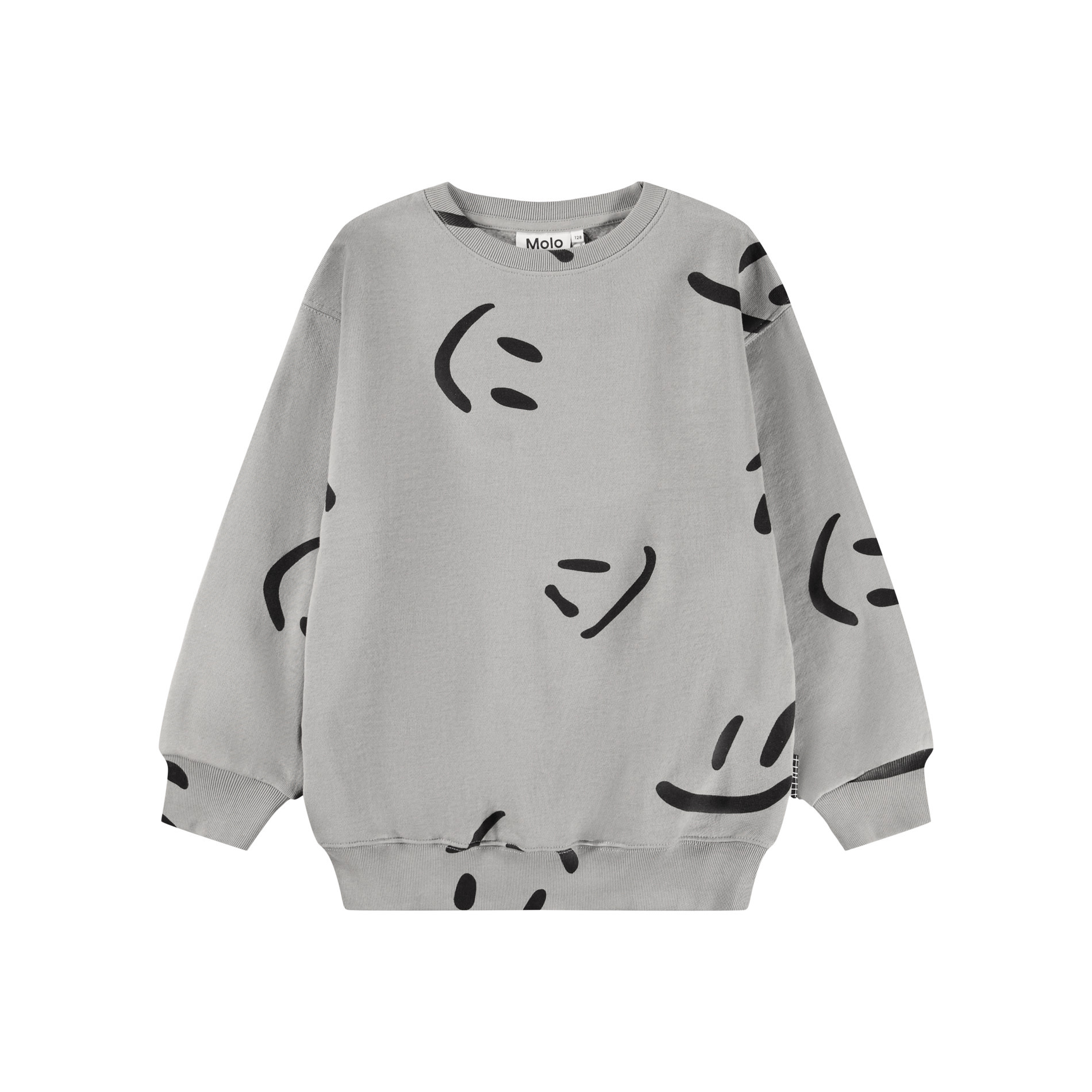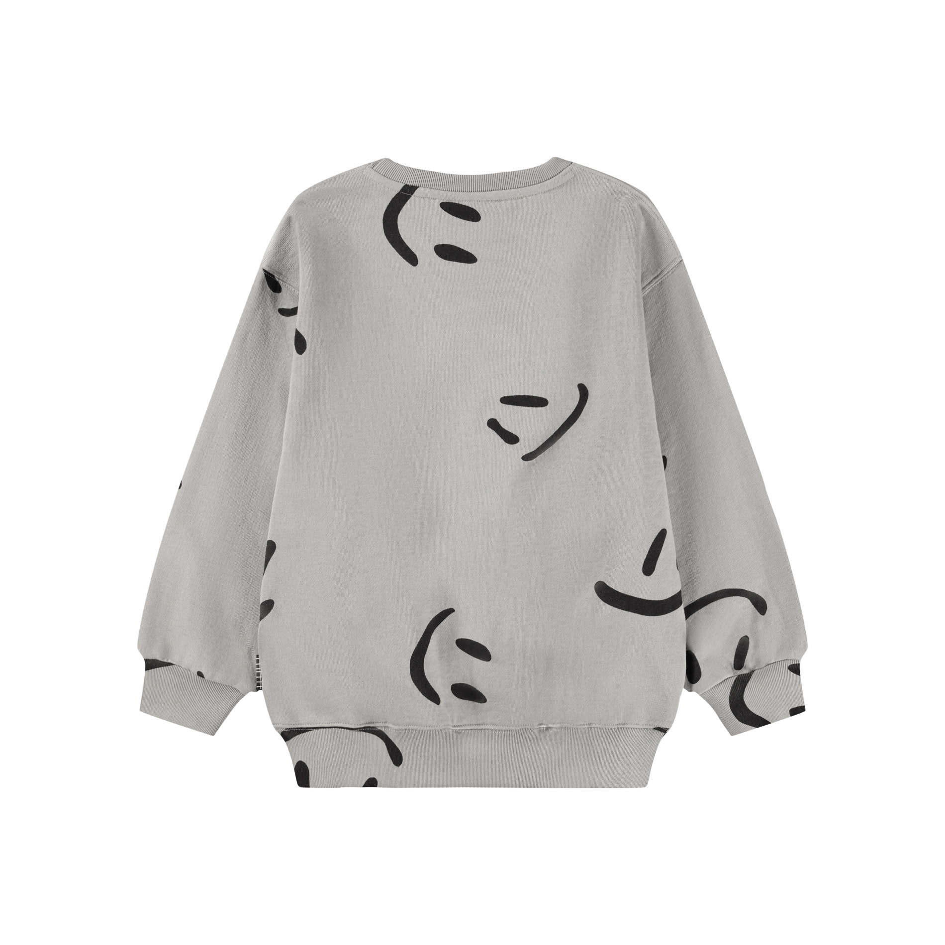 Grey sweatshirt in soft 100% organic cotton with ribbed edges at the neck, sleeves, and bottom of the sweatshirt. The sweatshirt has a loose fit with an all-over print of black smiley faces. Pair with matching pants for a complete set.