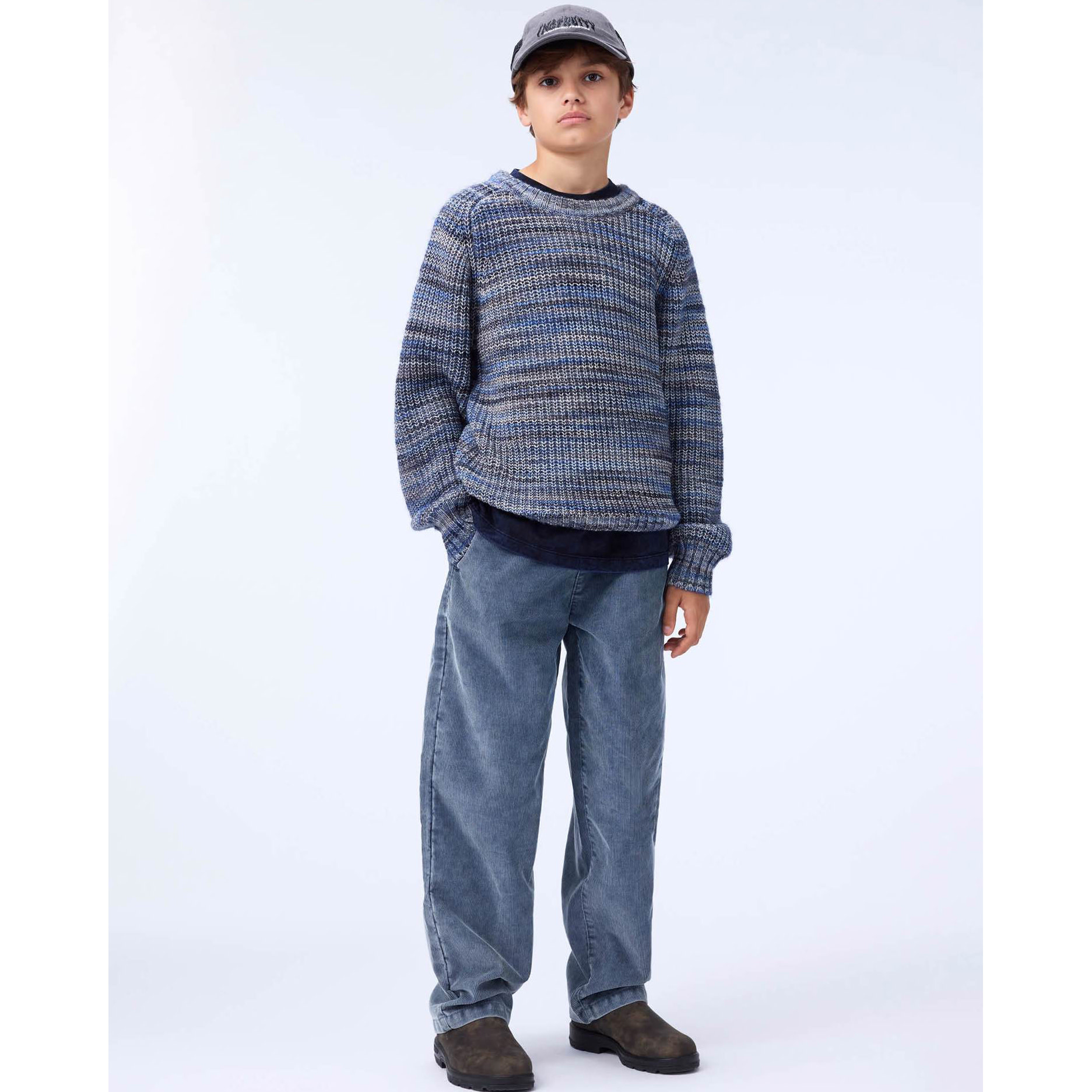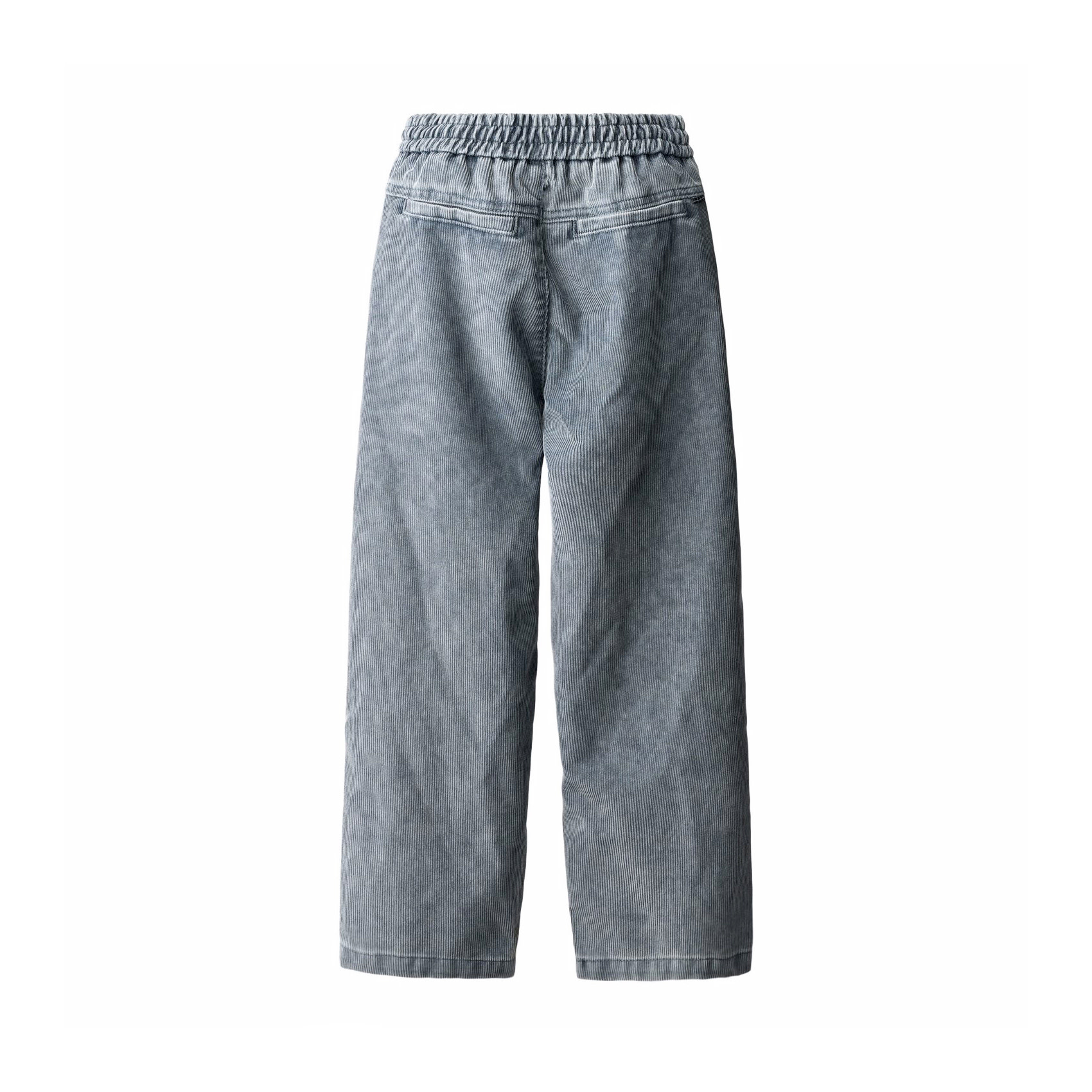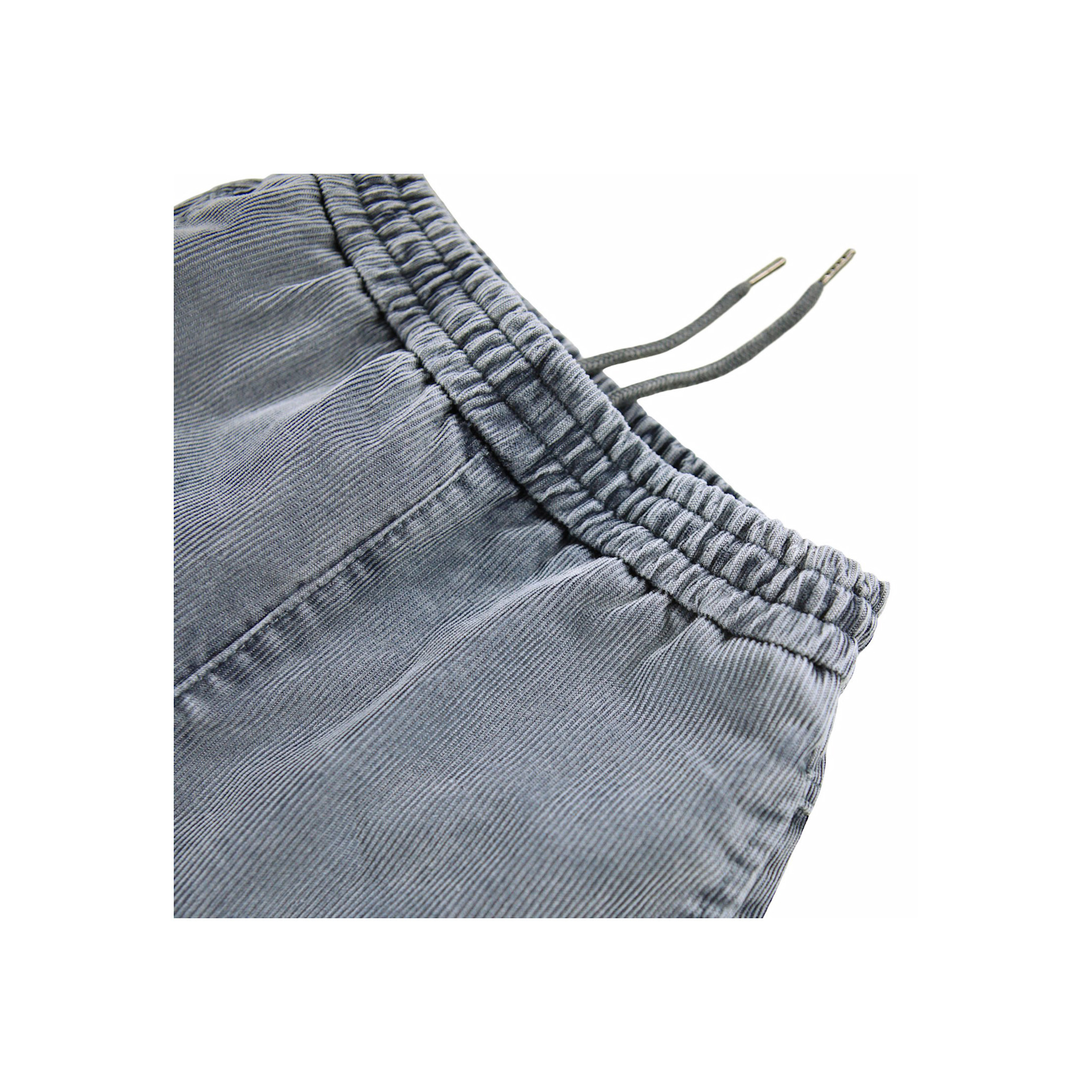 Grey velvet pants with elastic waist, internal drawstring, side pockets and back pockets. The pants have a loose fit.