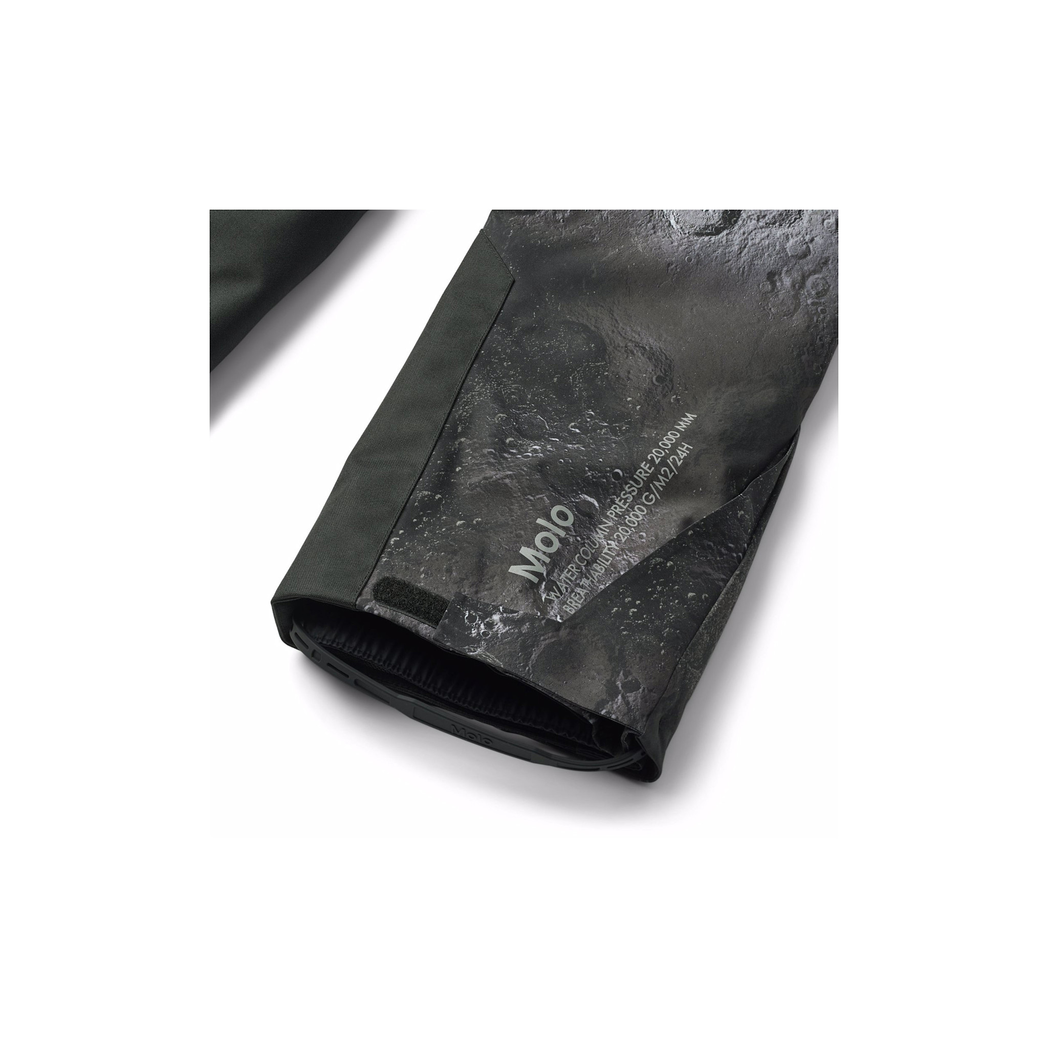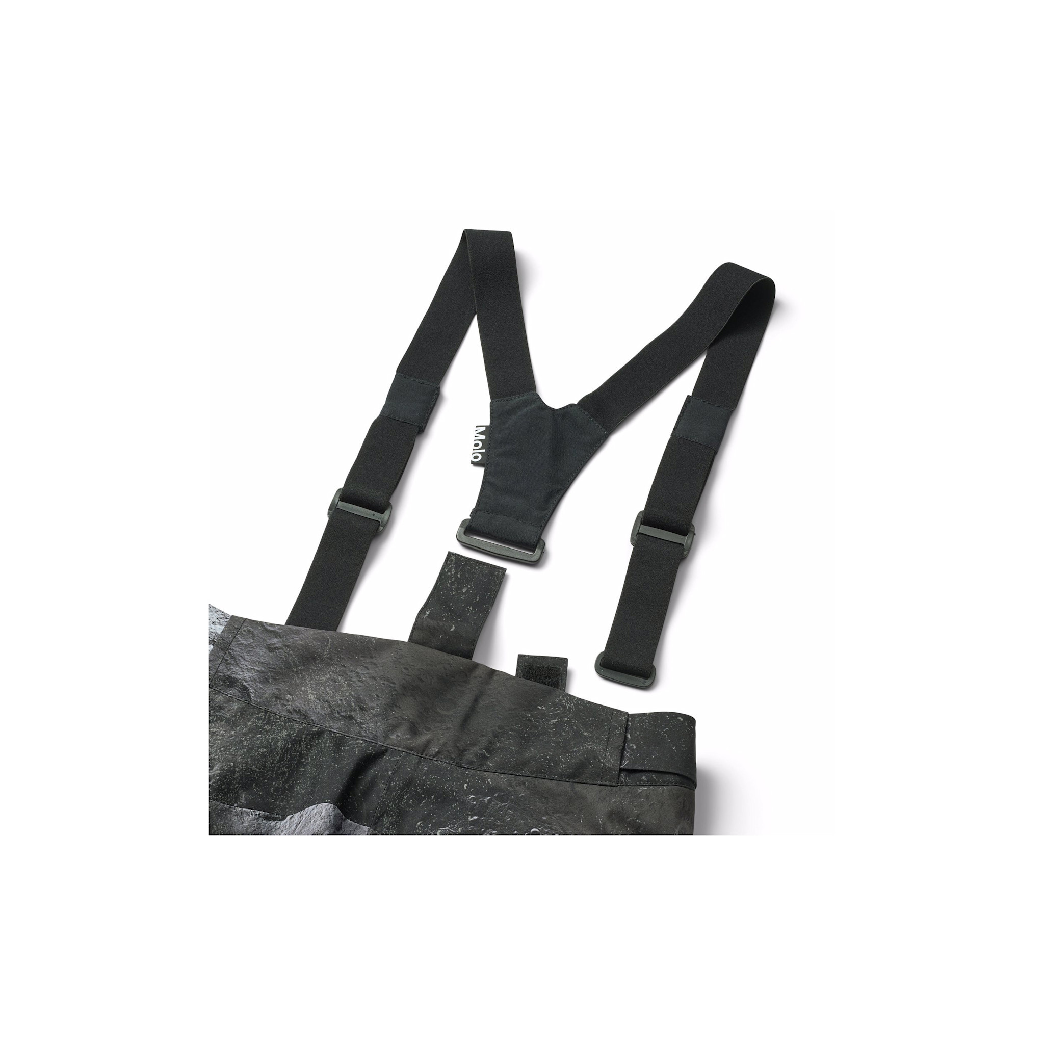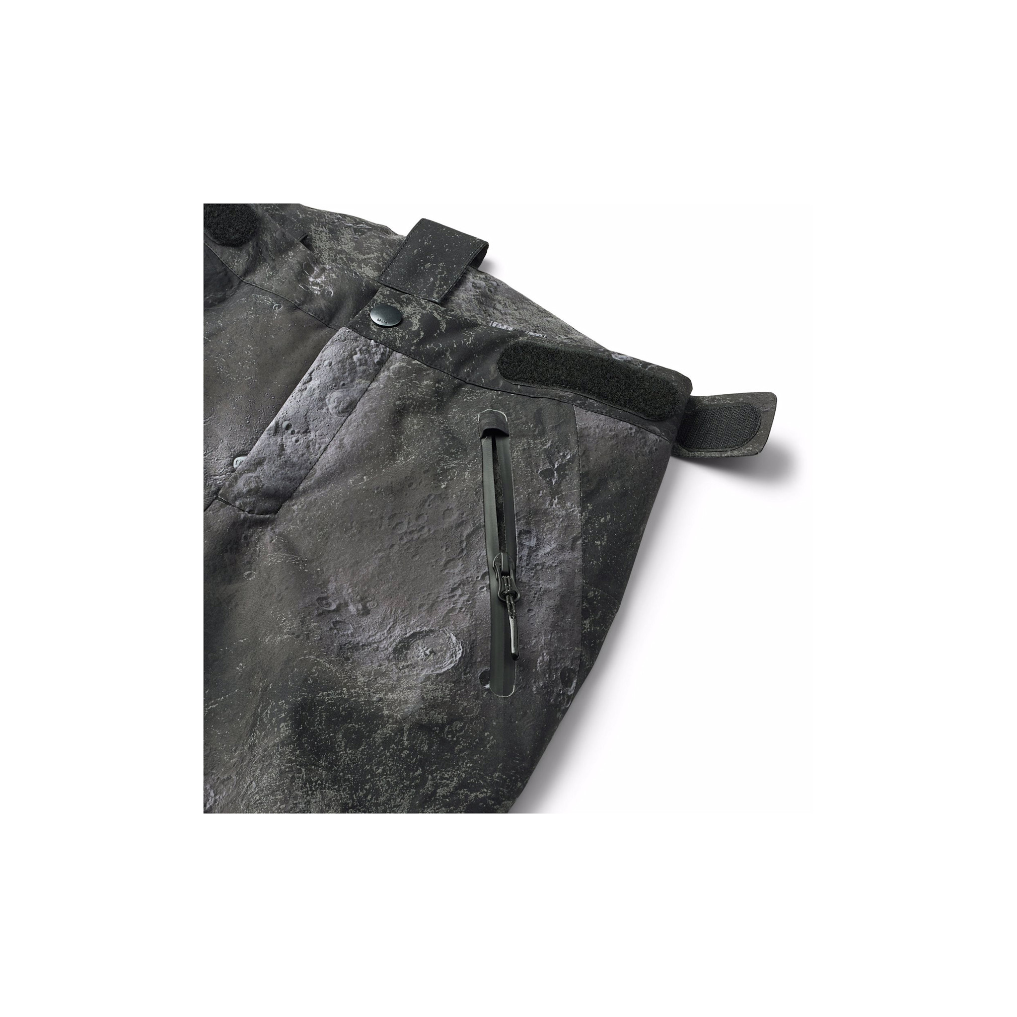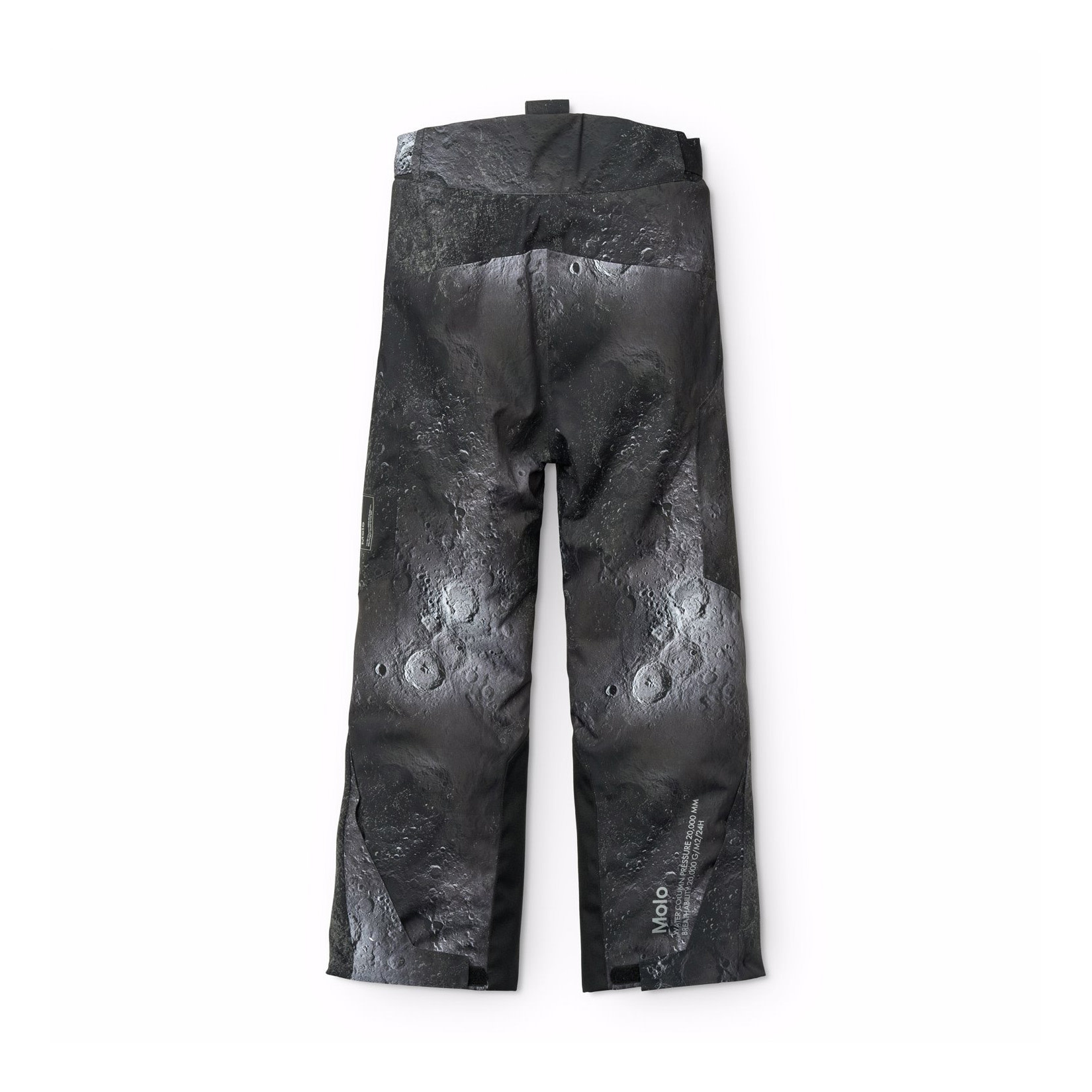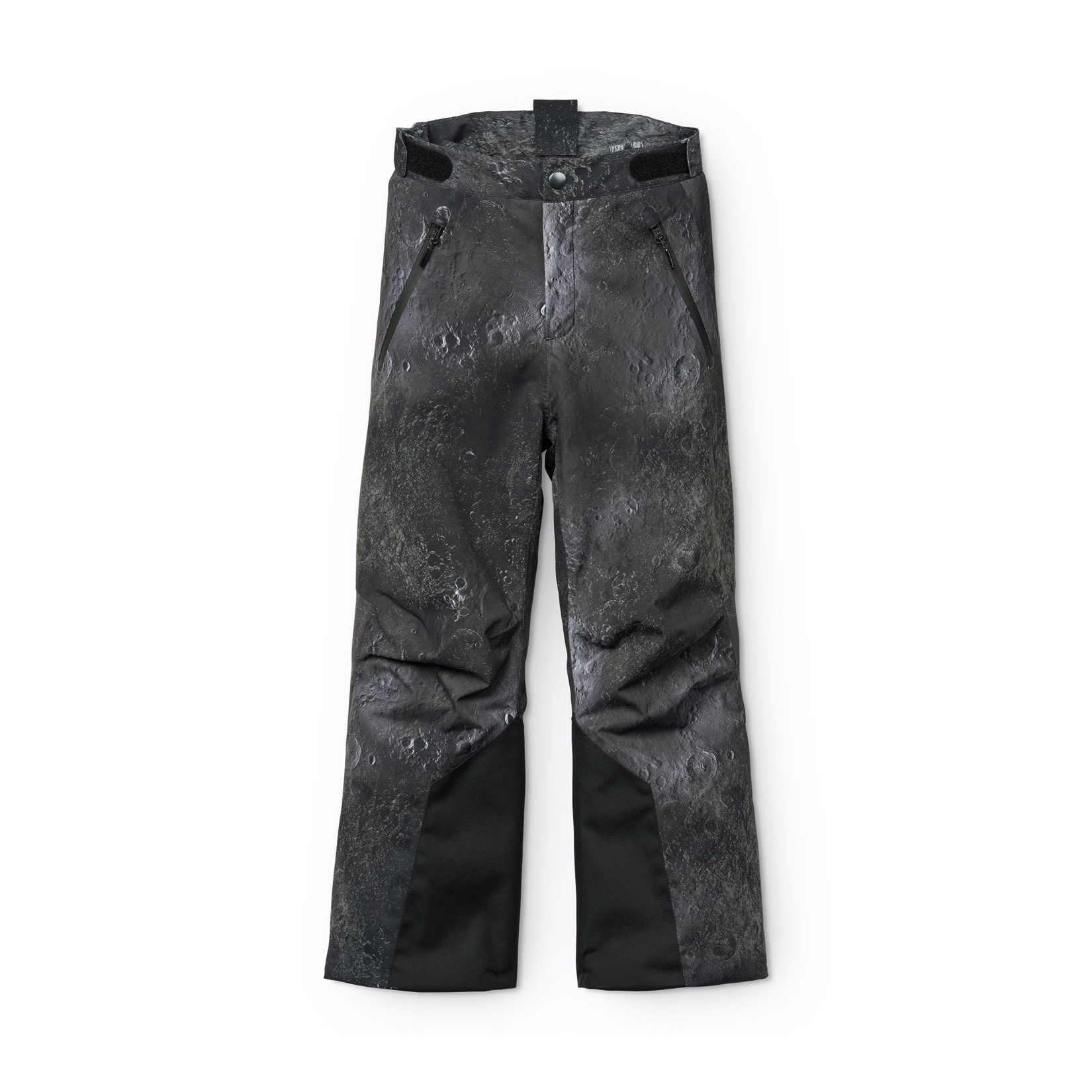 Wind and waterproof ski pants made of recycled polyester with a print of the moon's raw structures and its dark and light shades.