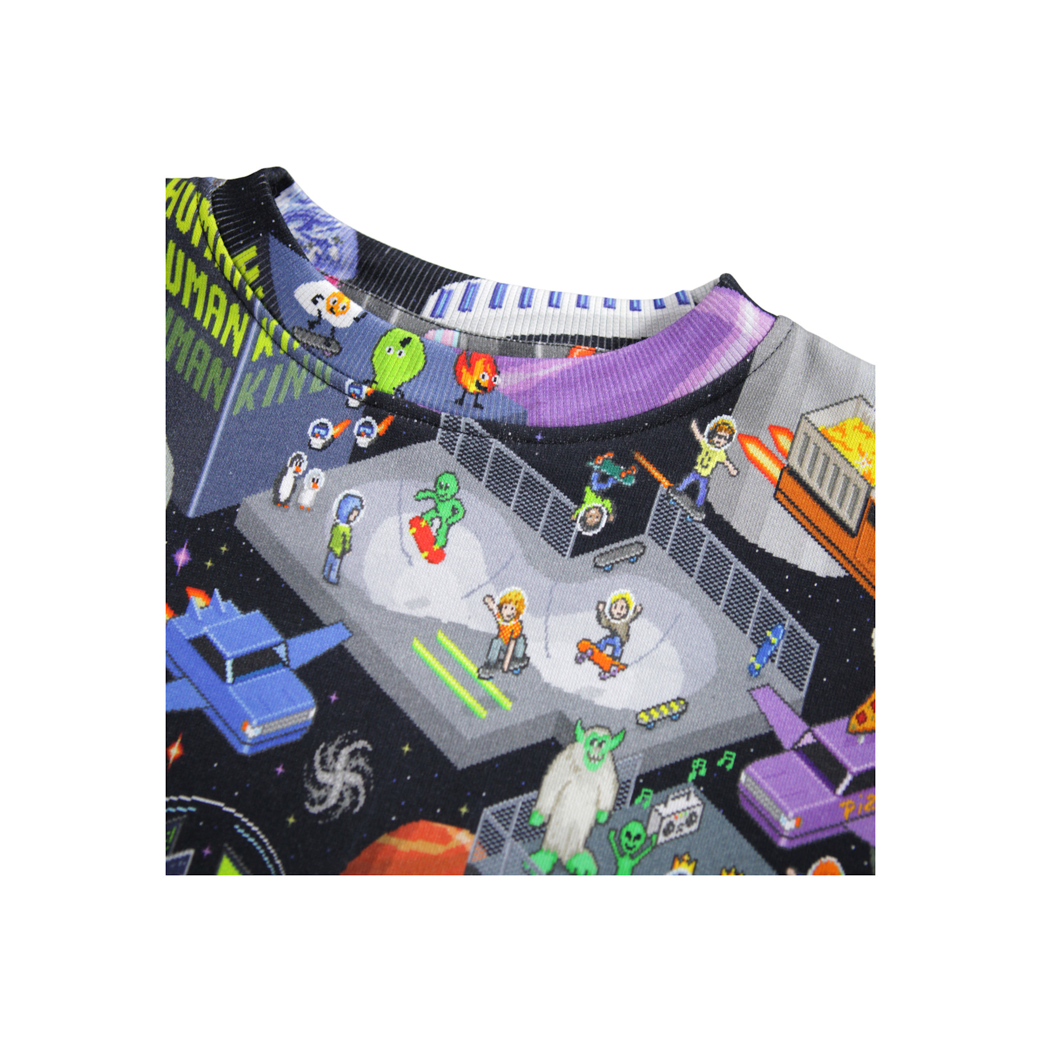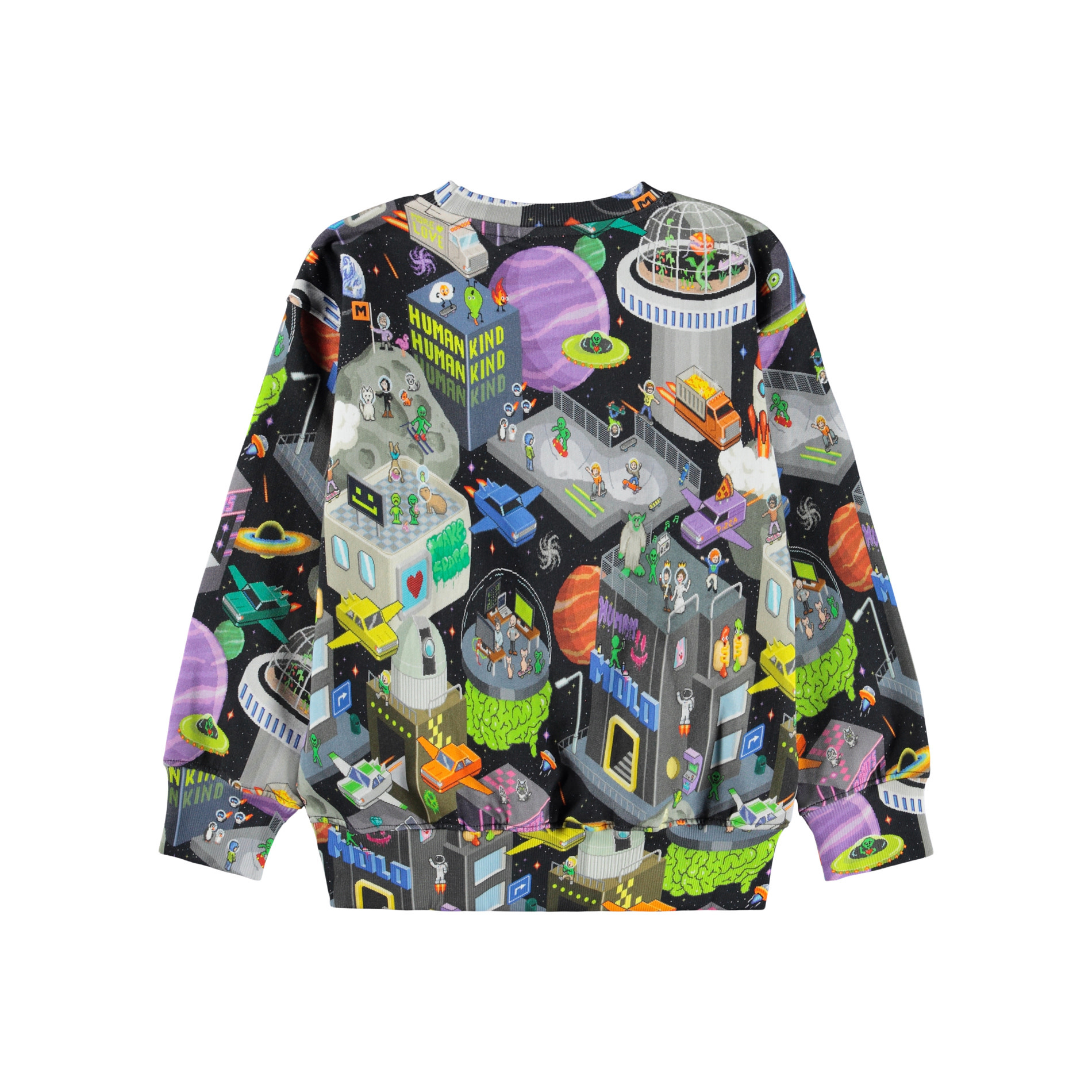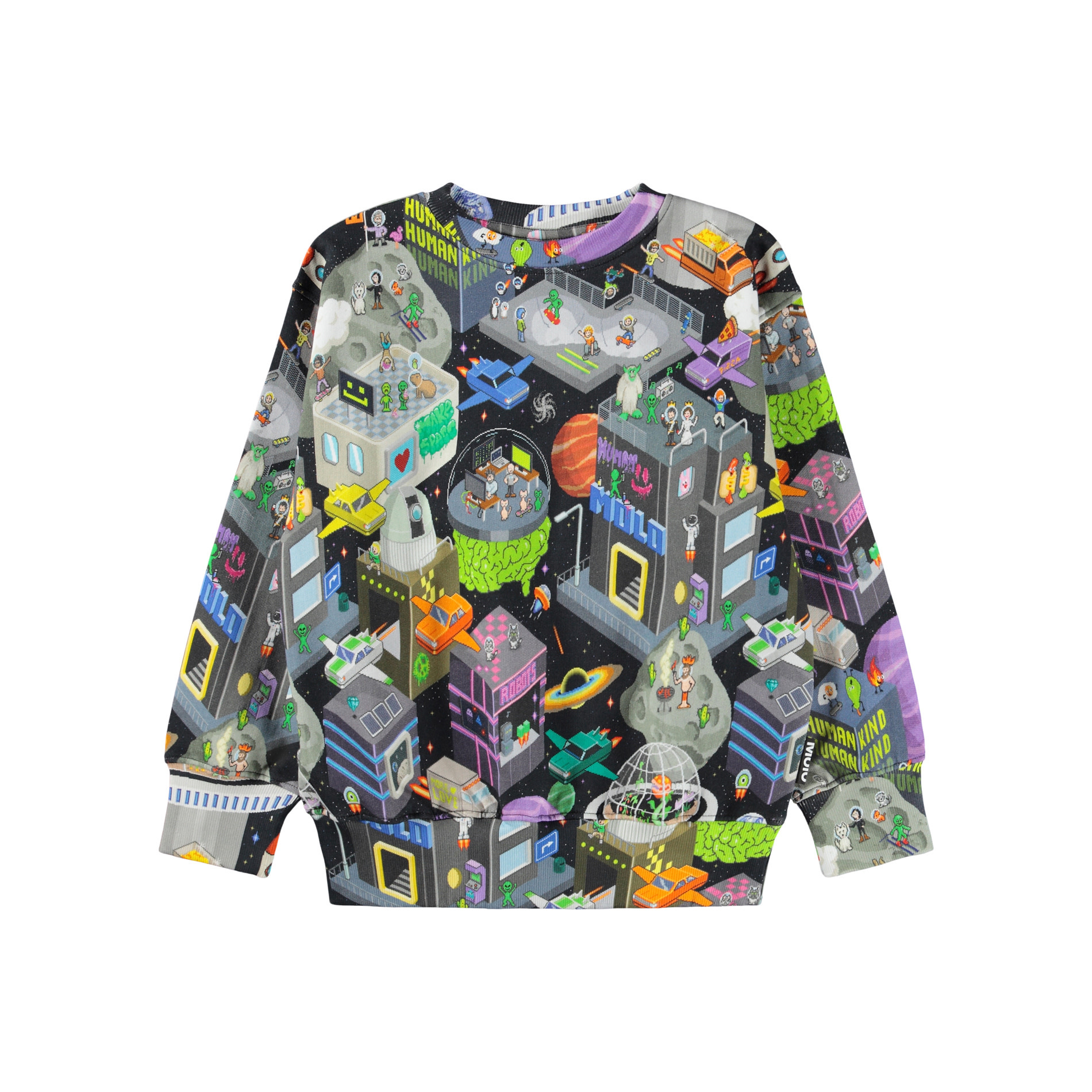 Black sweatshirt made of soft 100% organic cotton with ribbed edges around the neck, sleeves and waist . The sweatshirt has a regular fit and a pixelated computer game-inspired print.
