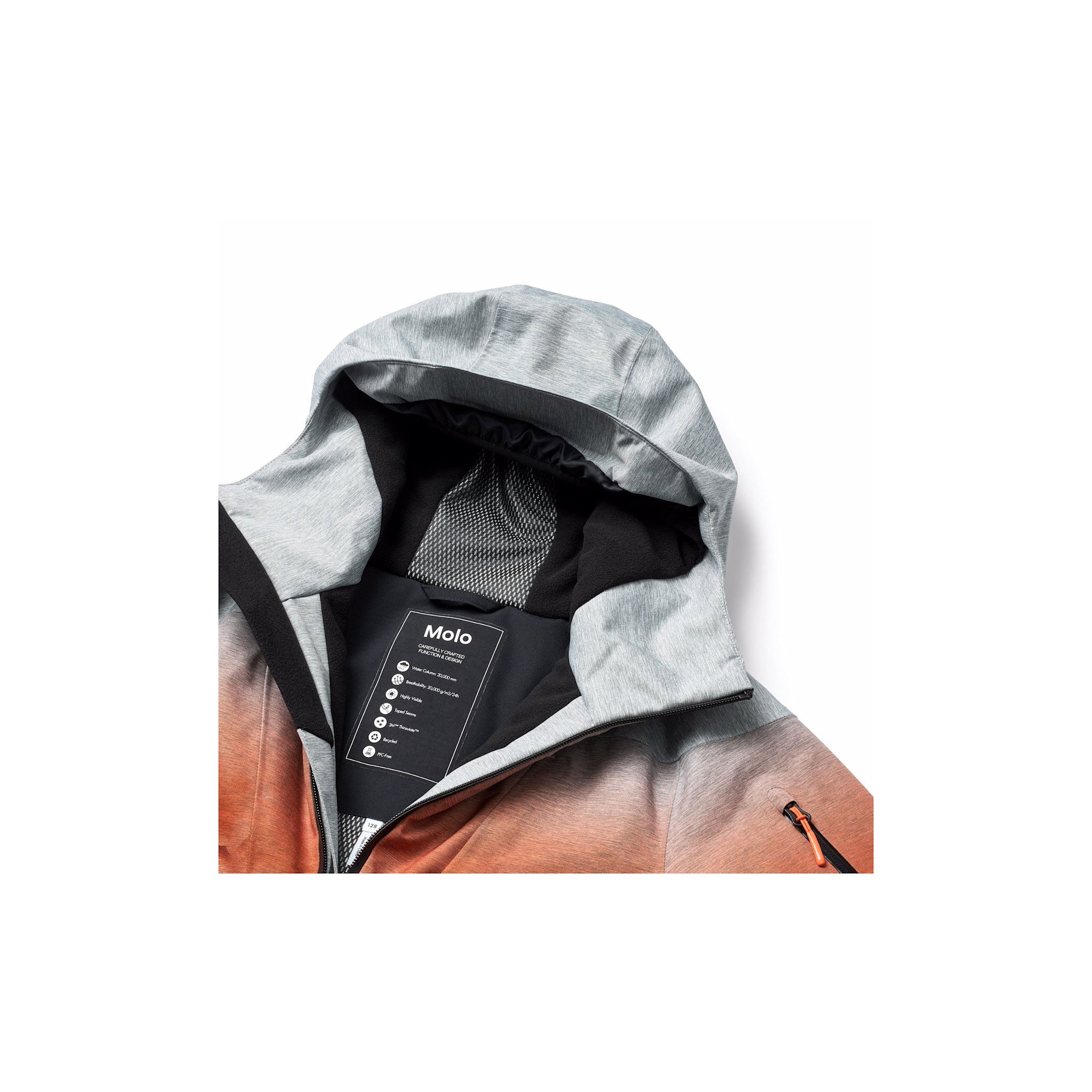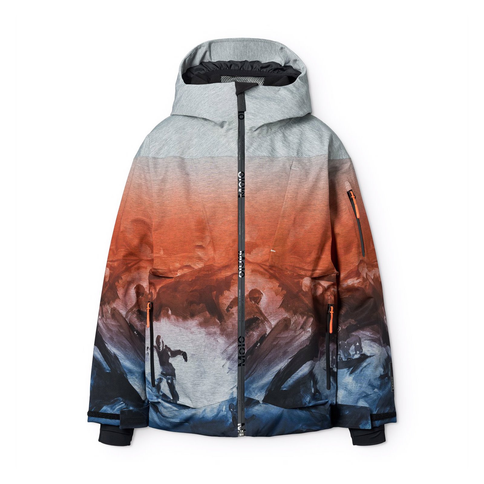 Wind and waterproof winter jacket with a print in grey, orange and blue colors of a snowboarder in the Alps.The jacket has a lined hood, waterproof zippers, a pocket on the sleeve for a ski pass and an interior pocket for extra storage.