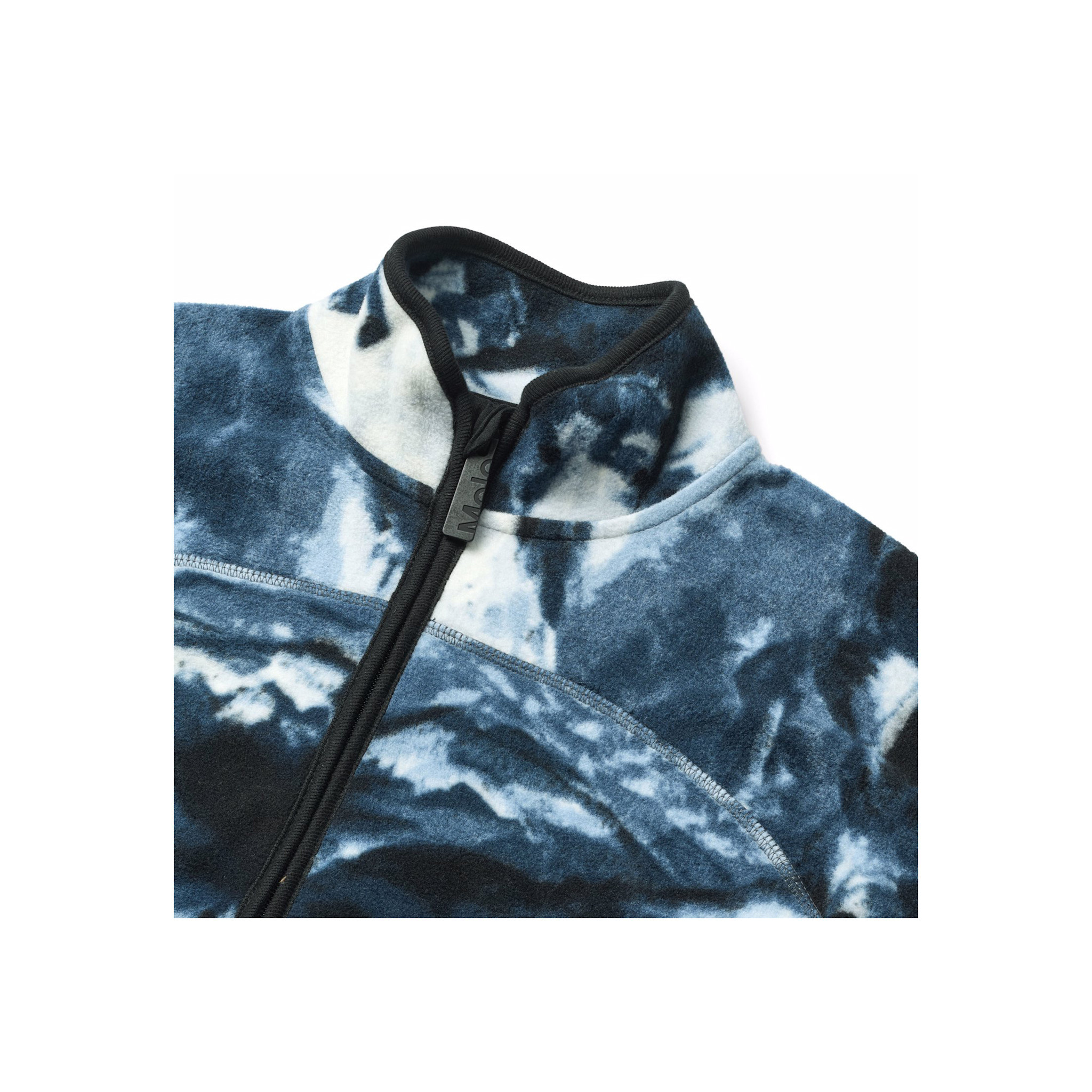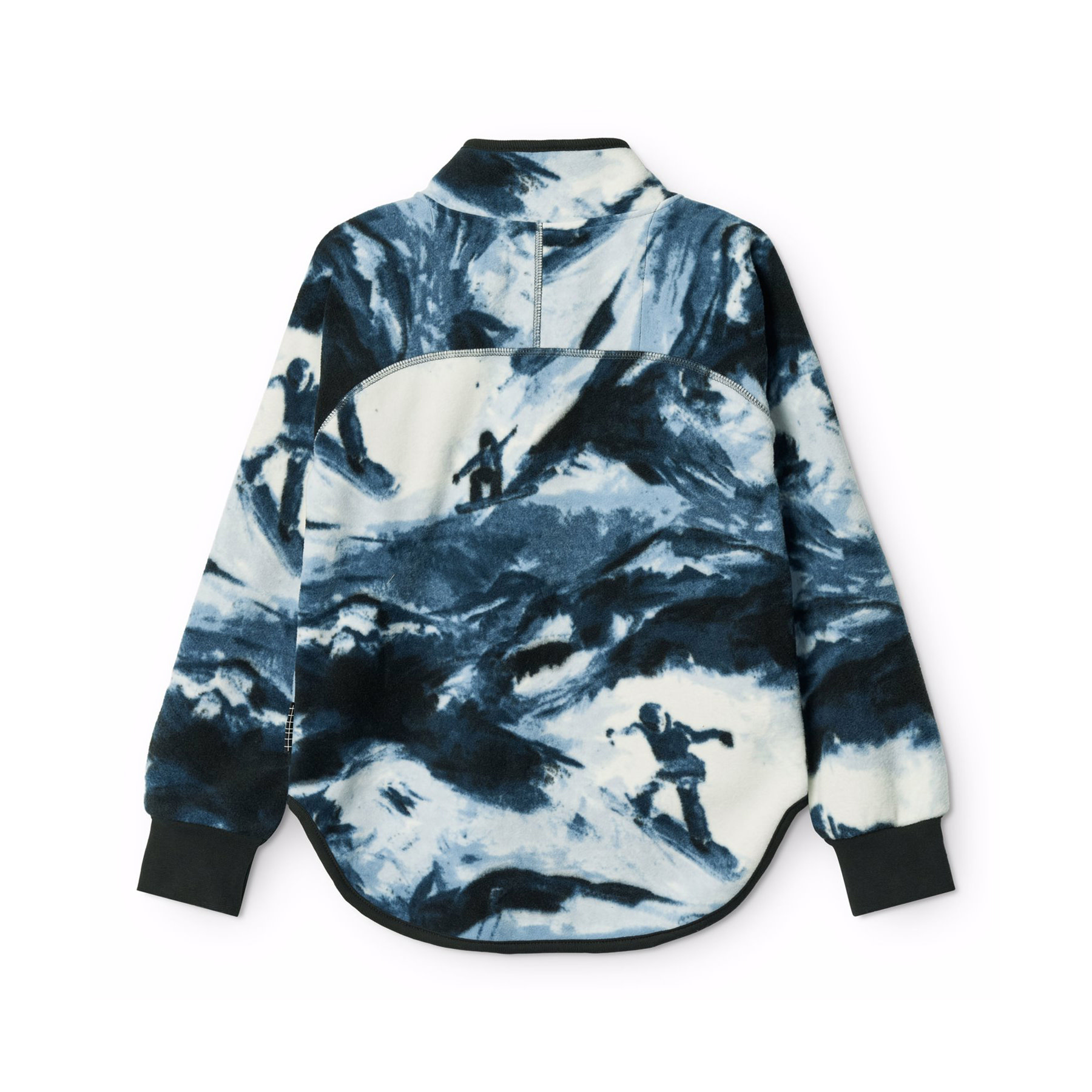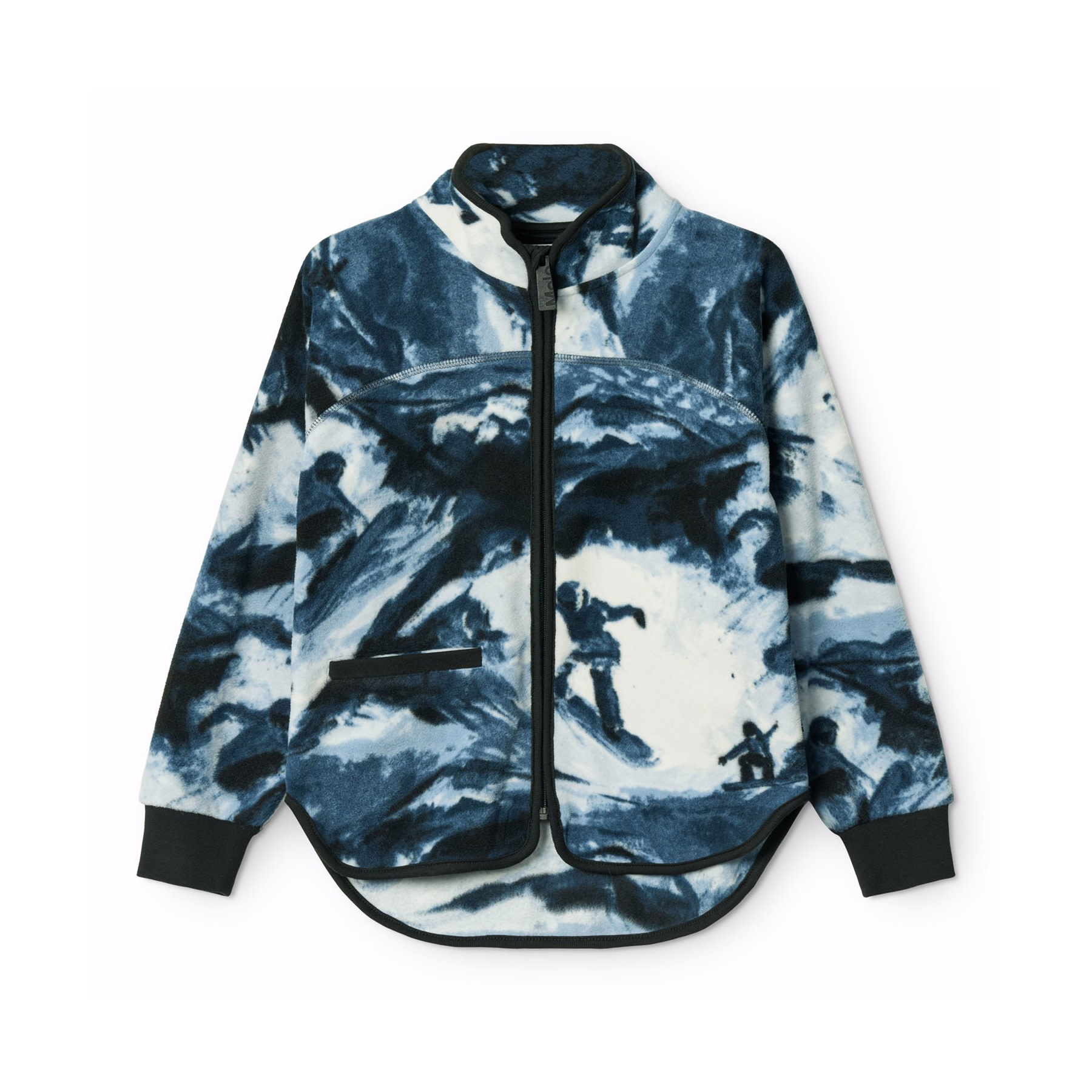 Fleece jacket made of recycled polyester with dark blue ribbed edges & an artistic print of snowboarders in the Alps in blue & white shades. The jacket has a high collar, a front zipper, a front pocket & an extended back cut. It is soft, has a regular fit