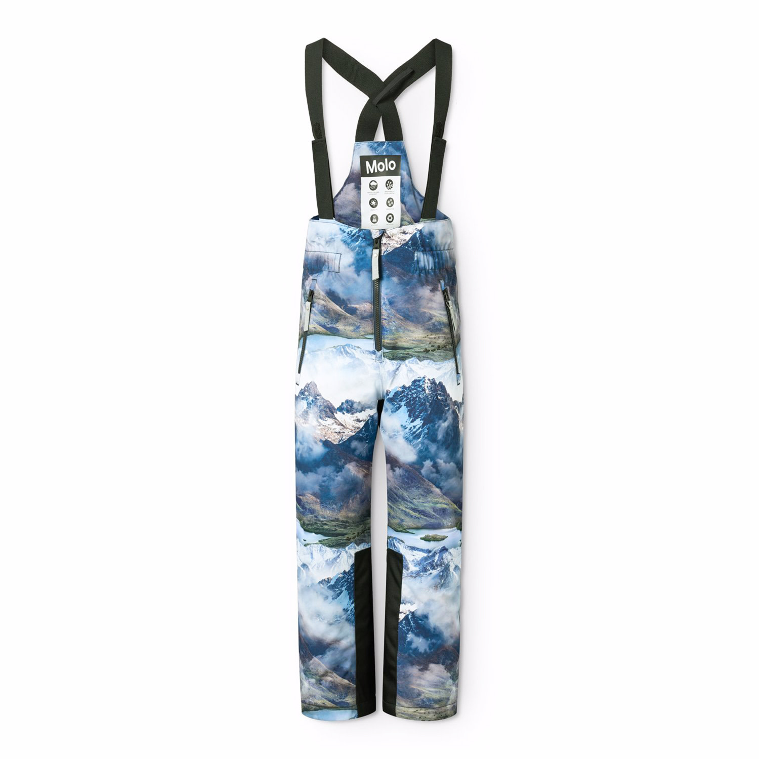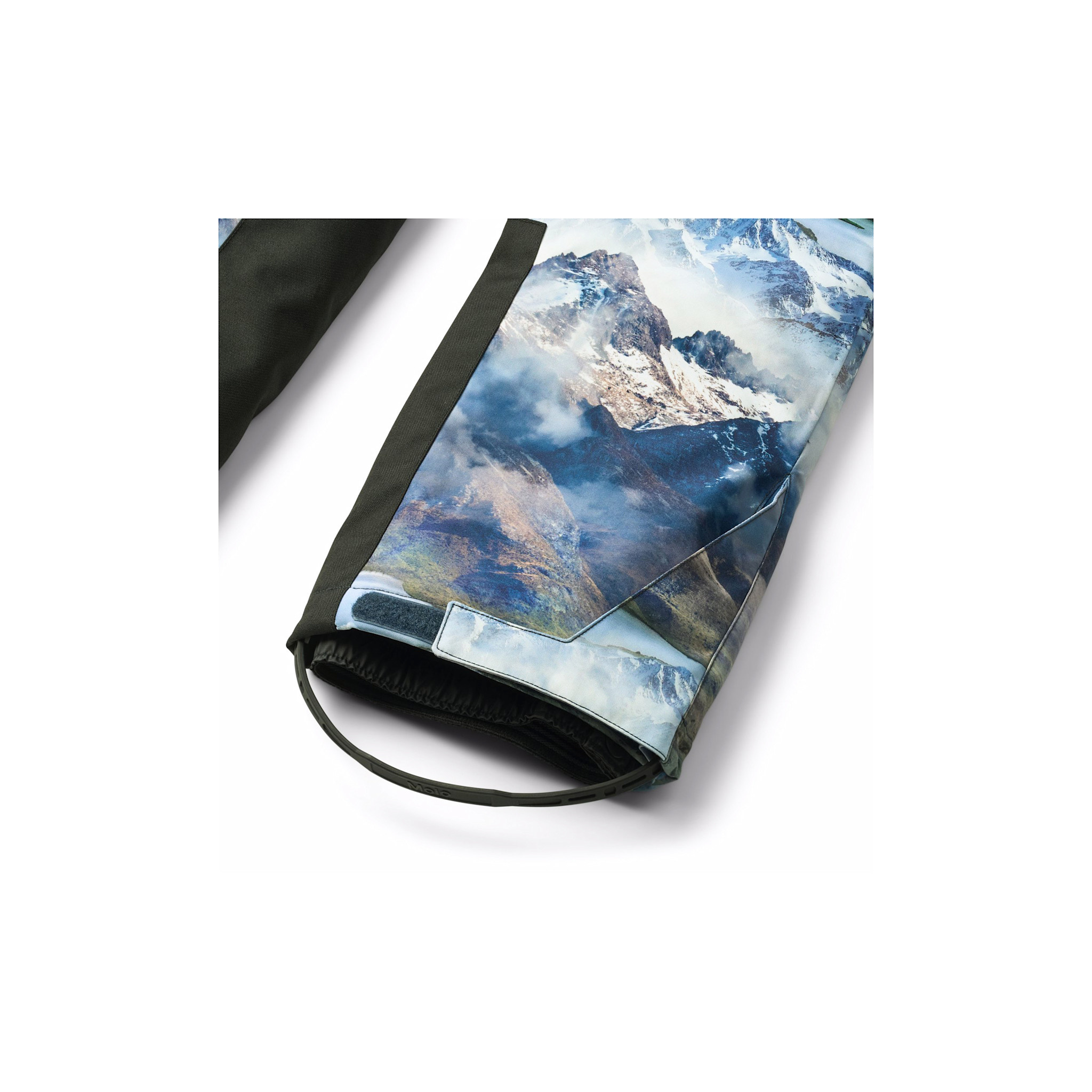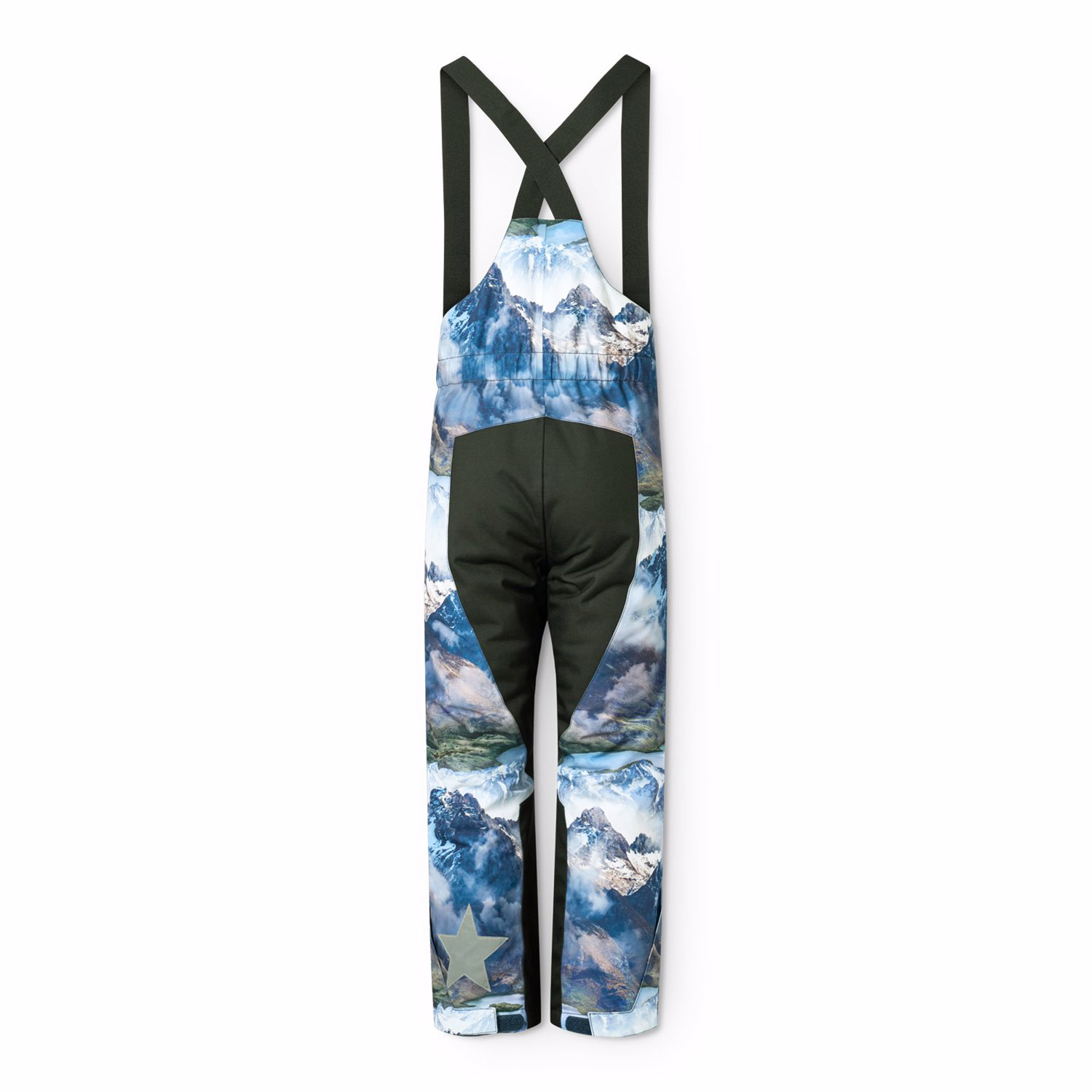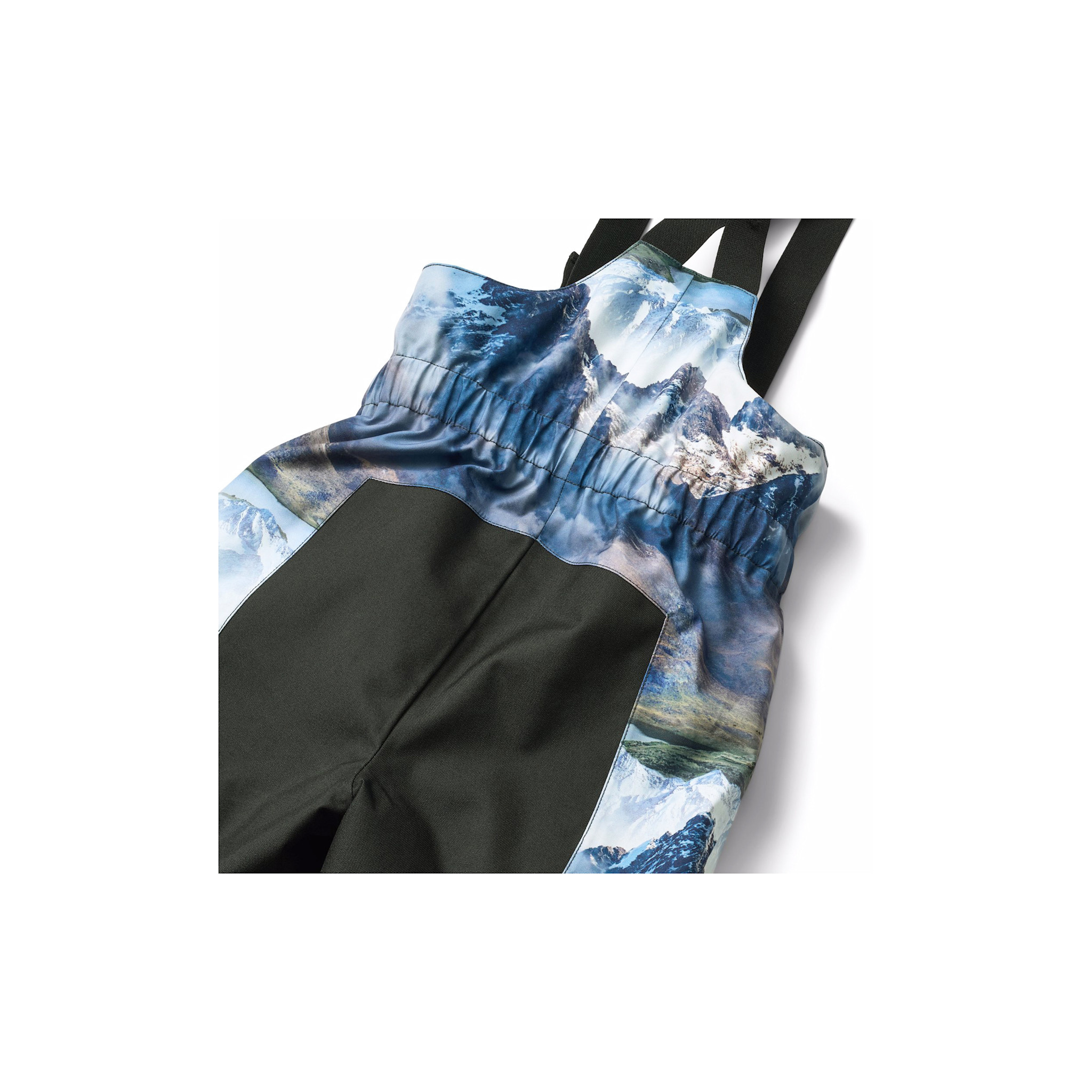 Wind and waterproof ski pants with a landscape print showing snow-capped mountain peaks in vivid colors. The ski pants have a high elastic waist, a zipper, adjustable braces, adjustable leg openings with snow gaiters & extra reinforcement between the legs