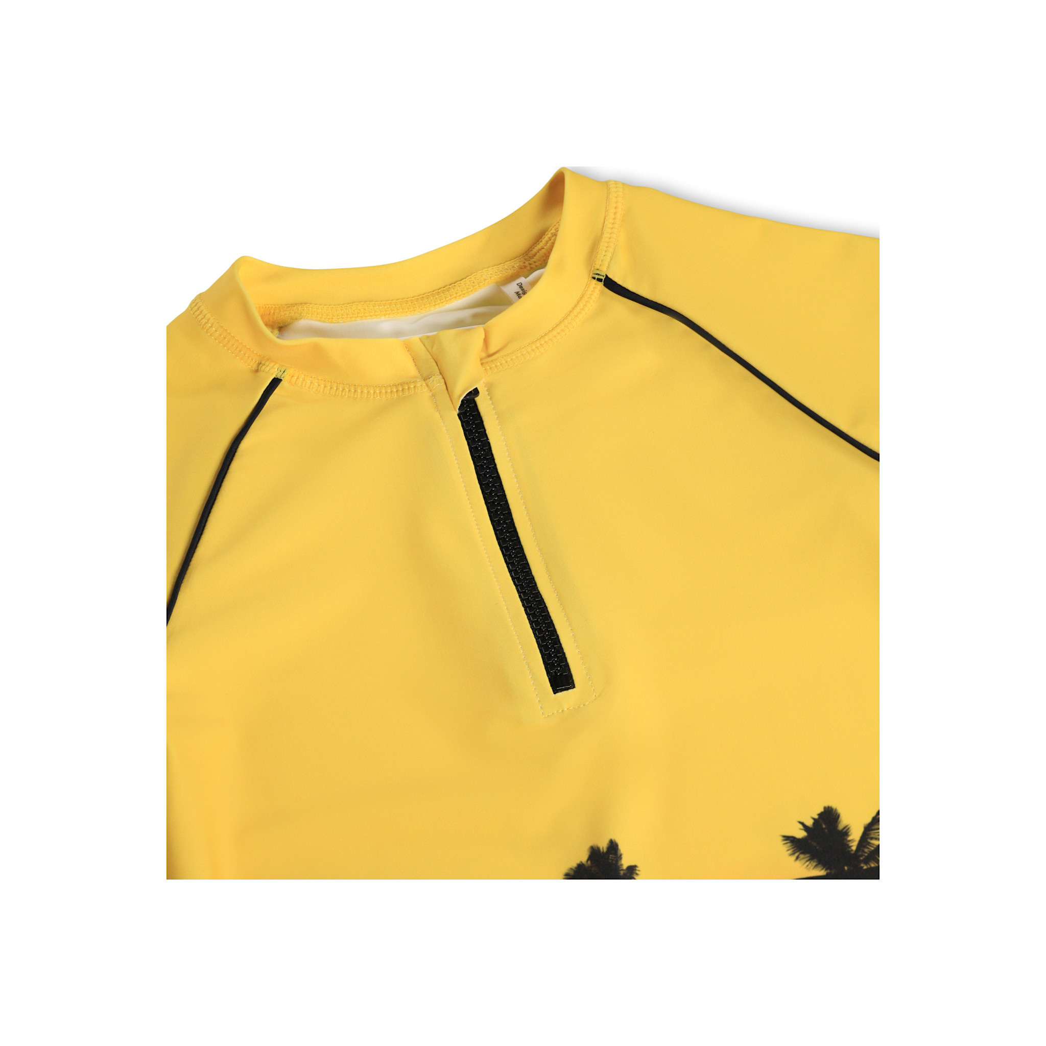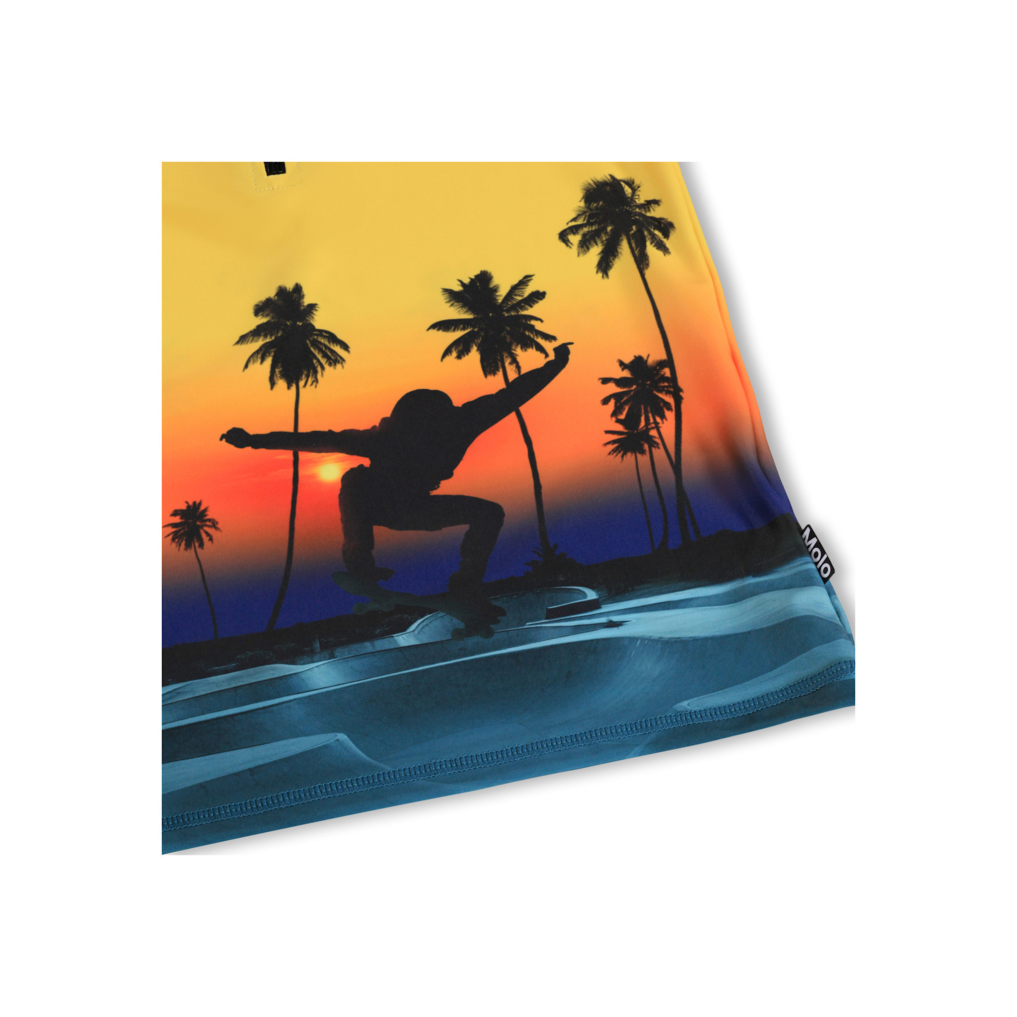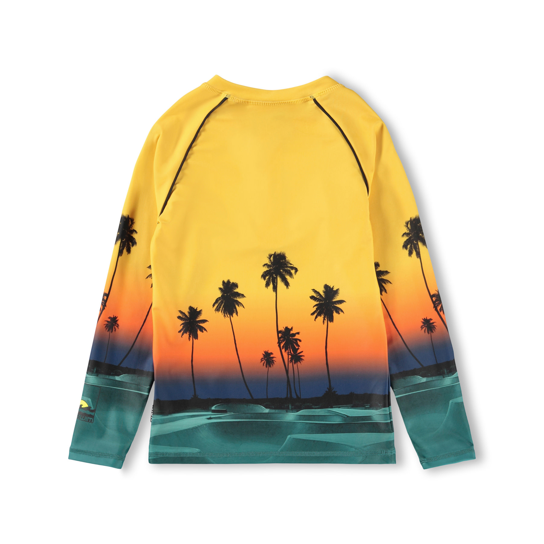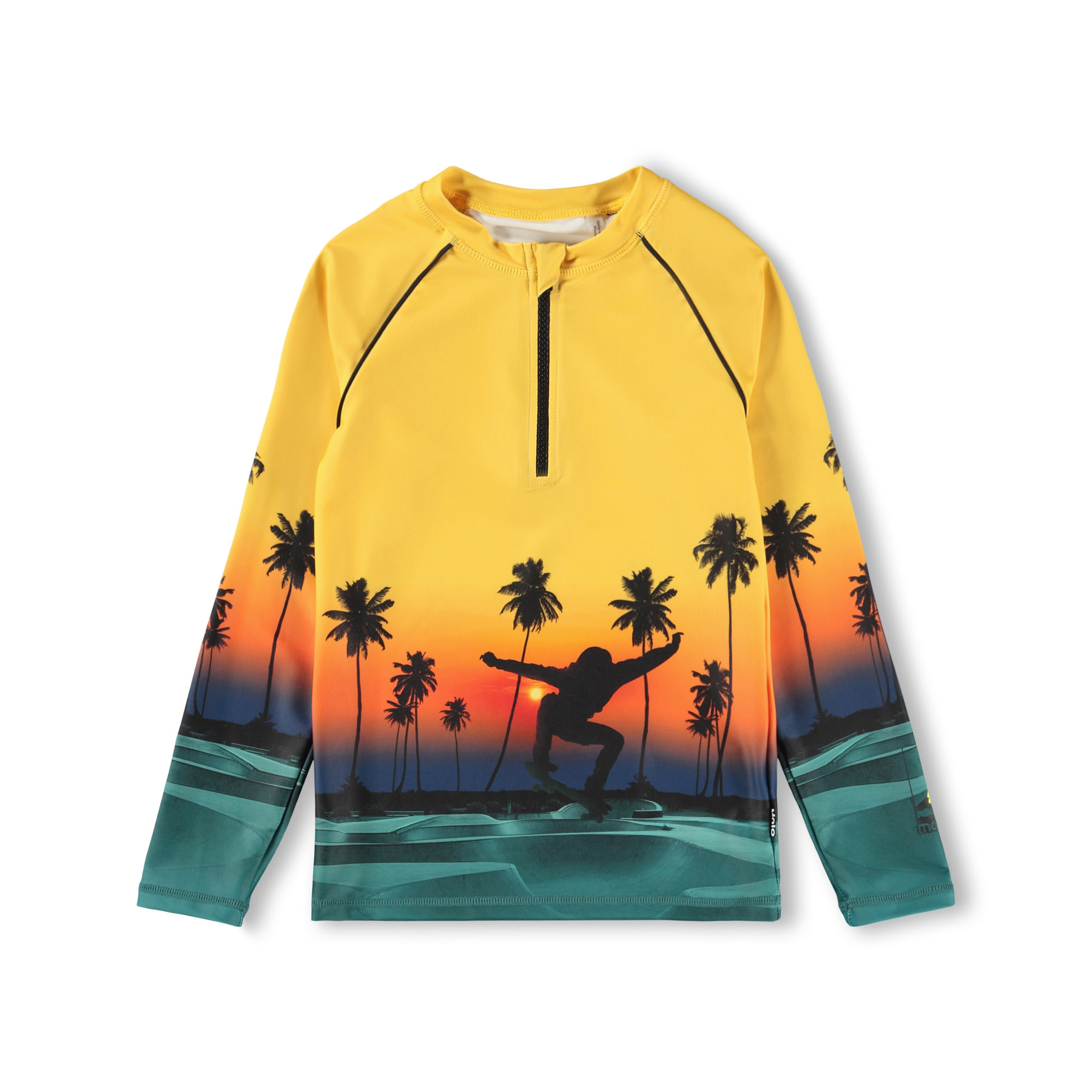 Yellow rash guard for active children with UV protection 50+. It is in a colorful print of a sunset skater. The rashguard has a close fit, stand-up collar, front zip closure, and long raglan sleeves. It is comfortable to wear in the stretchy material.