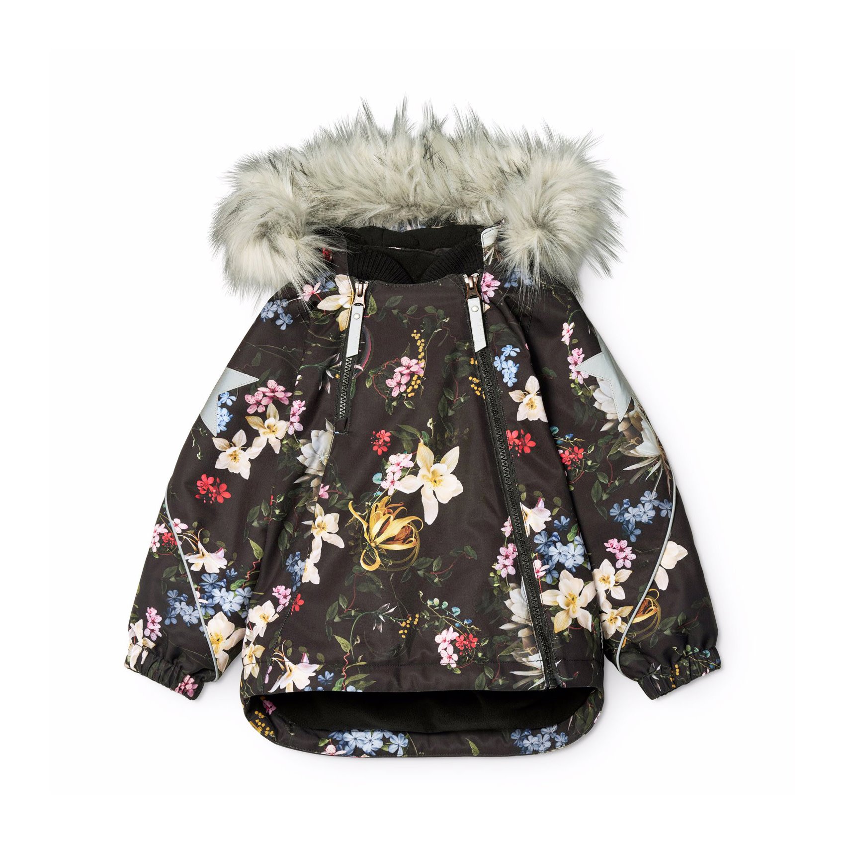 Black wind and waterproof winter jacket made of recycled polyester with a print of colourful flowers. The jacket has a detachable lined hood with a detachable faux fur trim, two zippers on the front with an inside flap, and a ribbed chin guard.