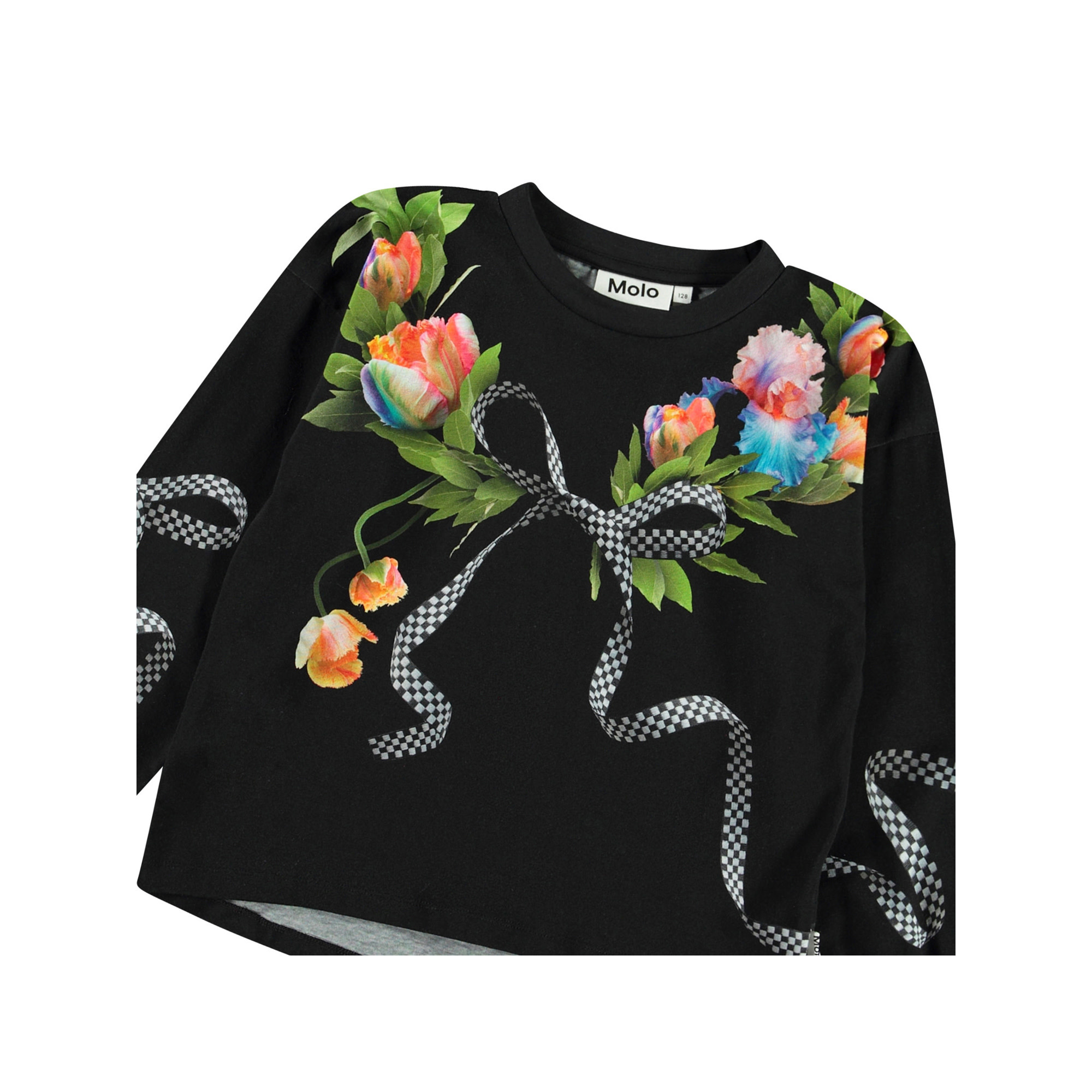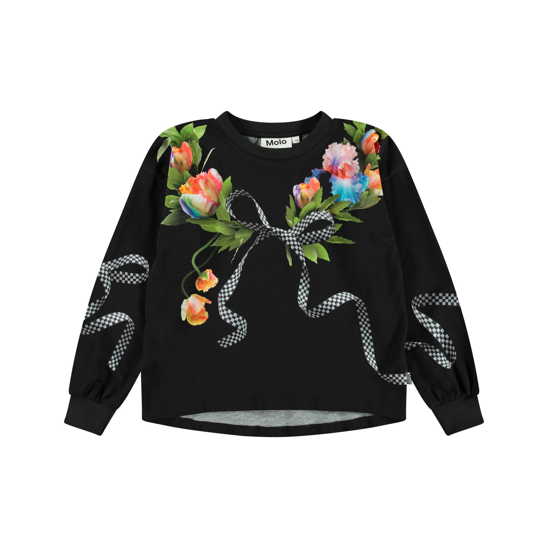 Black sweatshirt in soft organic cotton with a round neck and ribbed cuffs at the wrists and neck. The sweatshirt has a loose fit with a colorful print of artistic tulips and bows tied in checkered ribbons. 95% Organic cotton/ 5% Elastane.