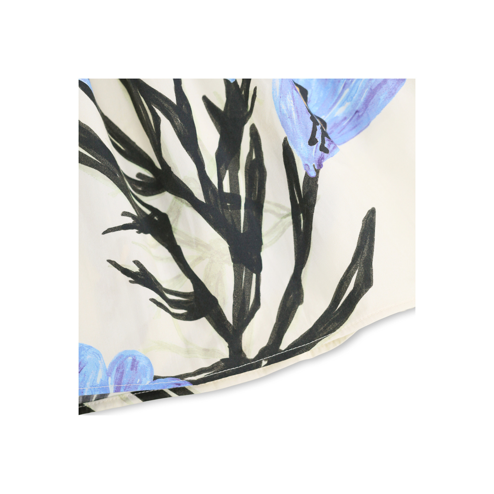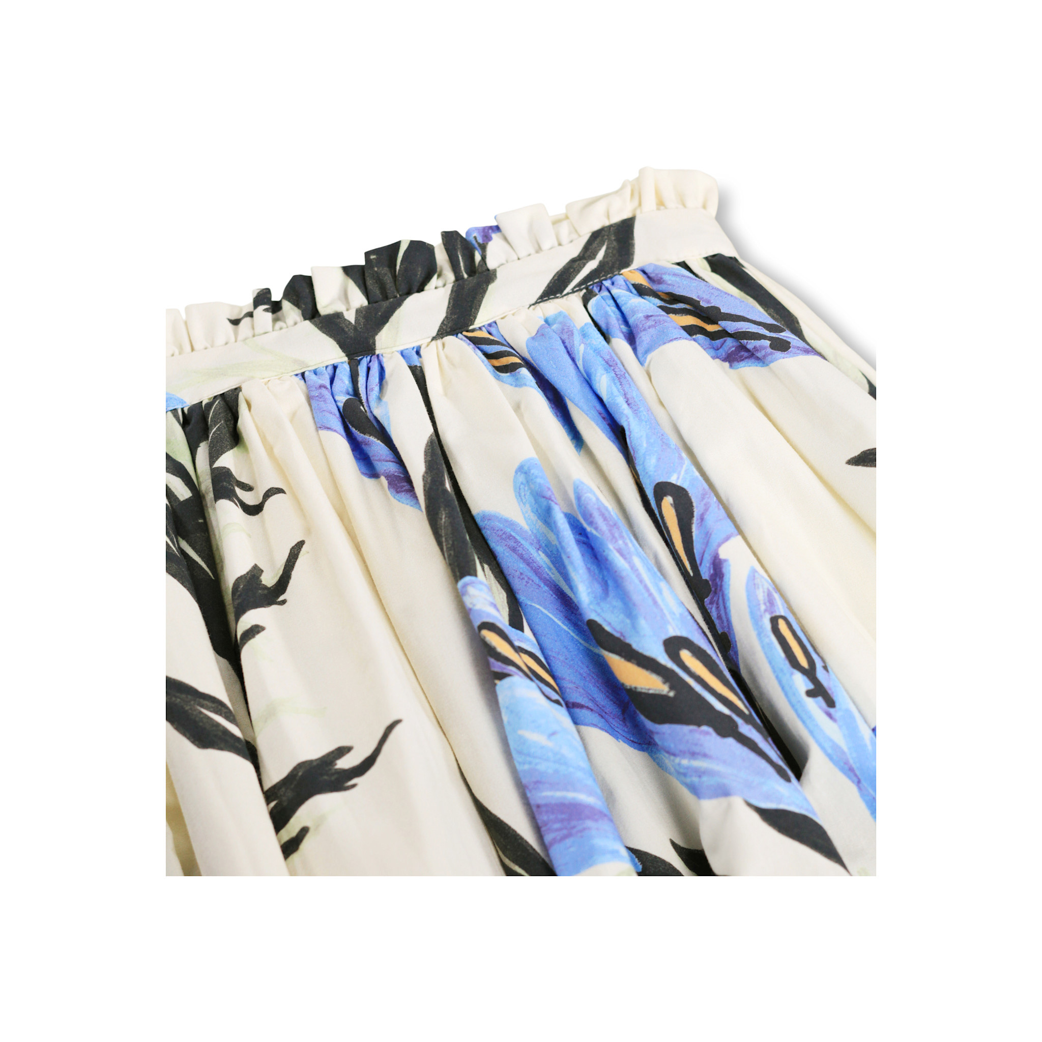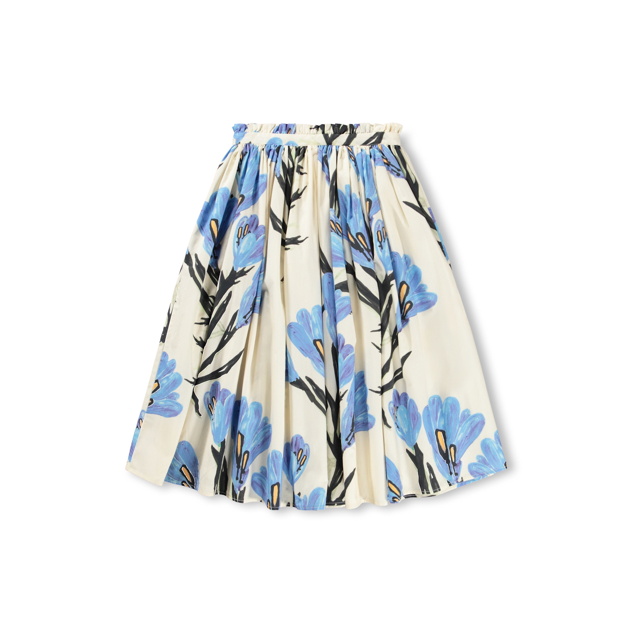 Knee-length skirt made of soft 100% organic cotton poplin with a beautiful print of blue flowers. The skirt has a fixed waistband with a fine, small ruffle edge at the front, while elastic at the back makes it easy to put on and take off.