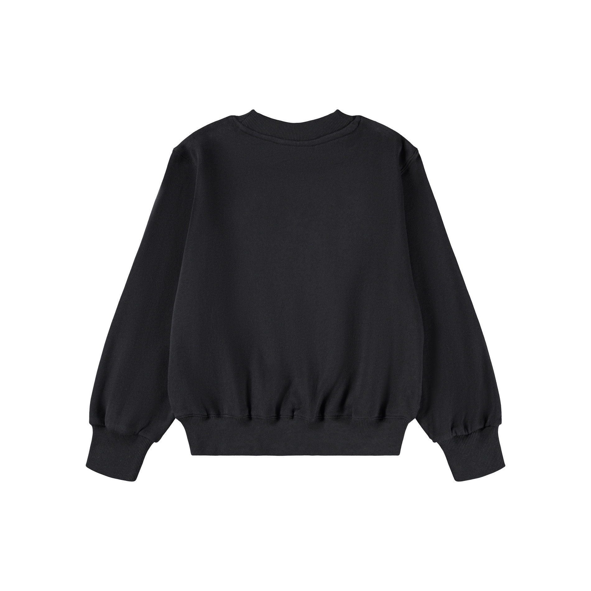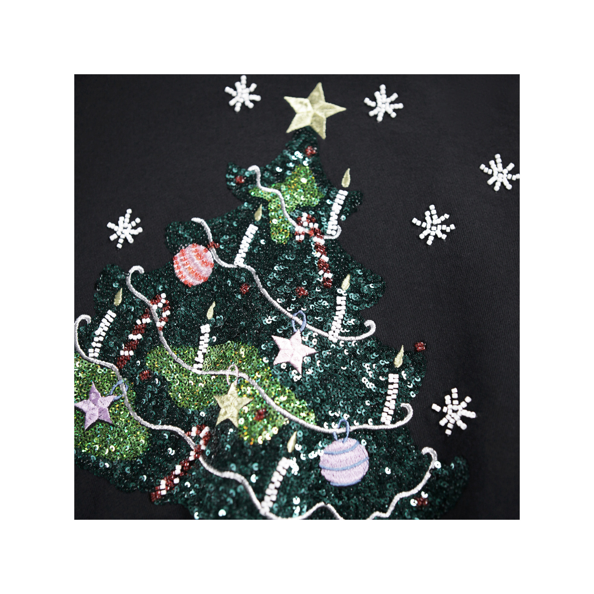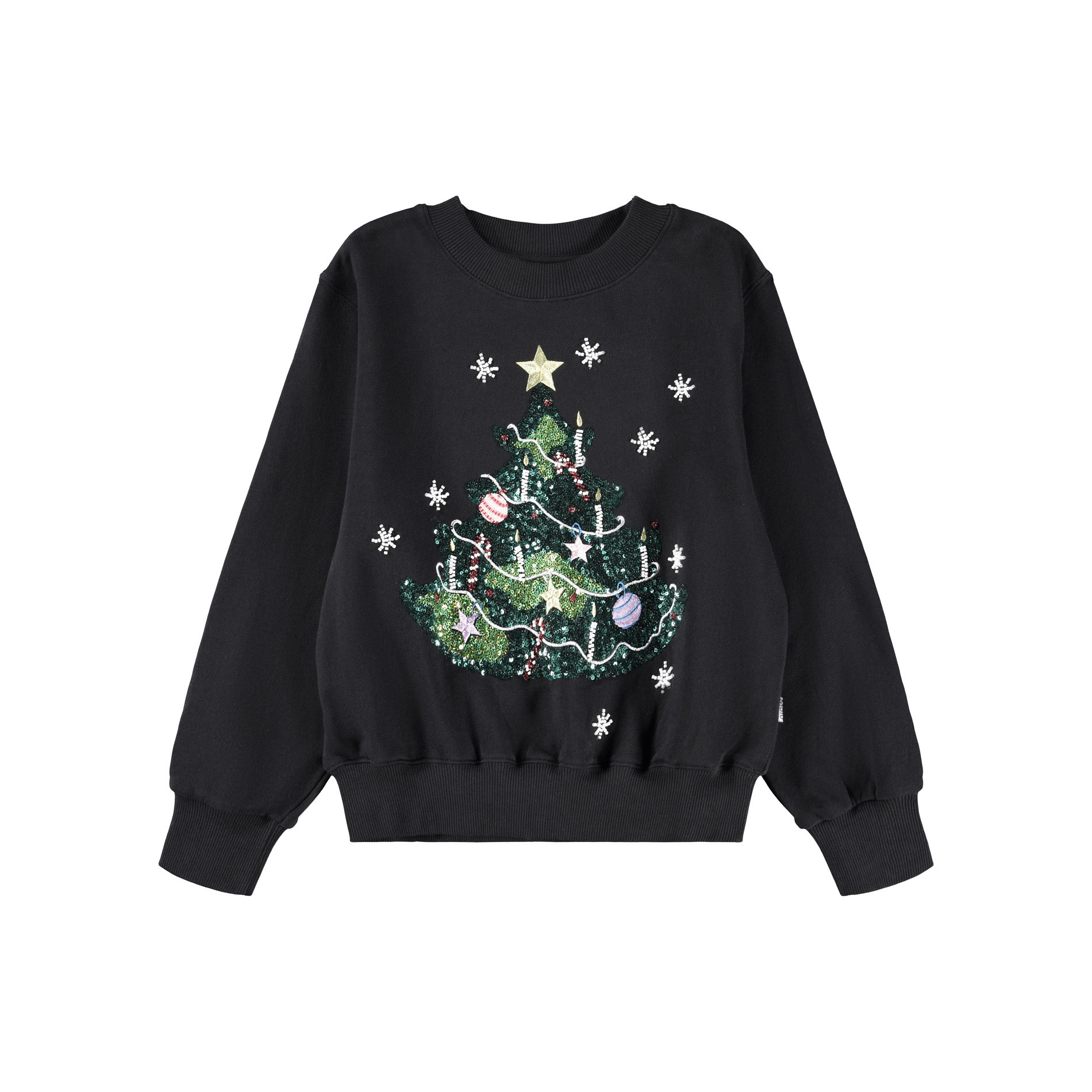 Black sweatshirt made of 100%b organic cotton with a round neck and ribbed edges. The sweatshirt has an oversized fit. On the front, there is an embroidered multicolored sequin Christmas tree.