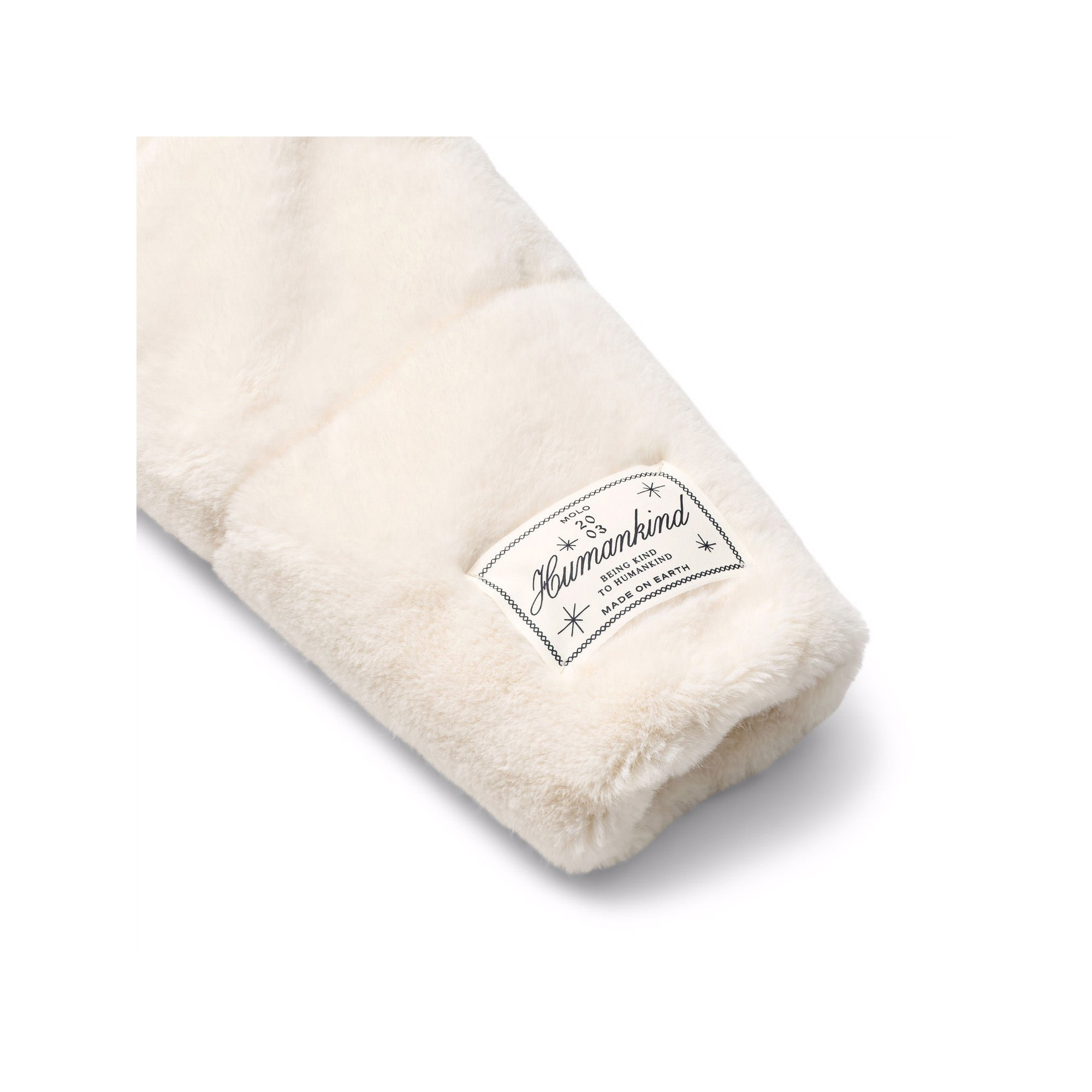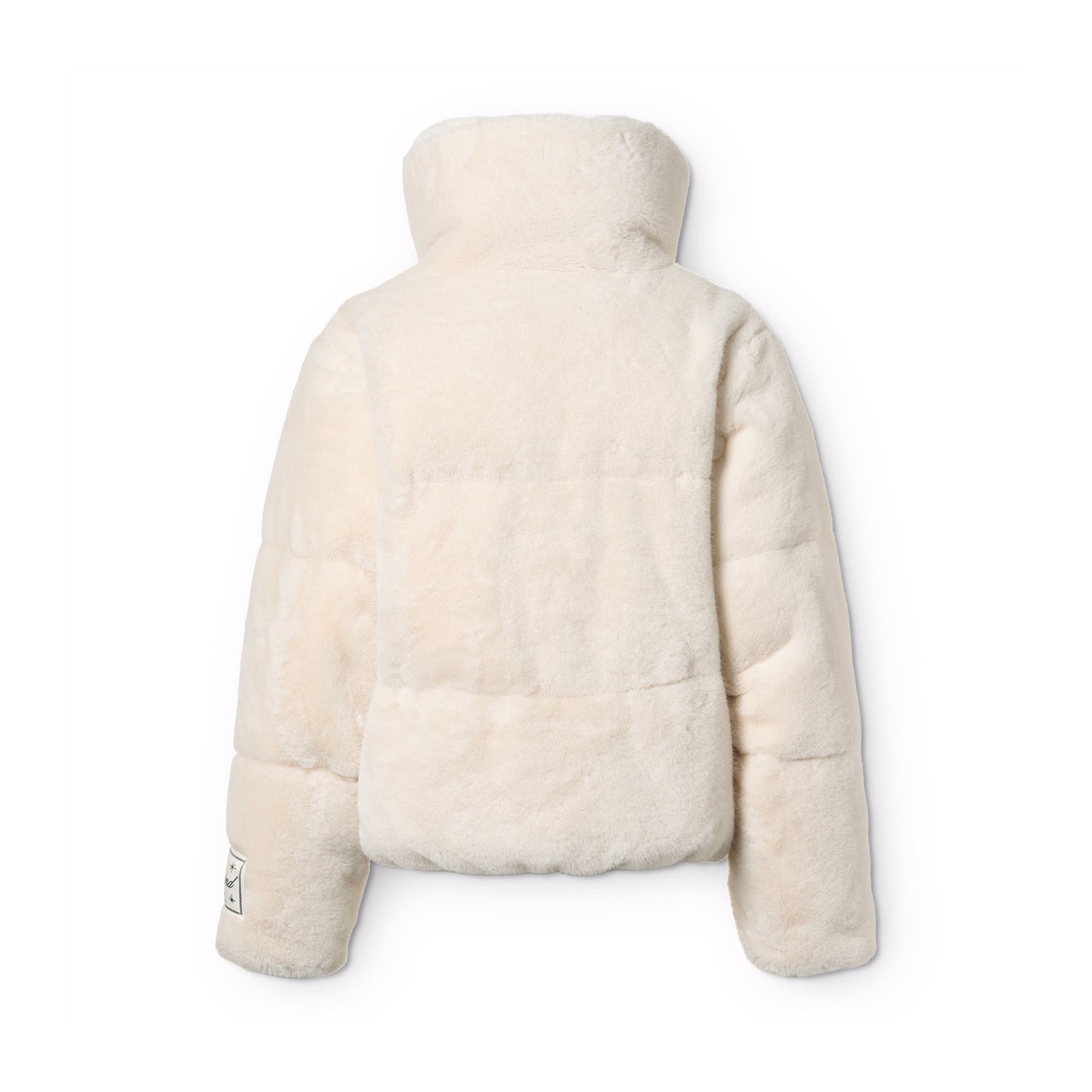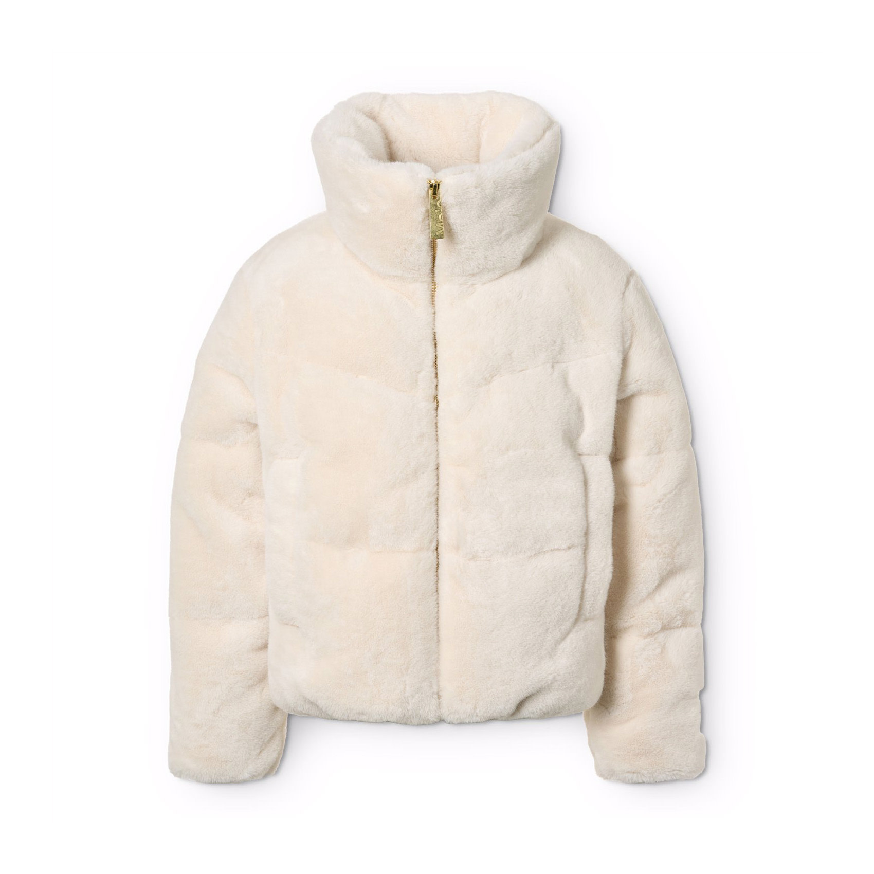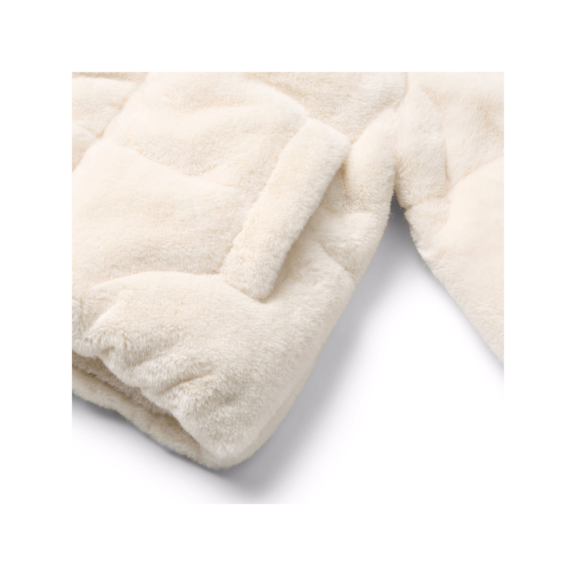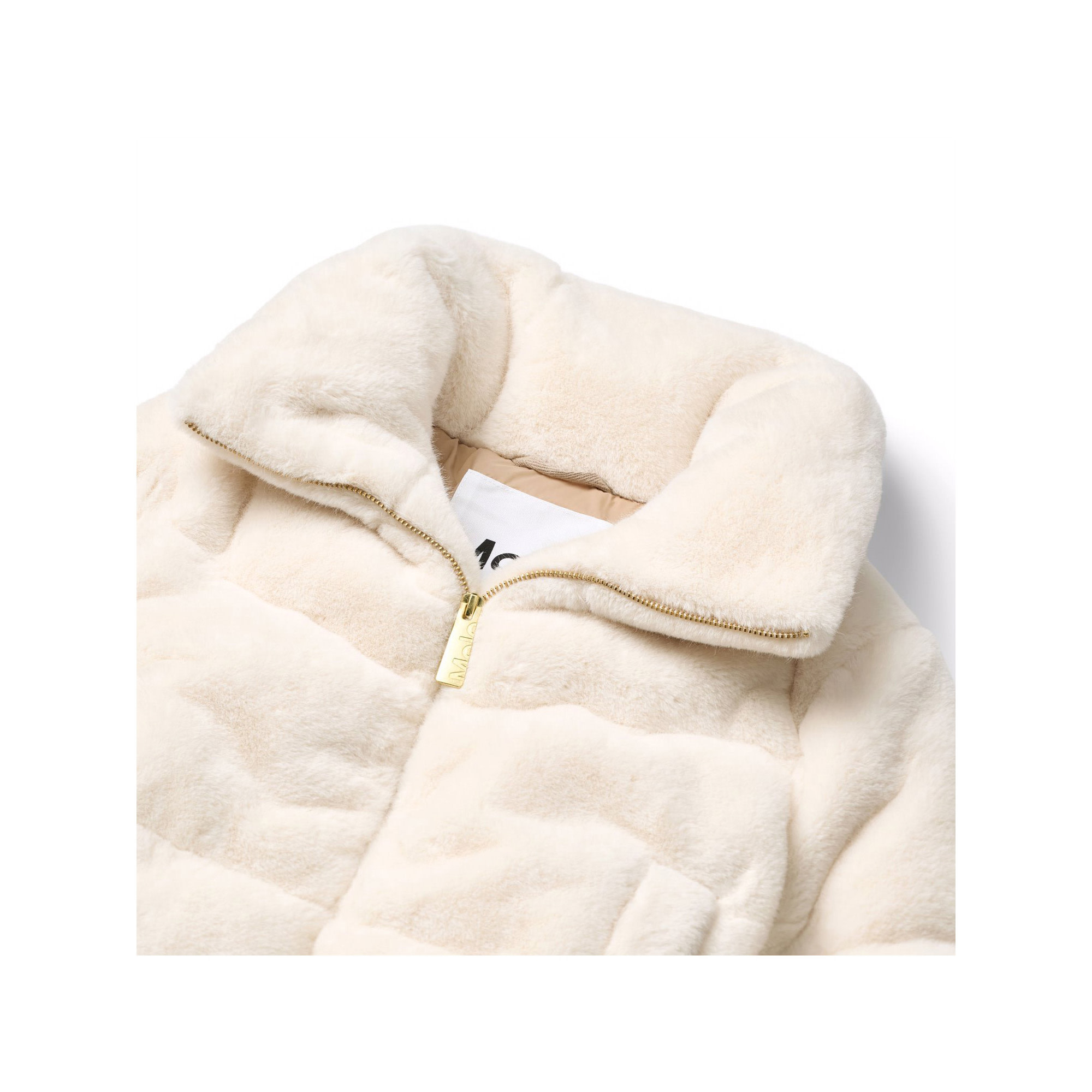 Off white jacket in soft imitation fur. The jacket has a stand-up collar, side pockets, & elastic around the wrists & at the bottom. The jacket has a beige lining & is padded, providing even softness and optimal warmth insulation.