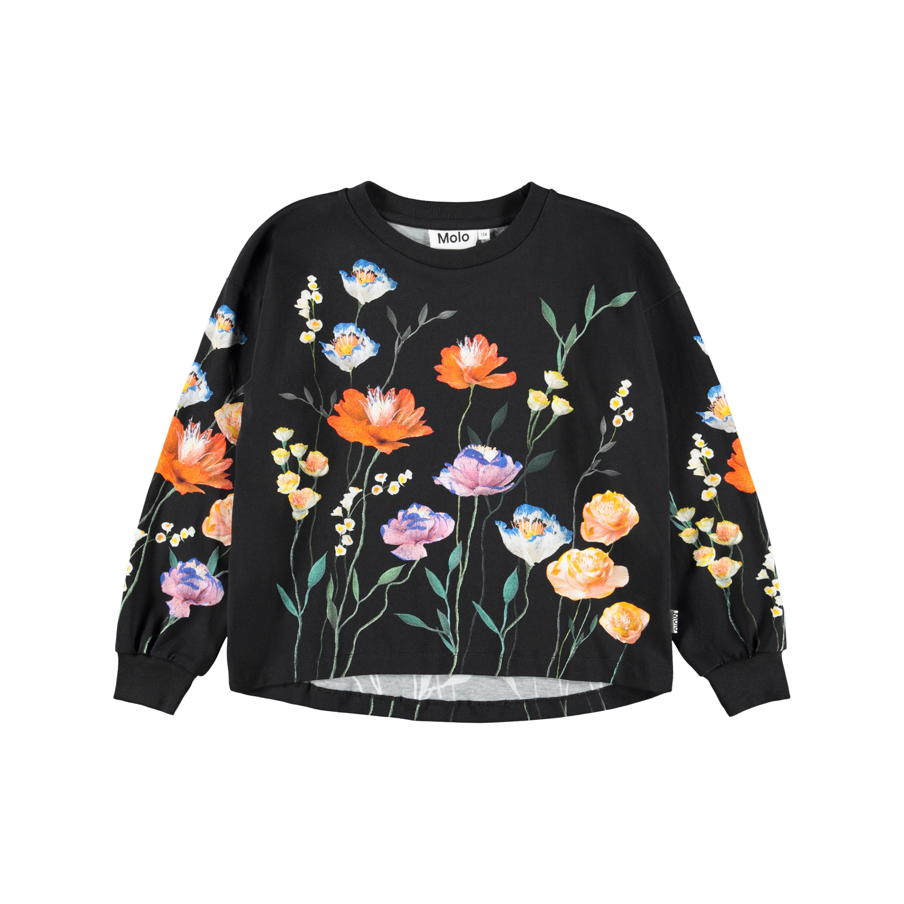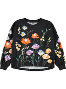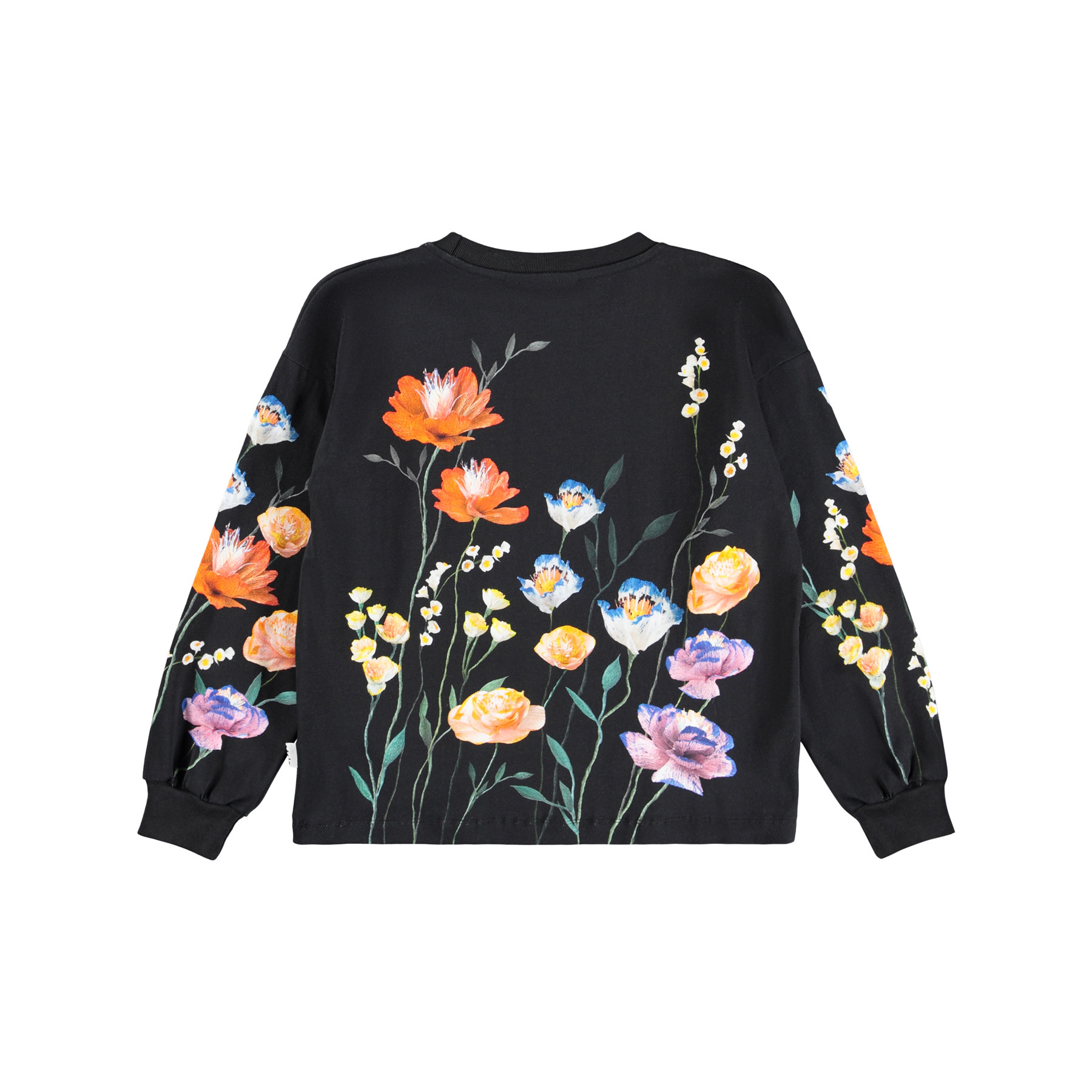 Black long-sleeved top made of soft organic cotton with ribbed cuffs and neckline. The blouse has a loose fit and is longer at the back. The long-sleeved top has a print of colorful paper flowers. 95% Organic cotton/ 5% Elastane.