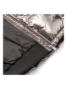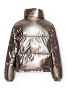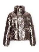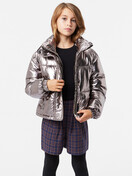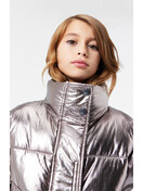 Hansine is a water repellent silver jacket with soft synthetic down filling. It has a high collar with an integrated hood, a zip with a flap to keep out snow, wind, & water. It also has front pockets and elastic cuffs to keep out the wind and retain heat.