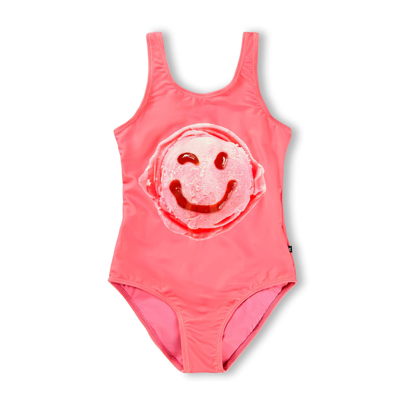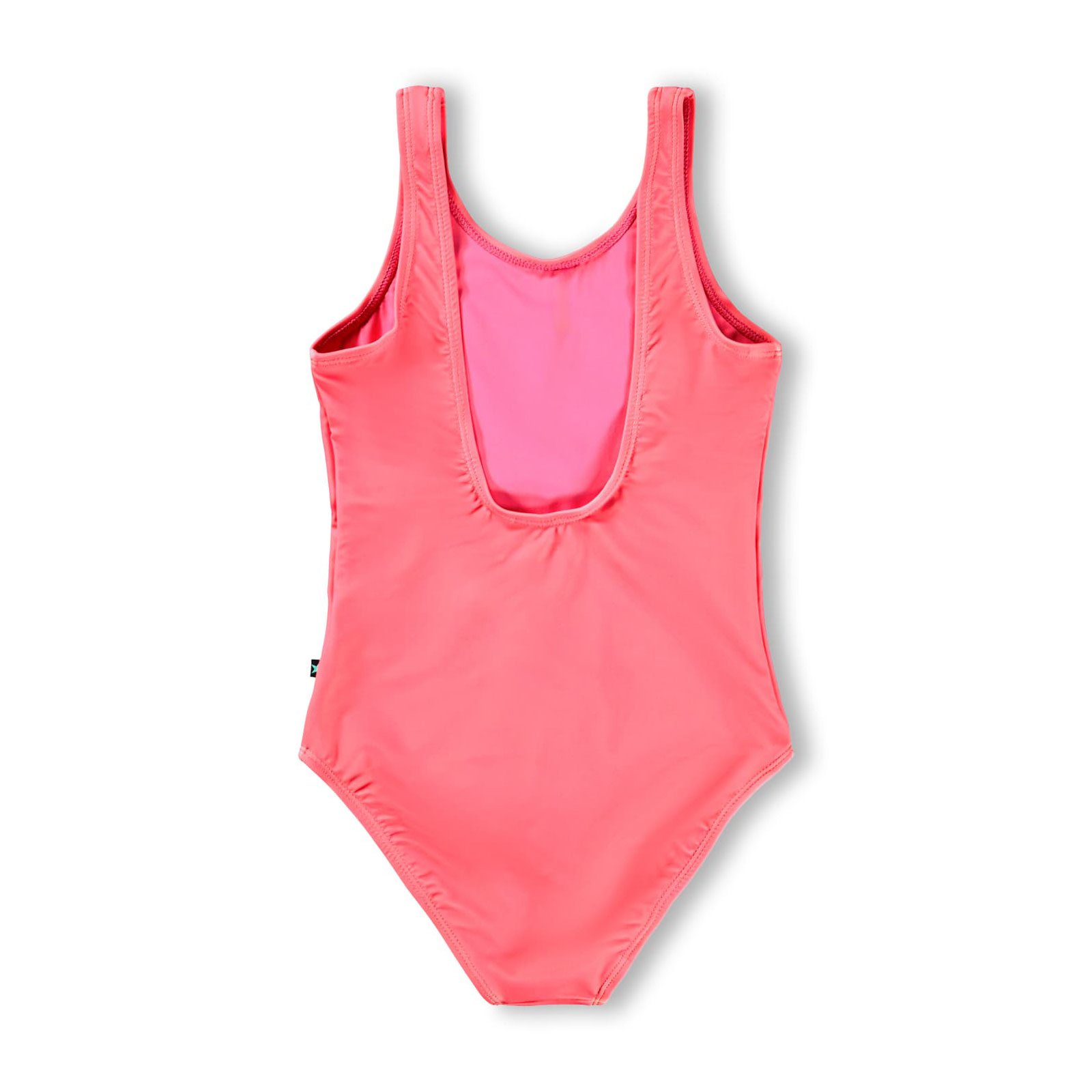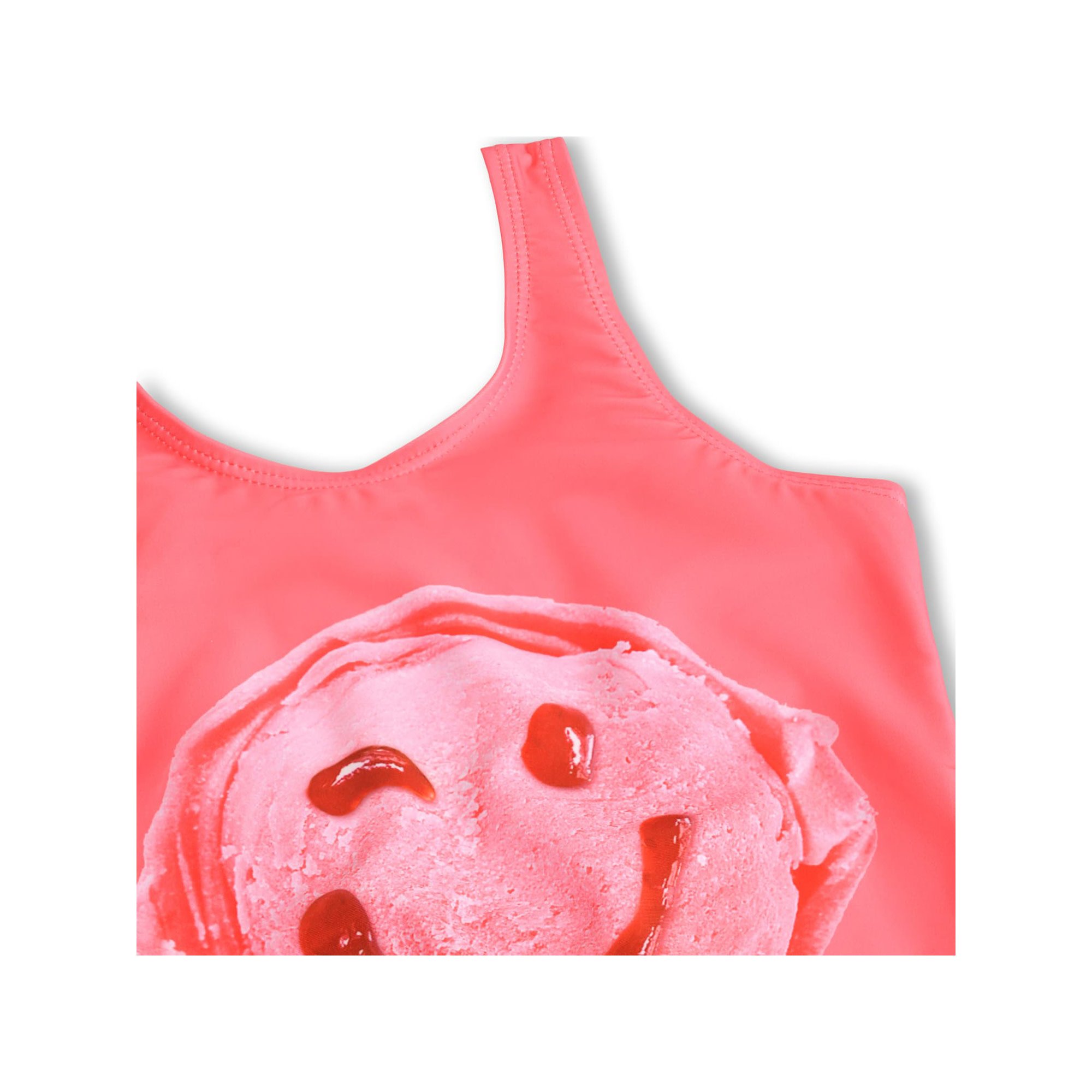 Sporty, pink swimsuit with ice print for active children, made from recycled polyester with UV protection 50+. The swimsuit has a regular fit, is fully lined, has wide straps, and a deep back.